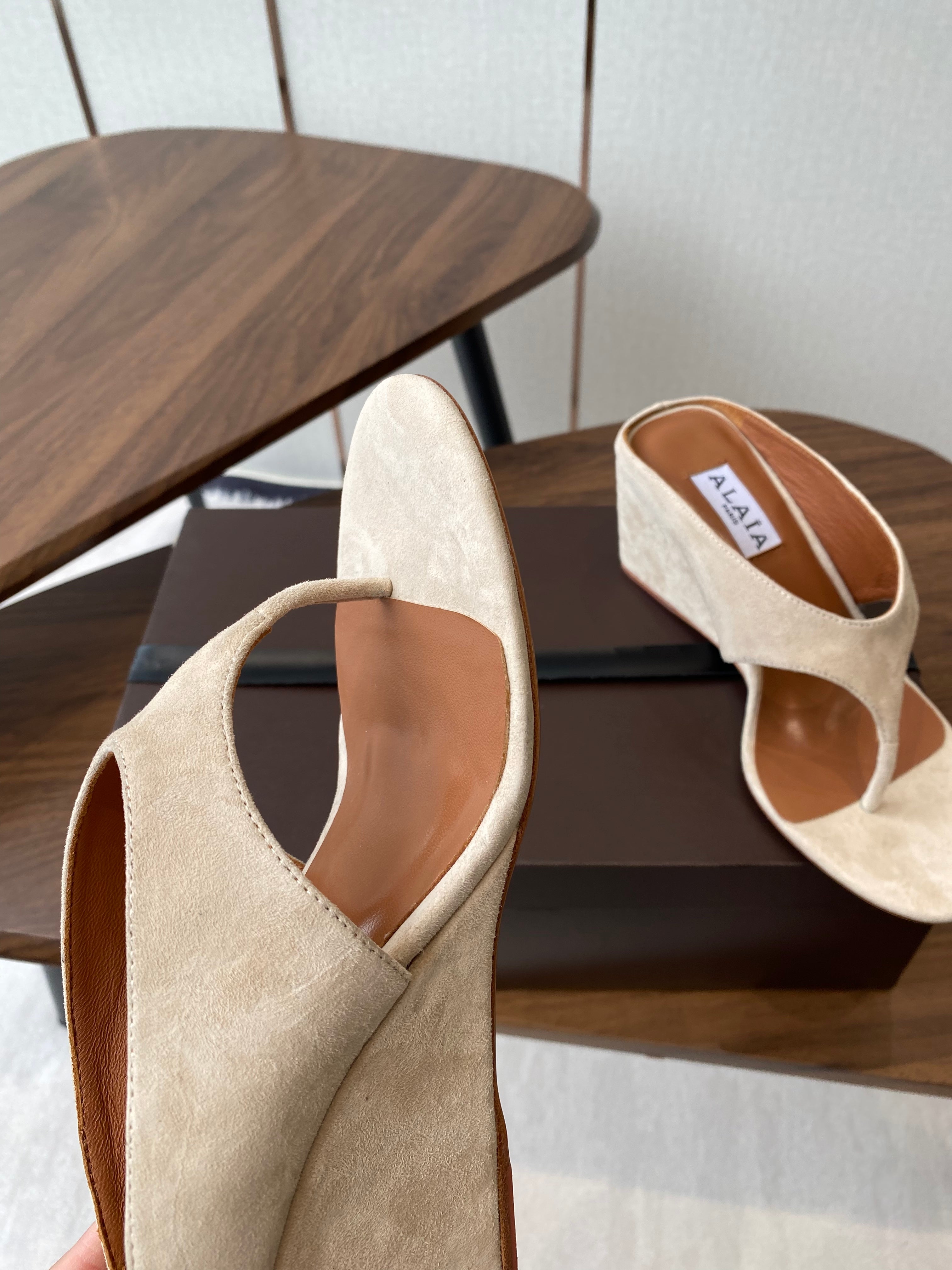 ALAIA WEDGE THONG SANDALS 25S IN LIGHT BEIGE SUEDE