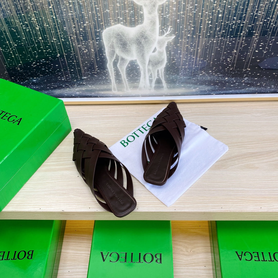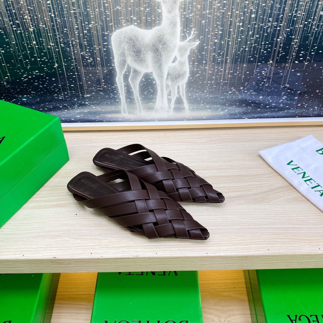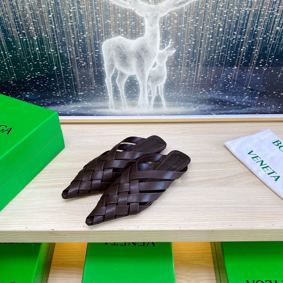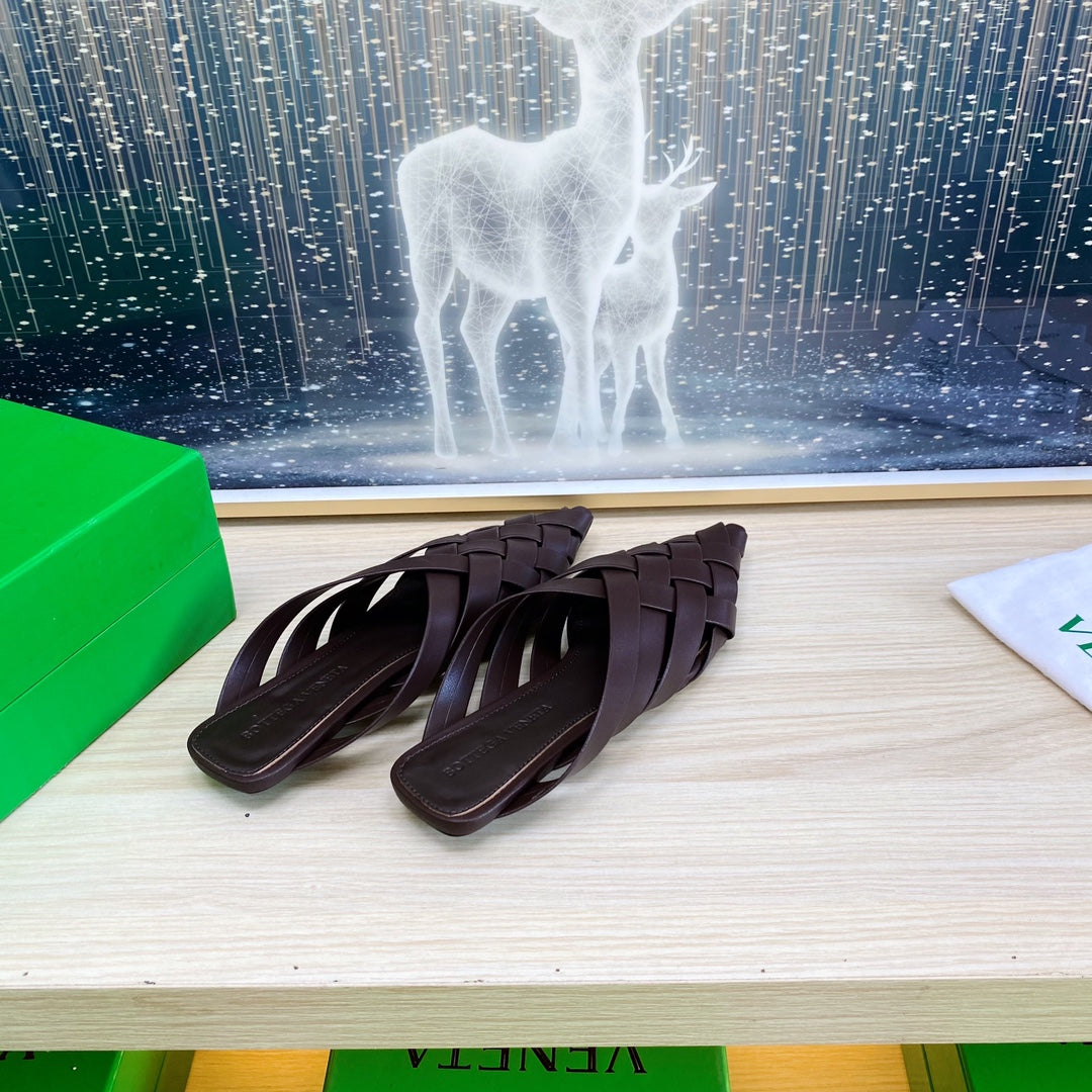 ALFIE LEATHER FLAT MULES IN CHOCOLATE BROWN PATENT CALFSKIN WITH WOVEN DESIGN