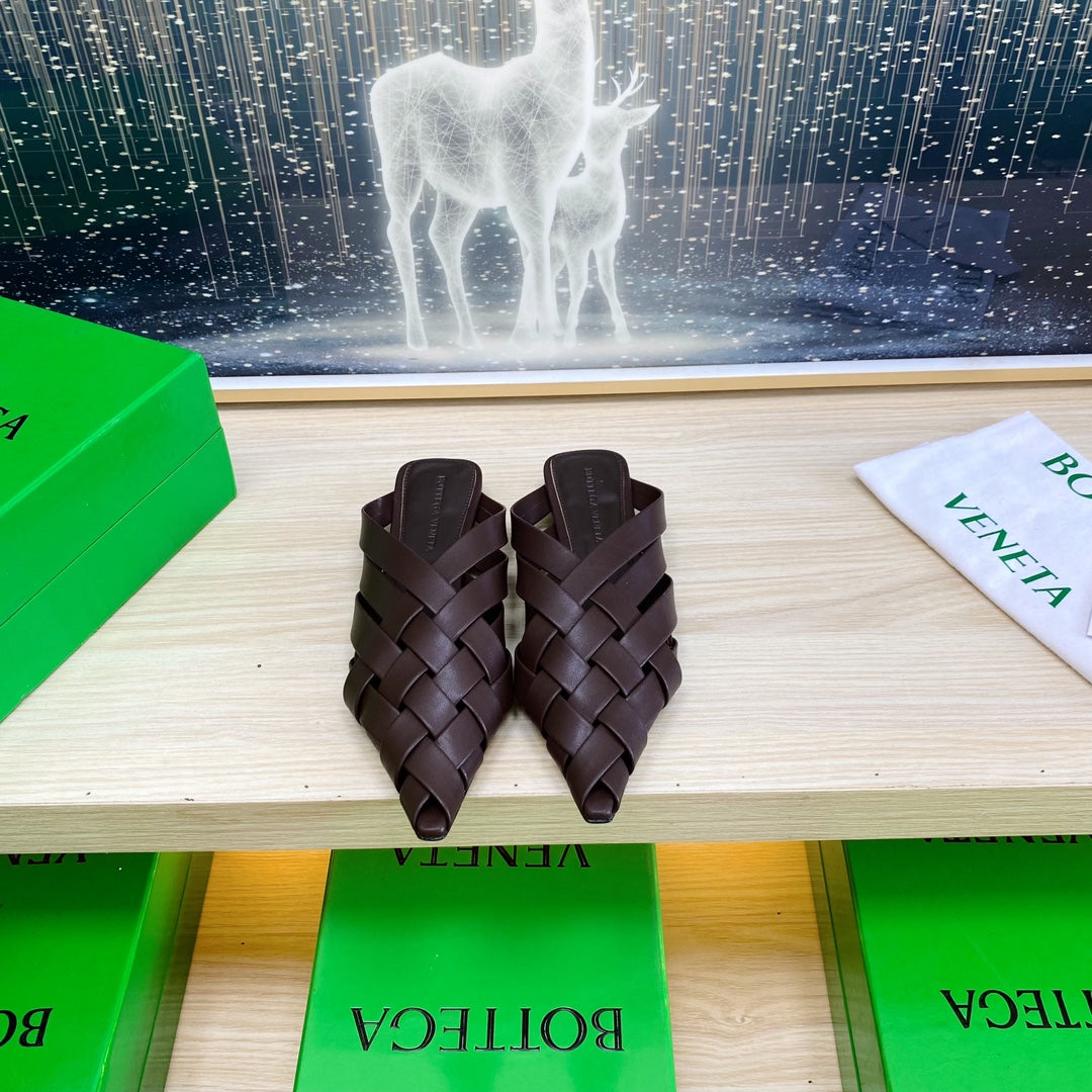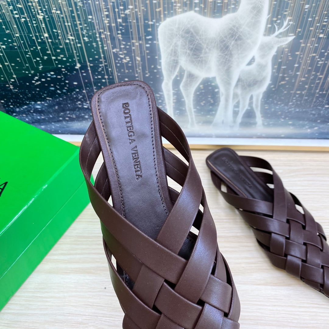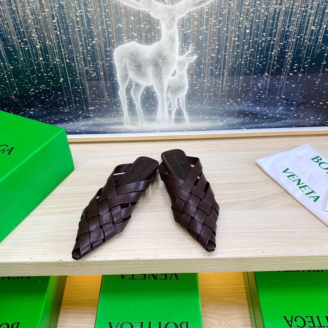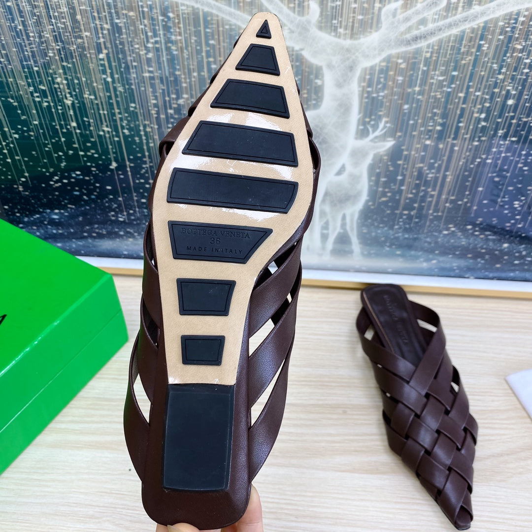 ALFIE LEATHER FLAT MULES IN CHOCOLATE BROWN PATENT CALFSKIN WITH WOVEN DESIGN