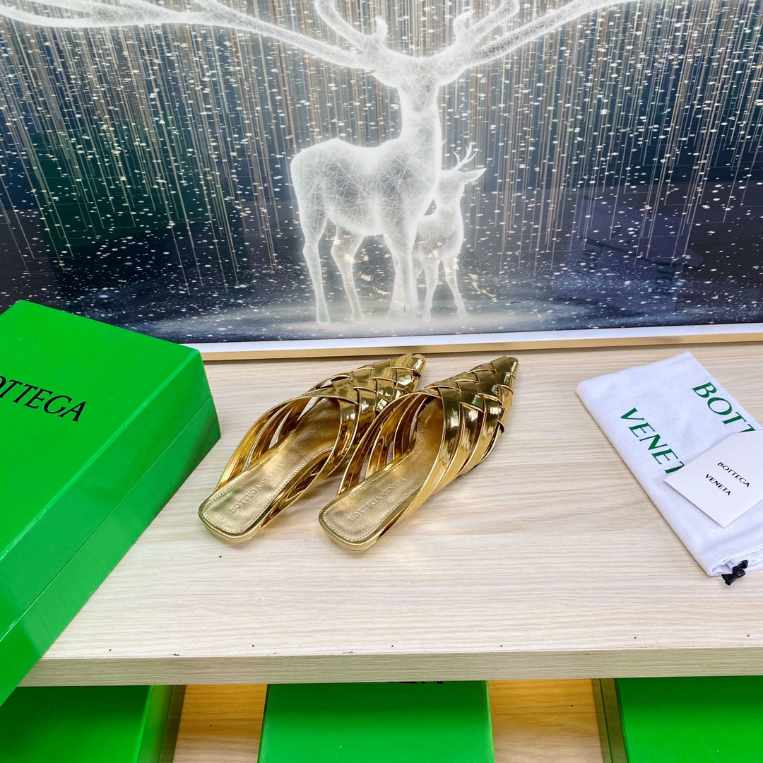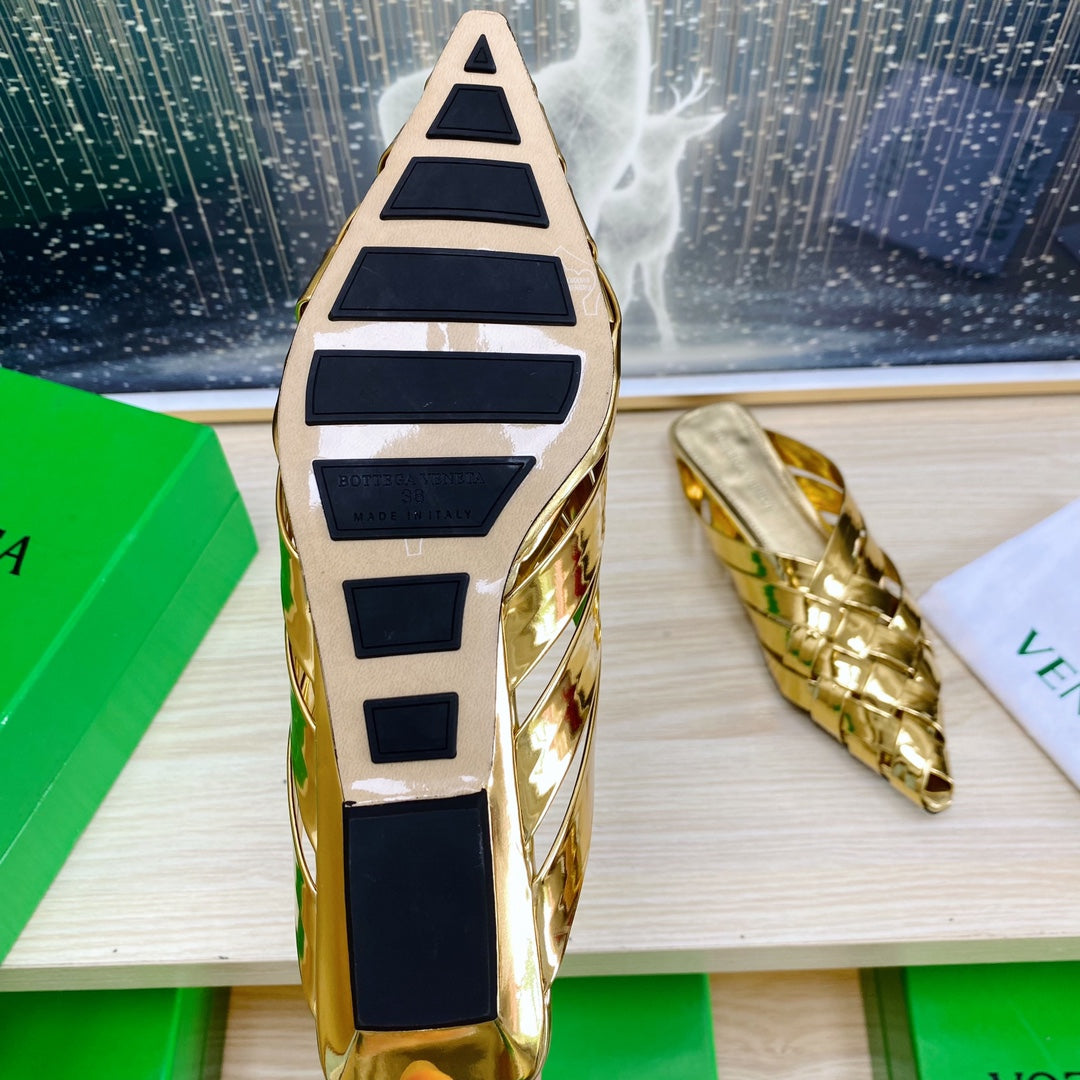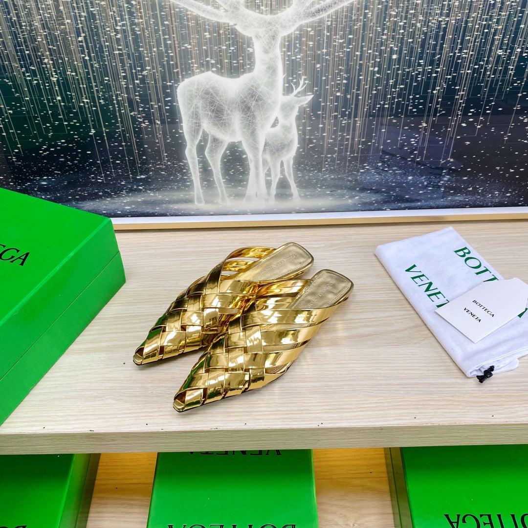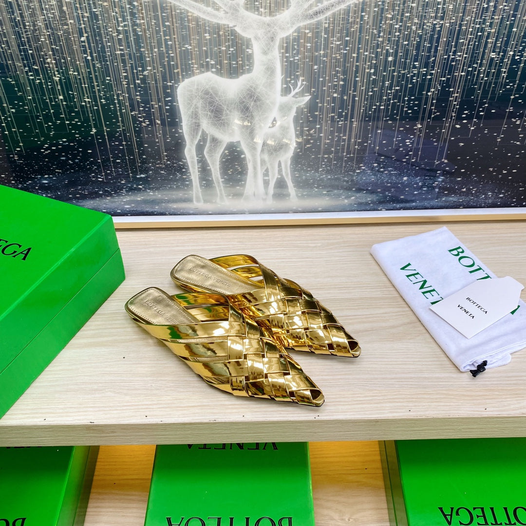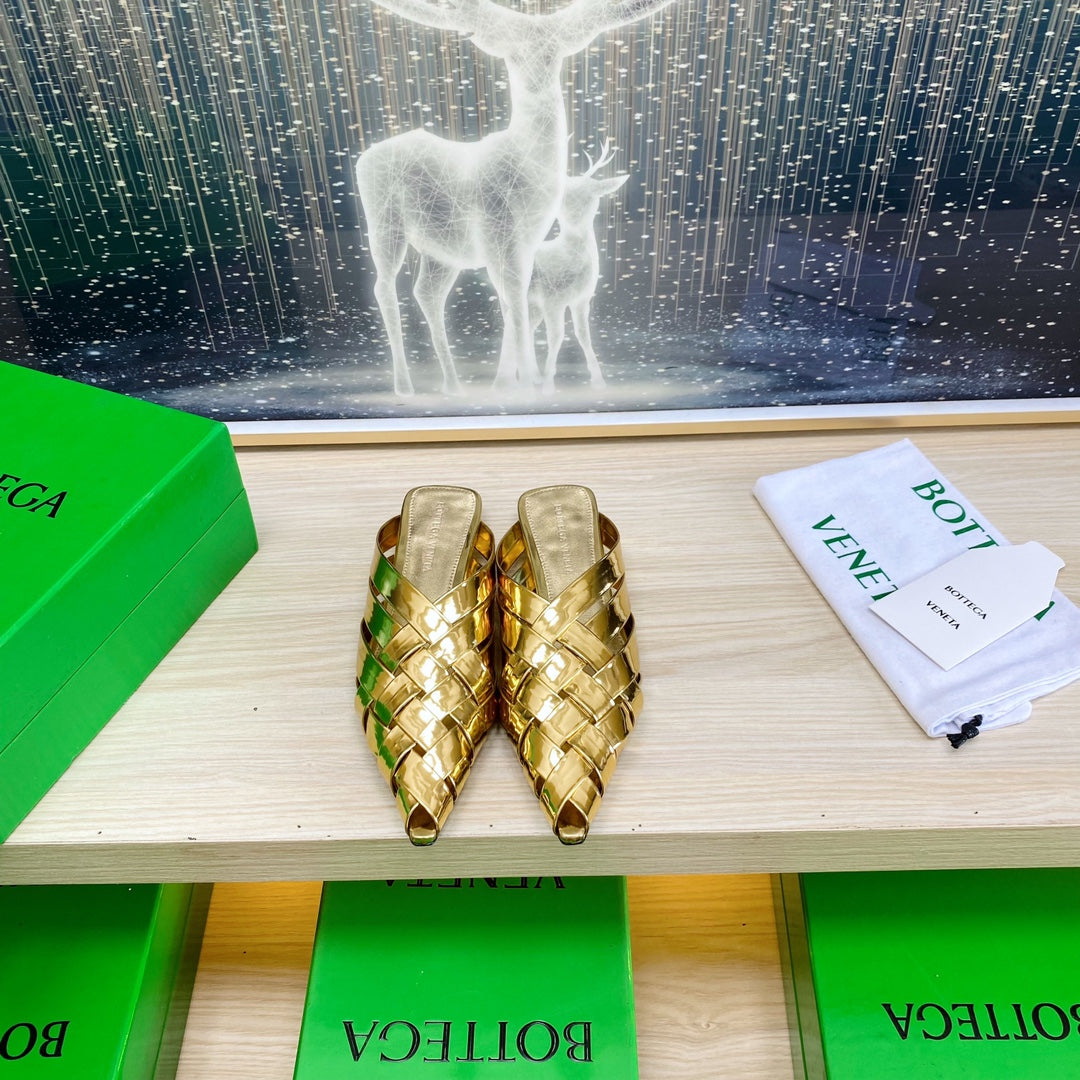 ALFIE LEATHER FLAT MULES IN GOLD PATENT CALFSKIN WITH WOVEN DESIGN
