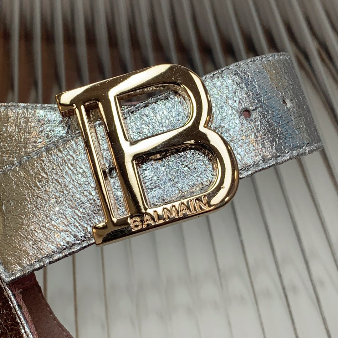 BALMAIN 25S B STRAP HIGH HEEL SANDALS 95MM IN SILVER CALFSKIN