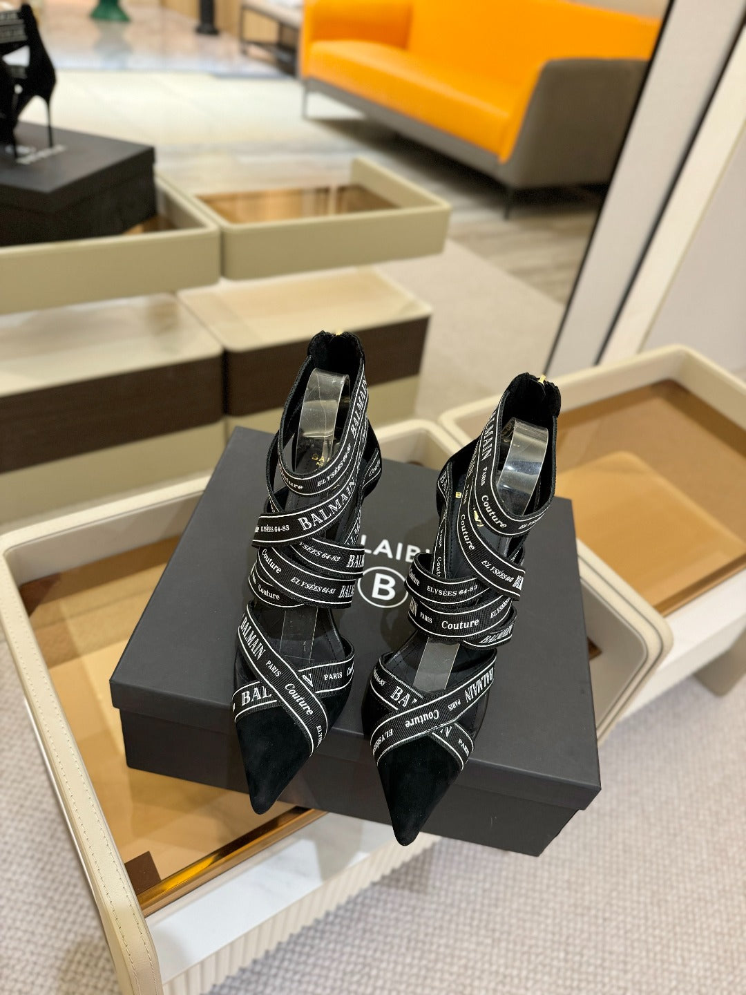 BALMAIN 25S HIGH HEELS LOGO RIBBON 95MM IN BLACK FULL SUEDE