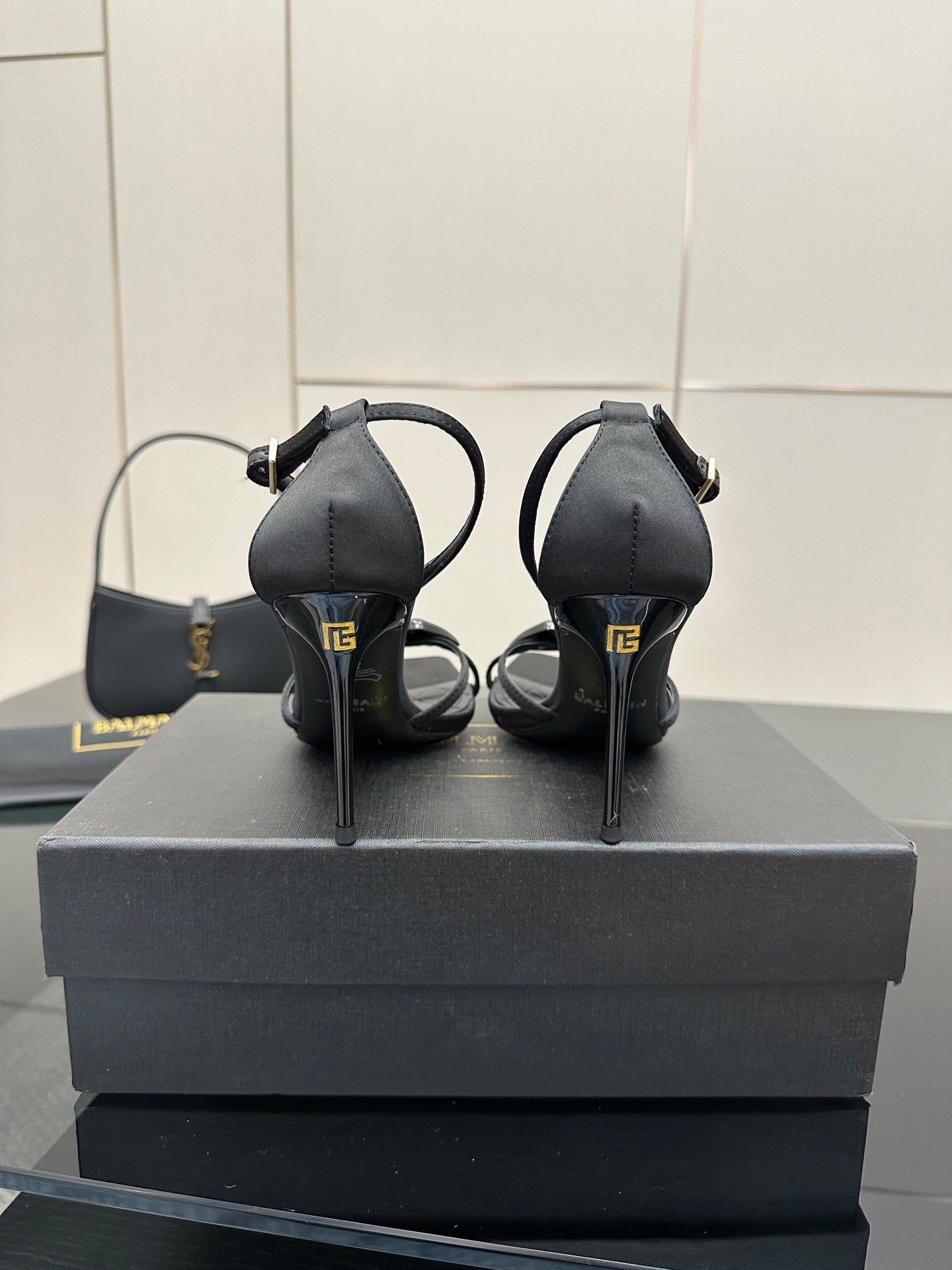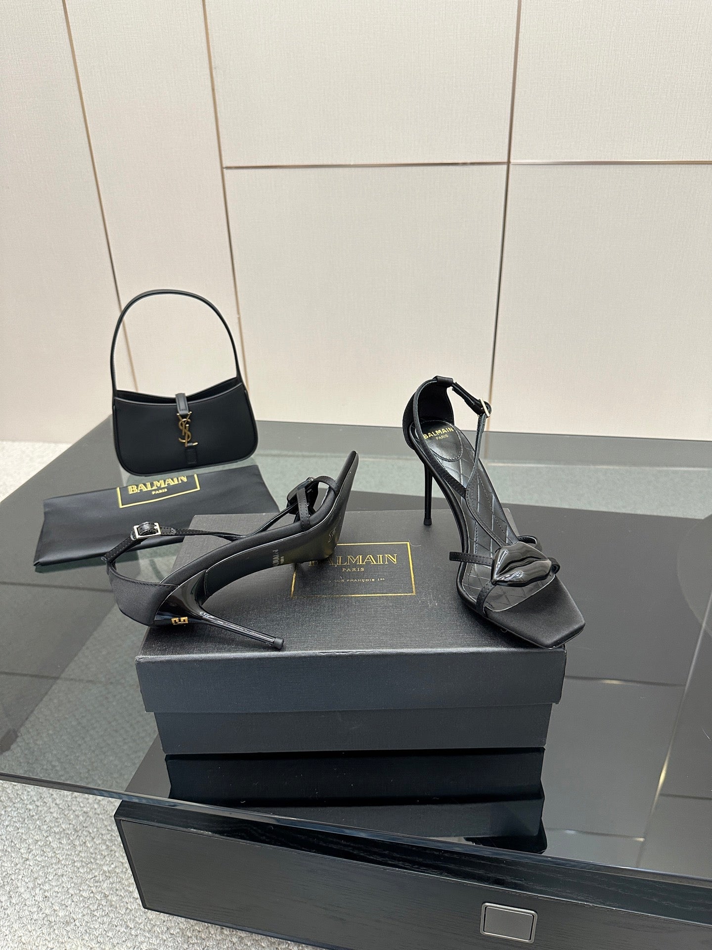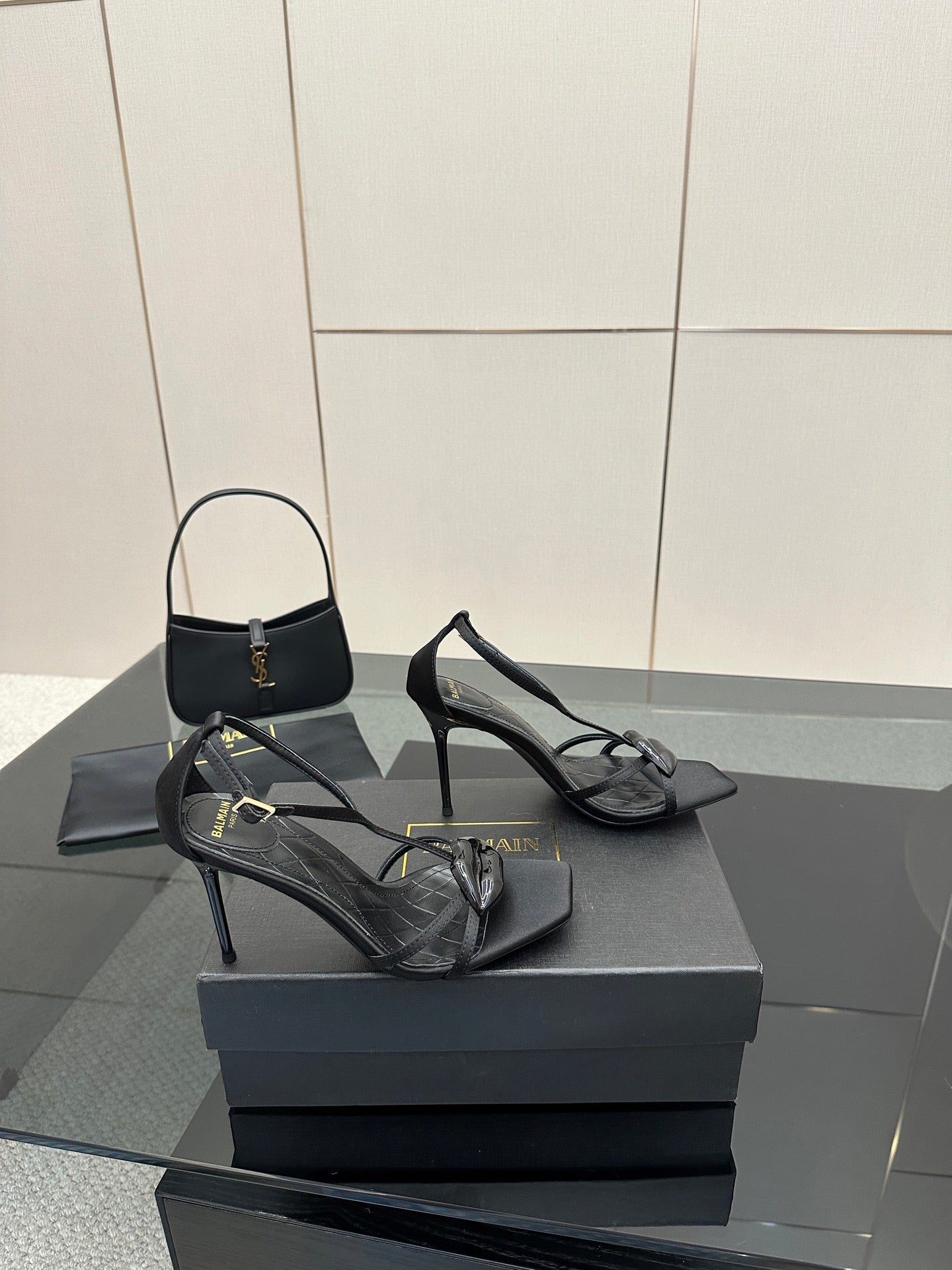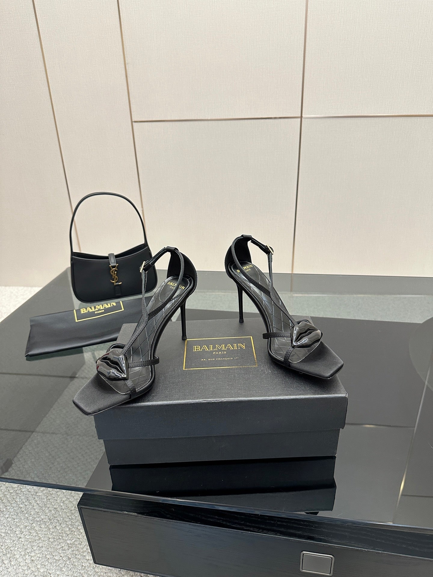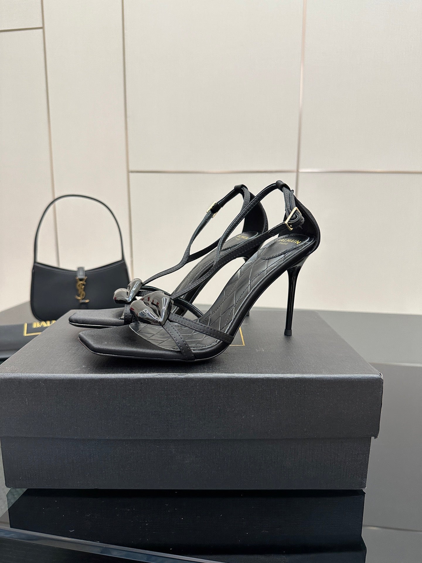 BALMAIN 25S LIPS SANDALS 10 IN BLACK SATIN