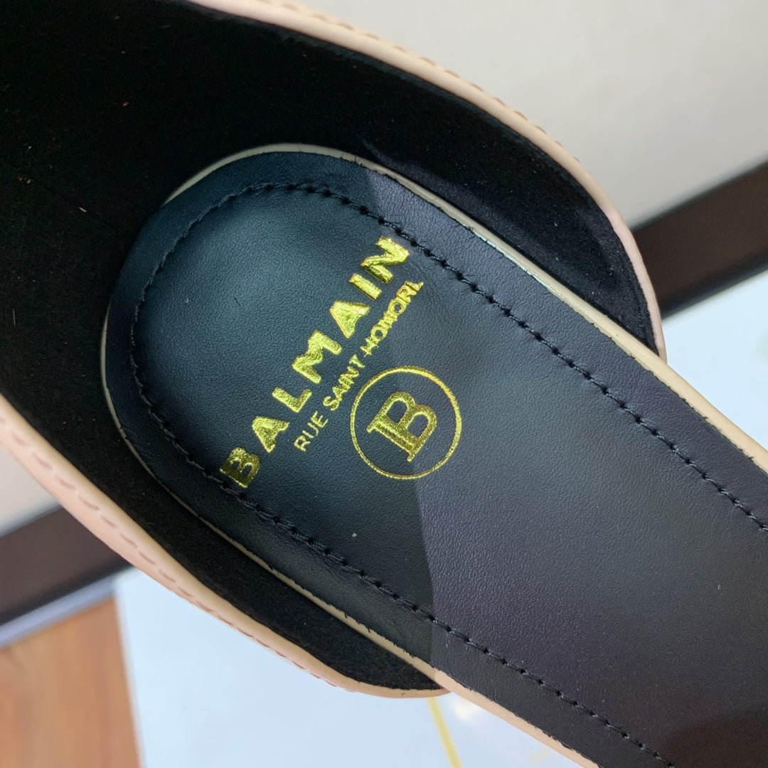 BALMAIN 25S SQUARE STRAP HIGH HEELS 100MM IN BEIGE PATENT CALFSKIN