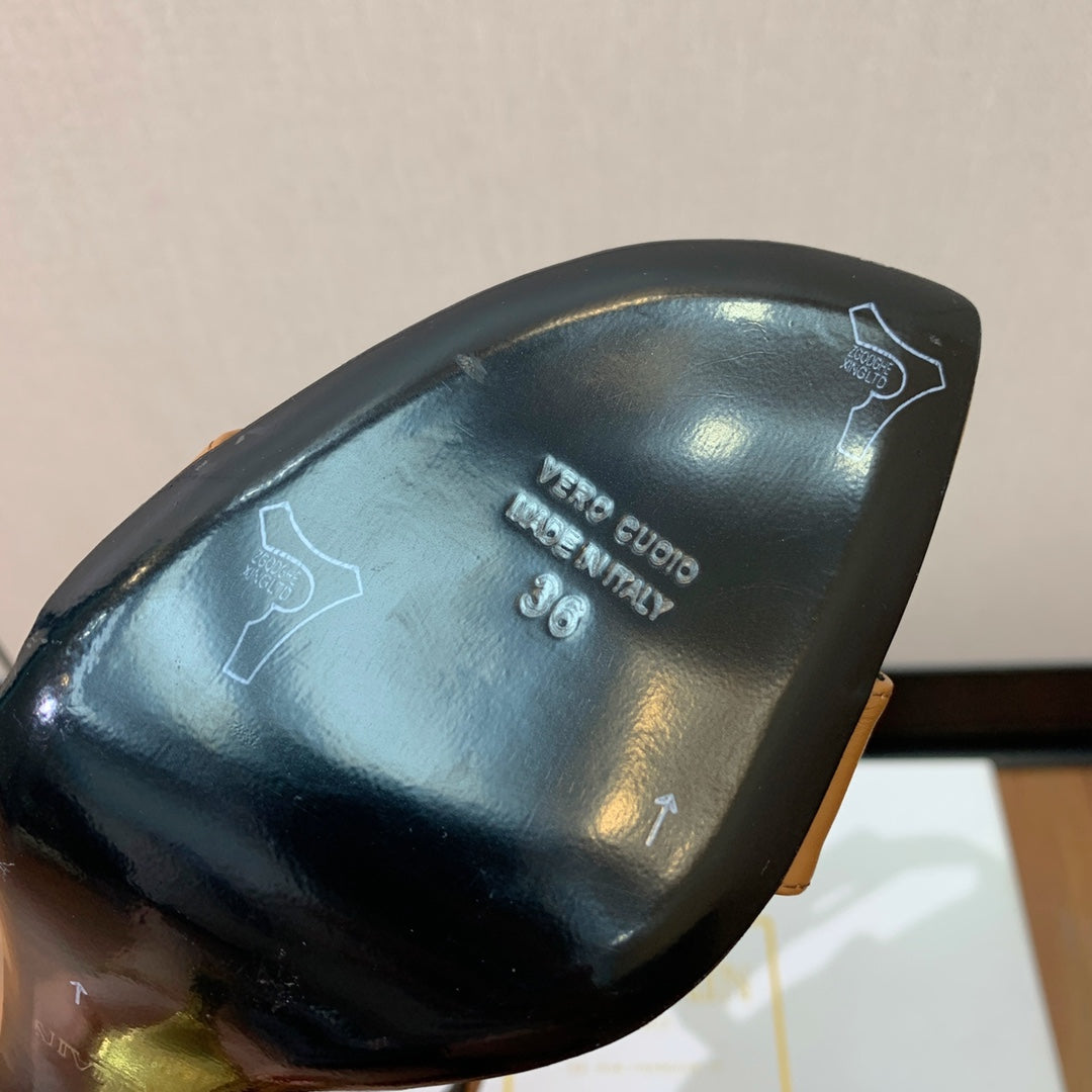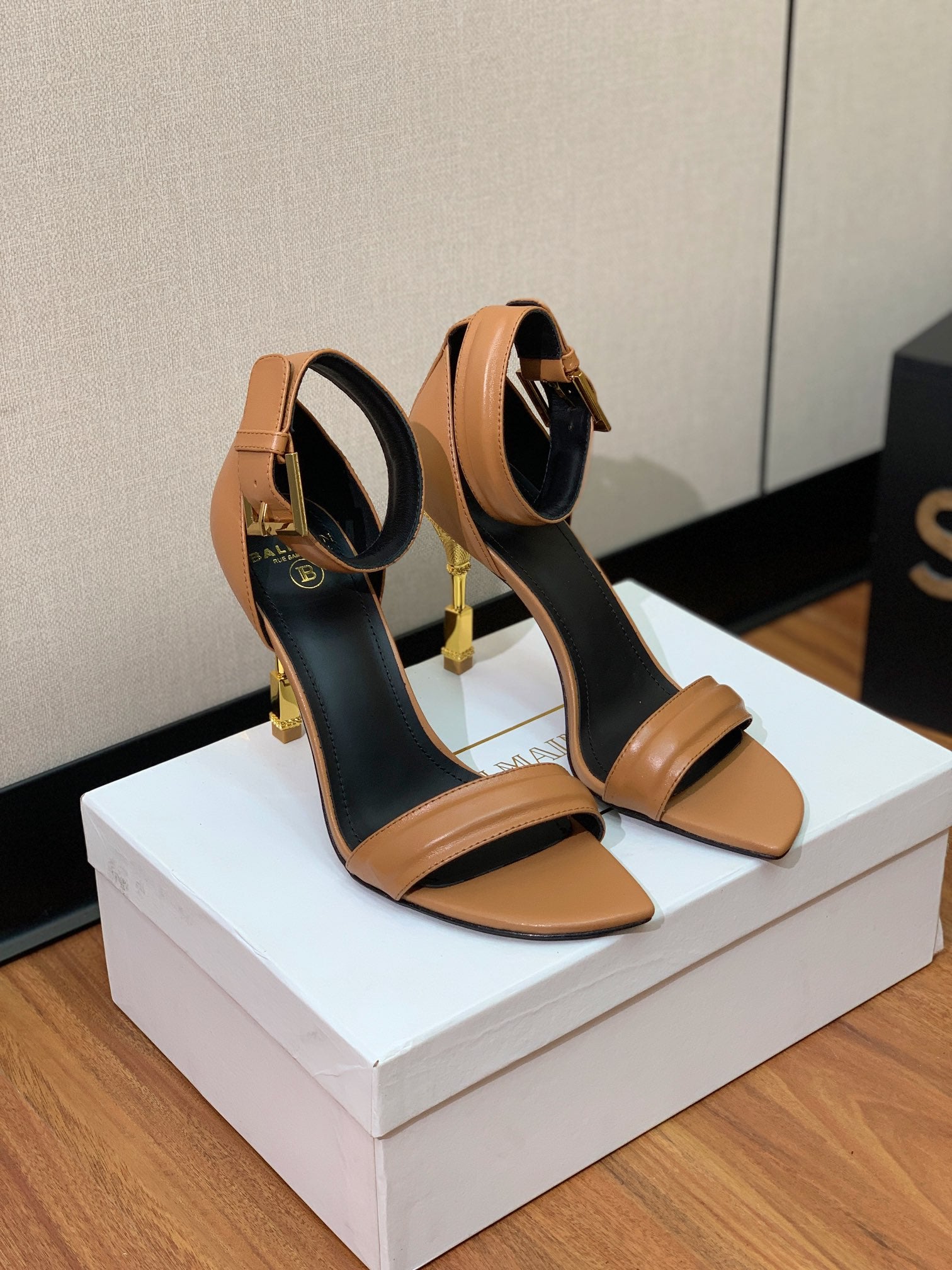 BALMAIN 25S SQUARE STRAP HIGH HEELS 100MM IN CARAMEL CALFSKIN