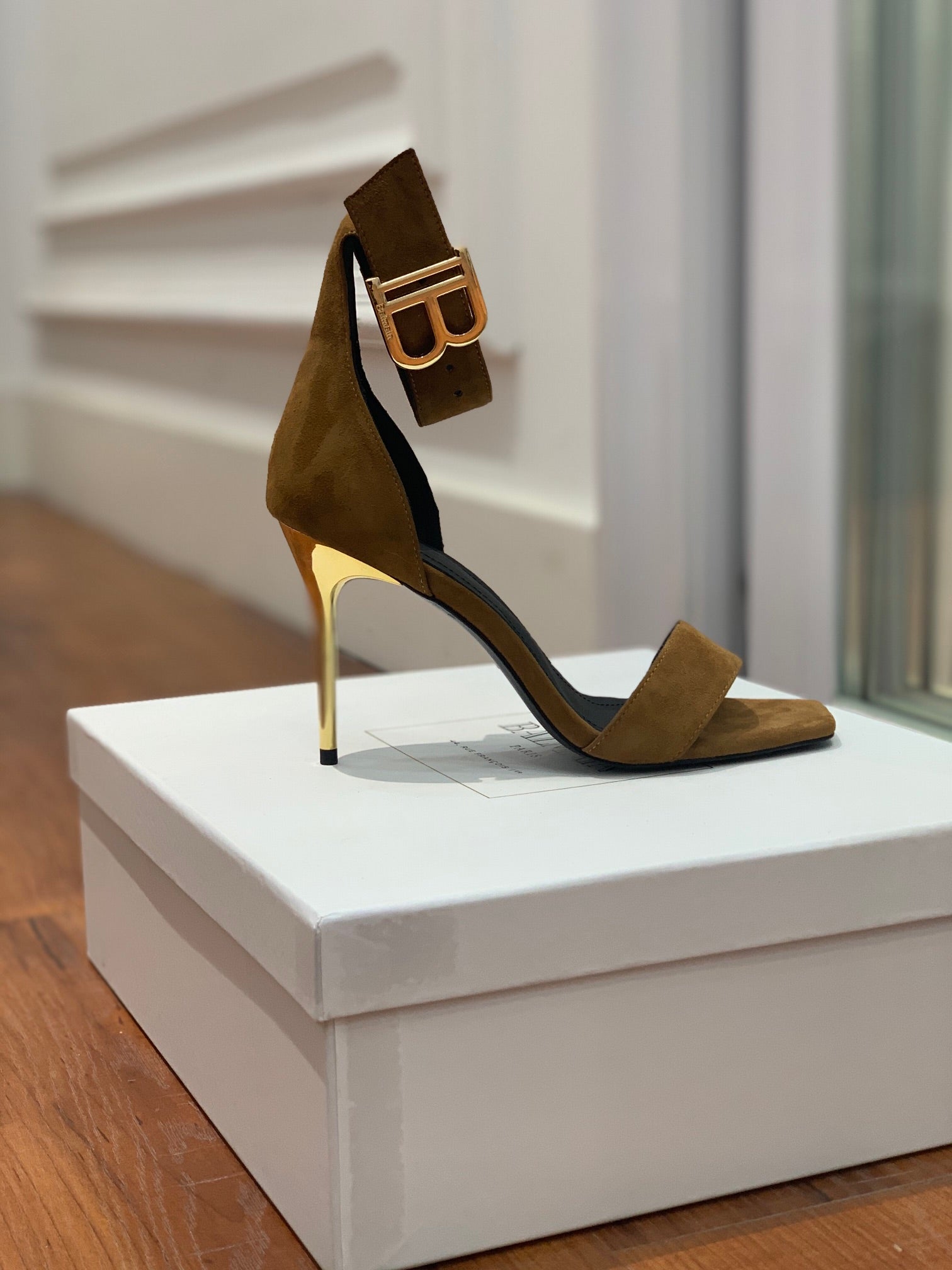 BALMAIN 25S THIN STRAP HIGH HEELS 105MM IN DARK BROWN SUEDE GOLD HARDWARE