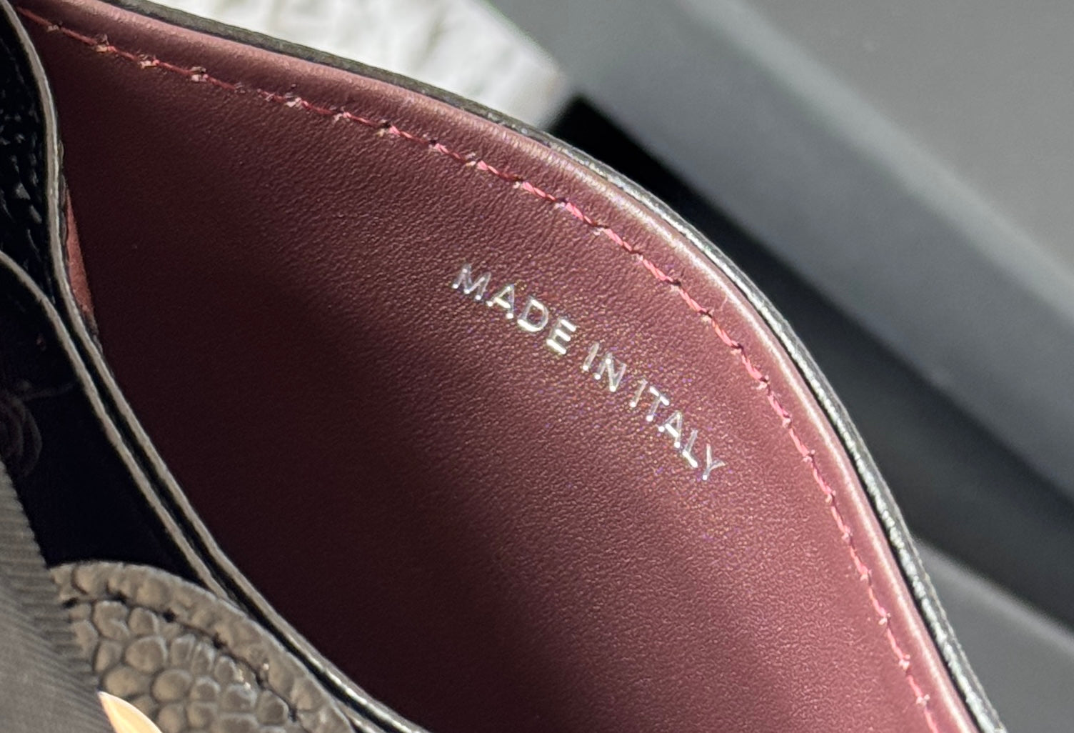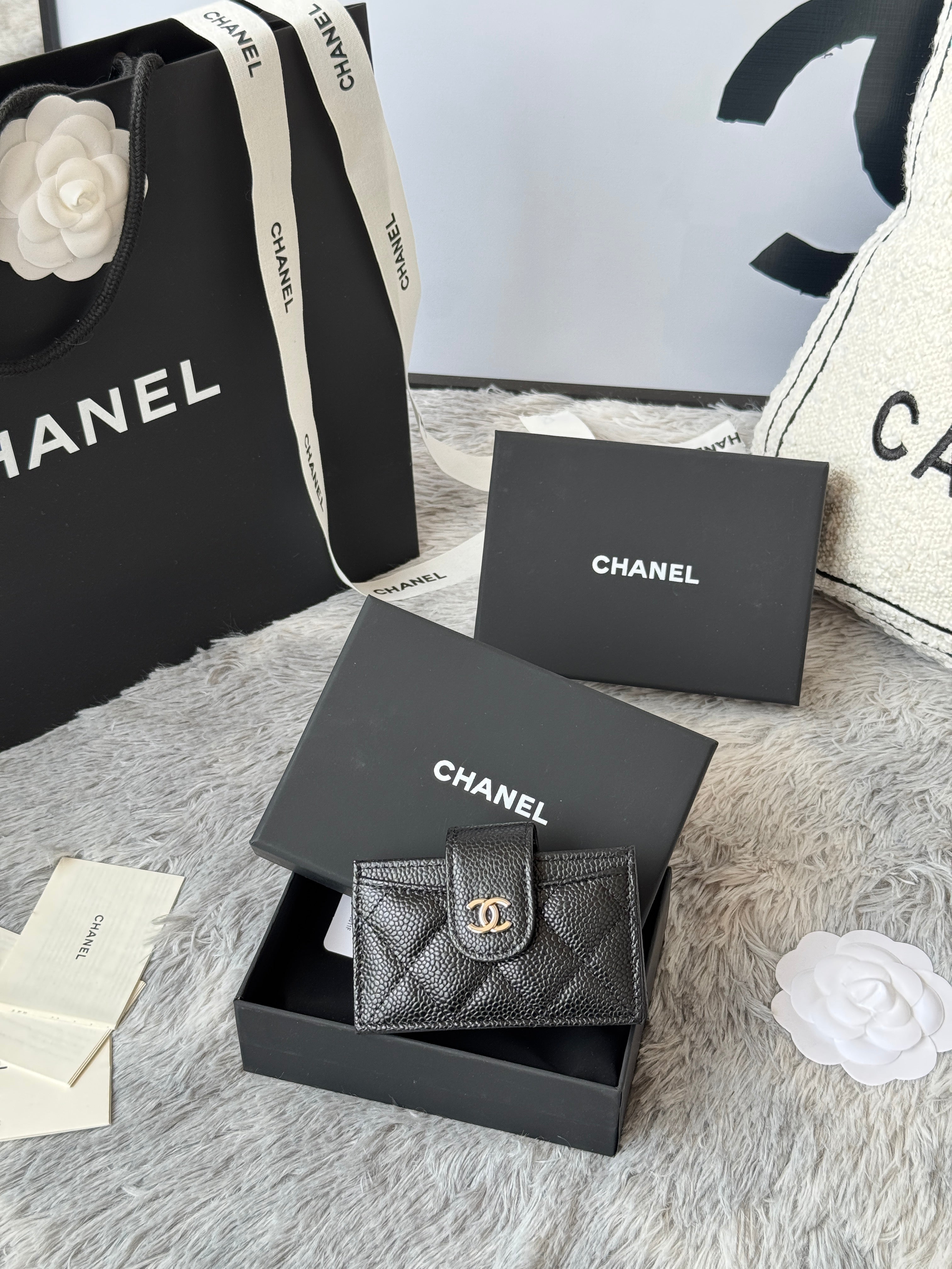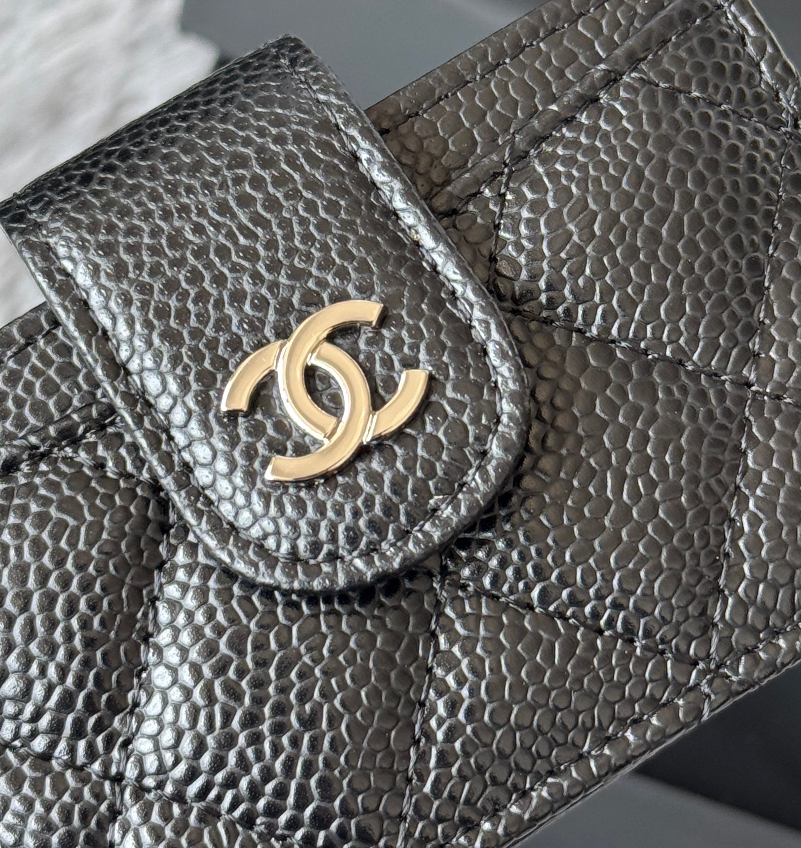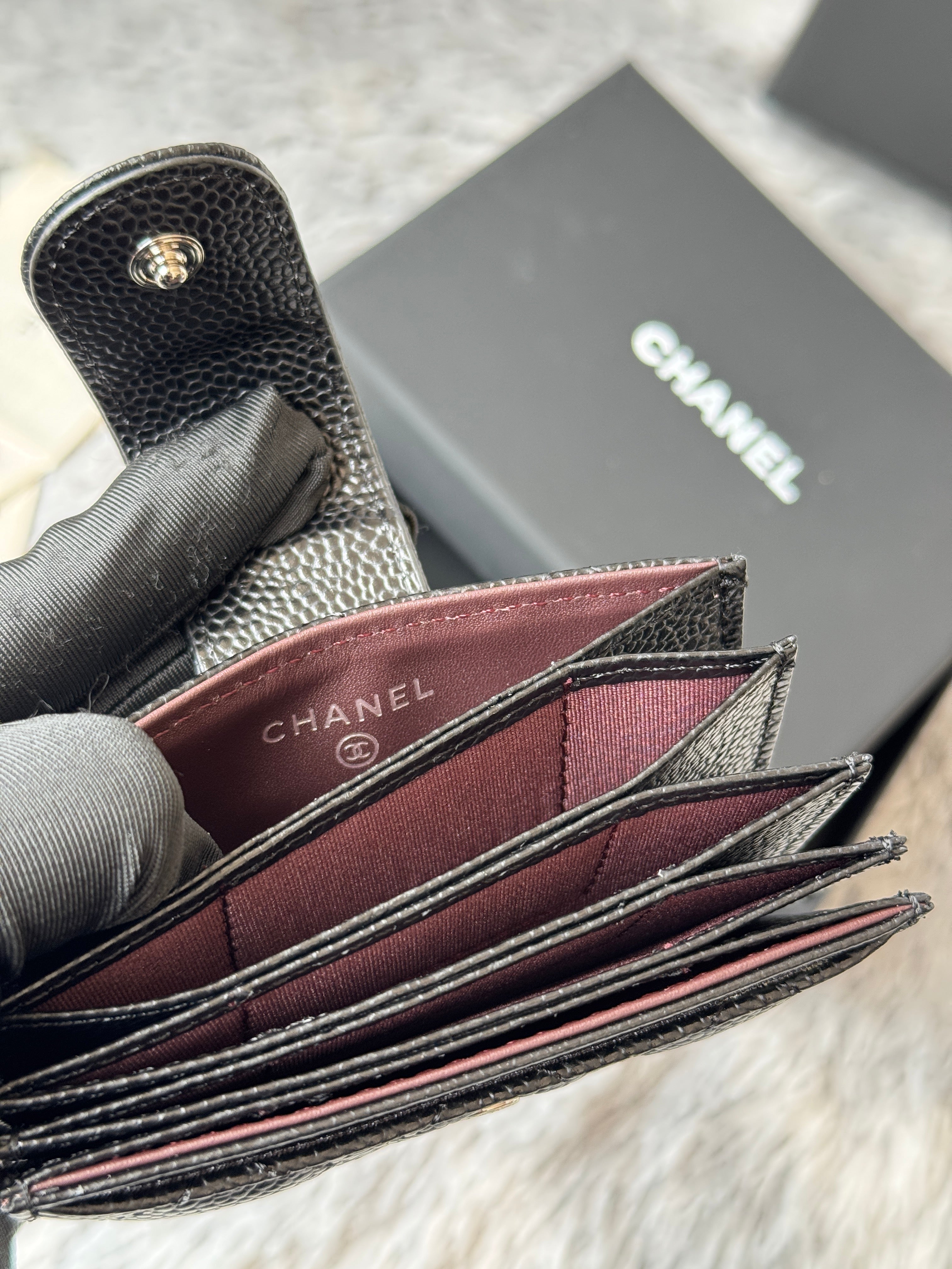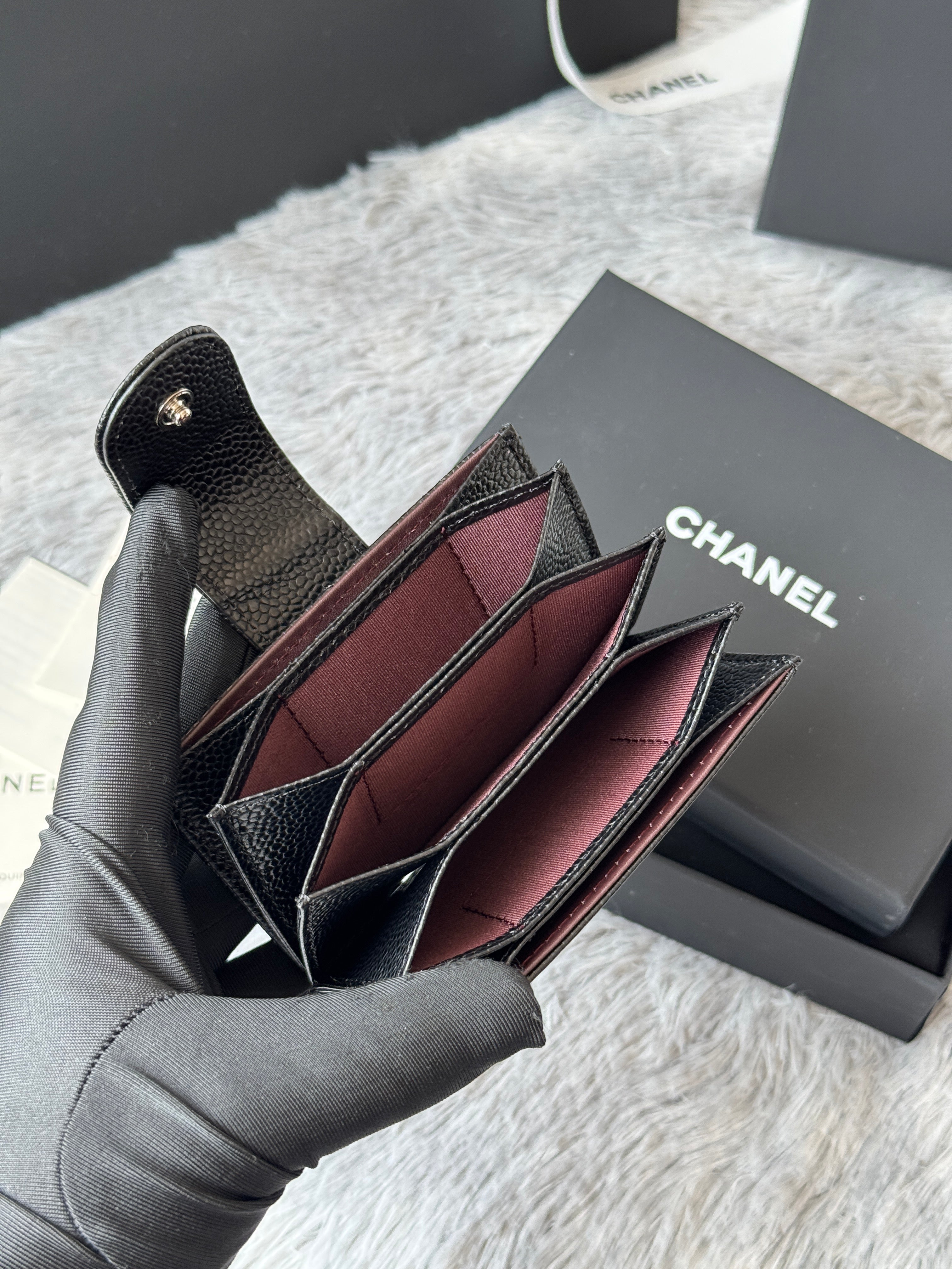 CARD HOLDER 10 CIRCLE CLASP IN BLACK CAVIAR LEATHER SILVER-TONE METALLIC