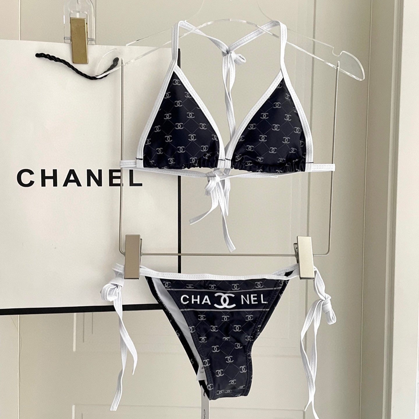 CC BIKINI SWIMSUIT SET IN BLACK AND WHITE TRIM WHITE LOGO PRINTED 608921
