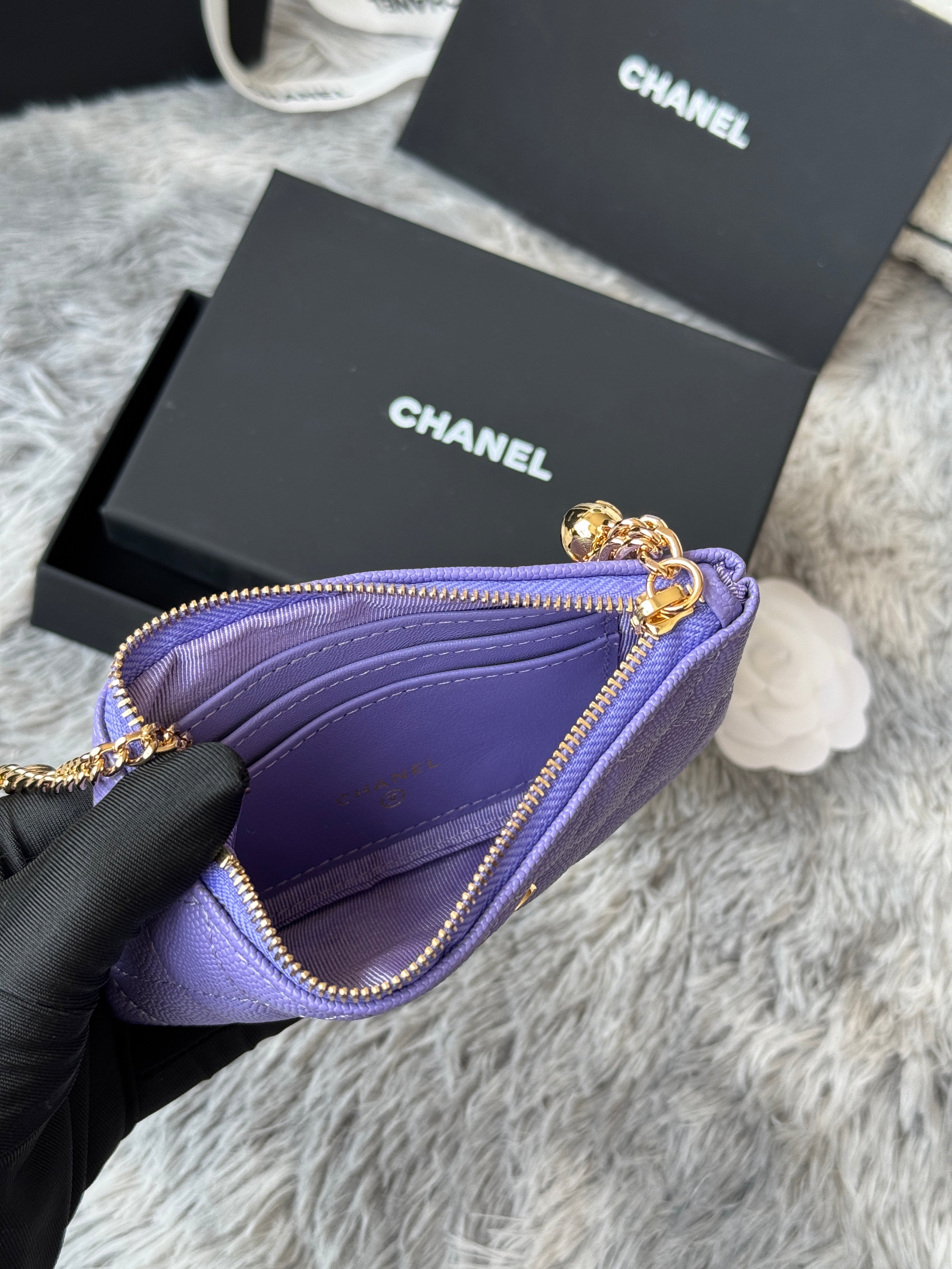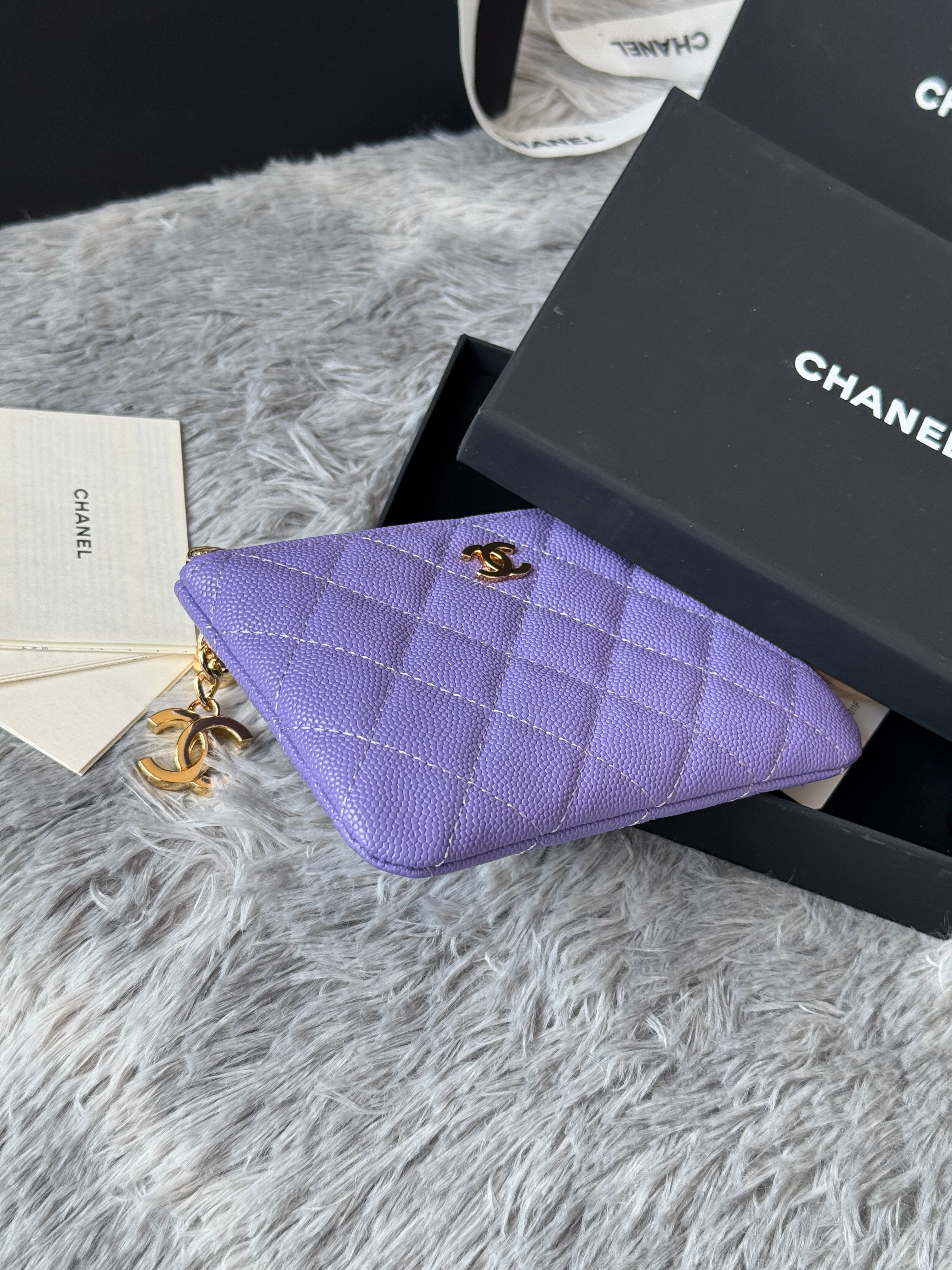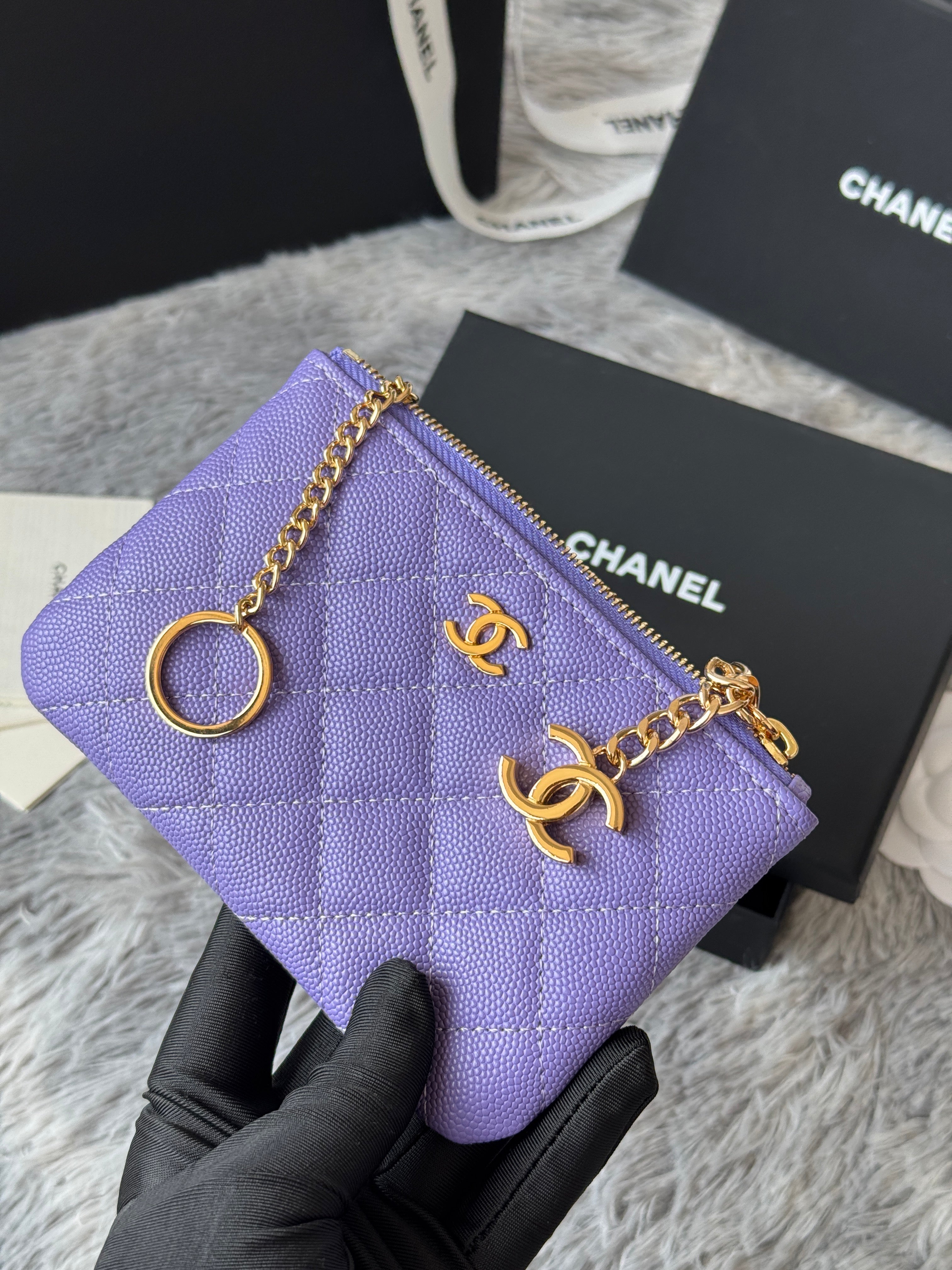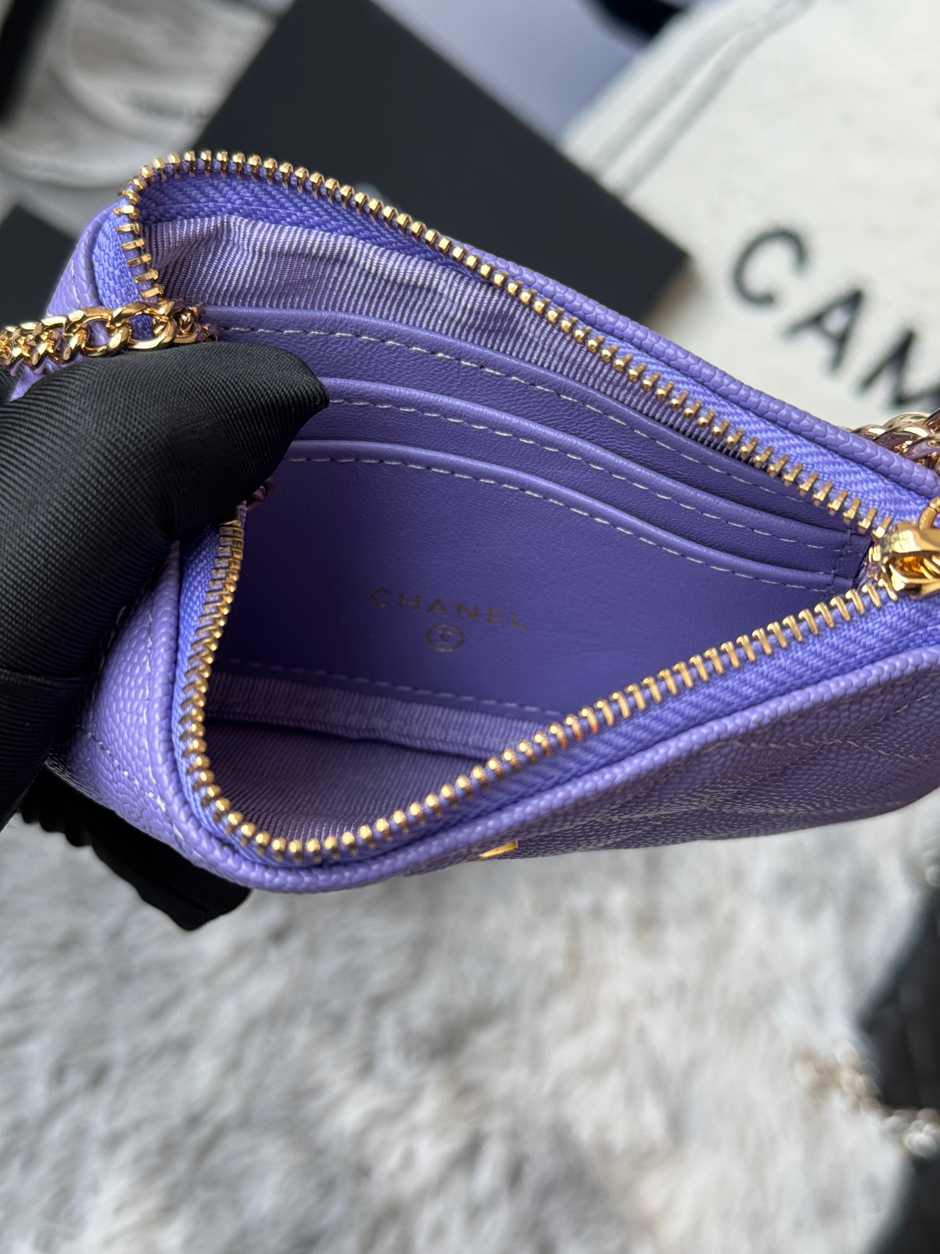 CC CLASSIC ZIPPED POUCH 14 IN BABY PURPLE GRAINED CALFSKIN GOLD-TONE CHARM CHAIN