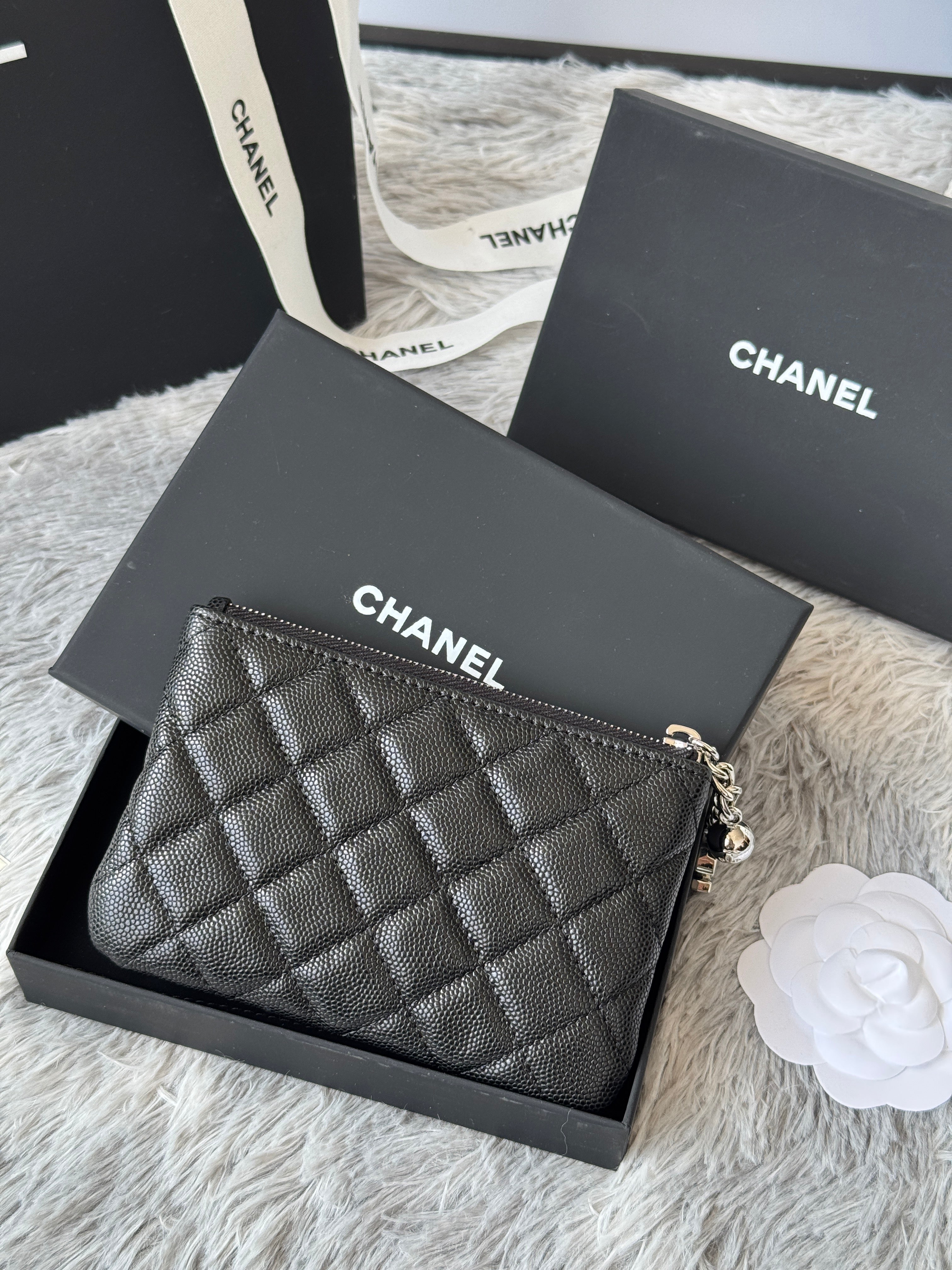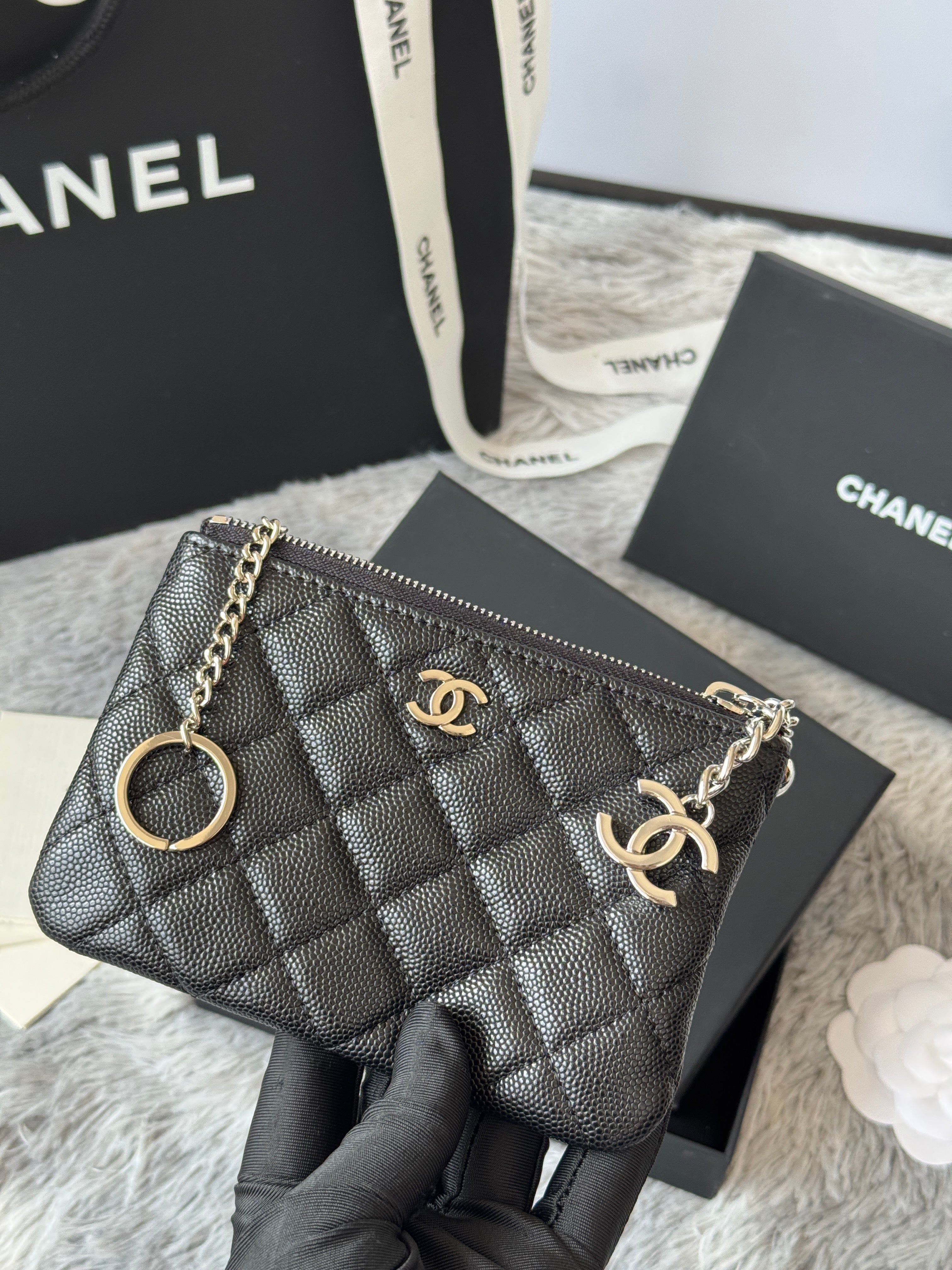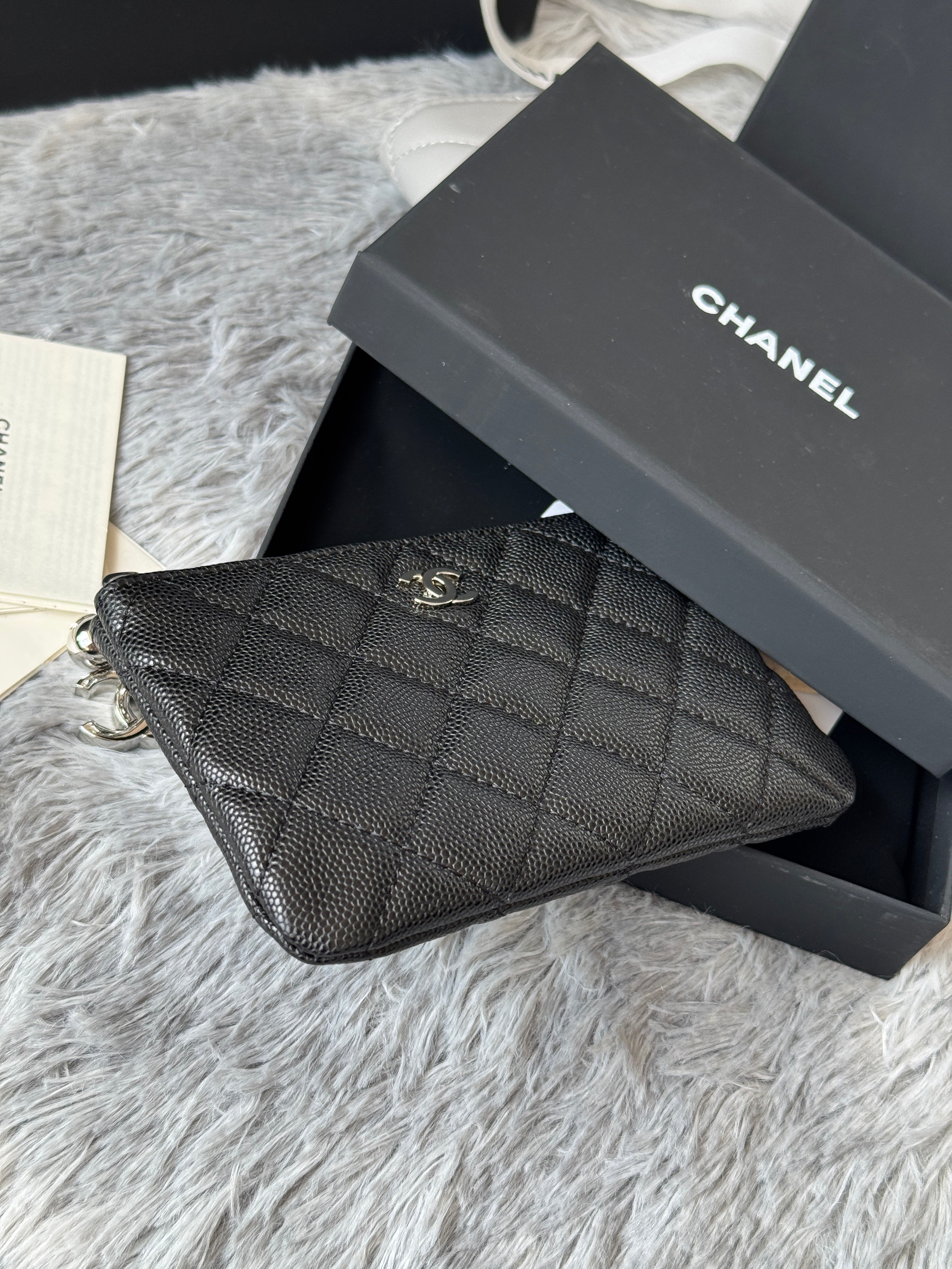 CC CLASSIC ZIPPED POUCH 14 IN BLACK GRAINED CALFSKIN SILVER-TONE CHARM CHAIN