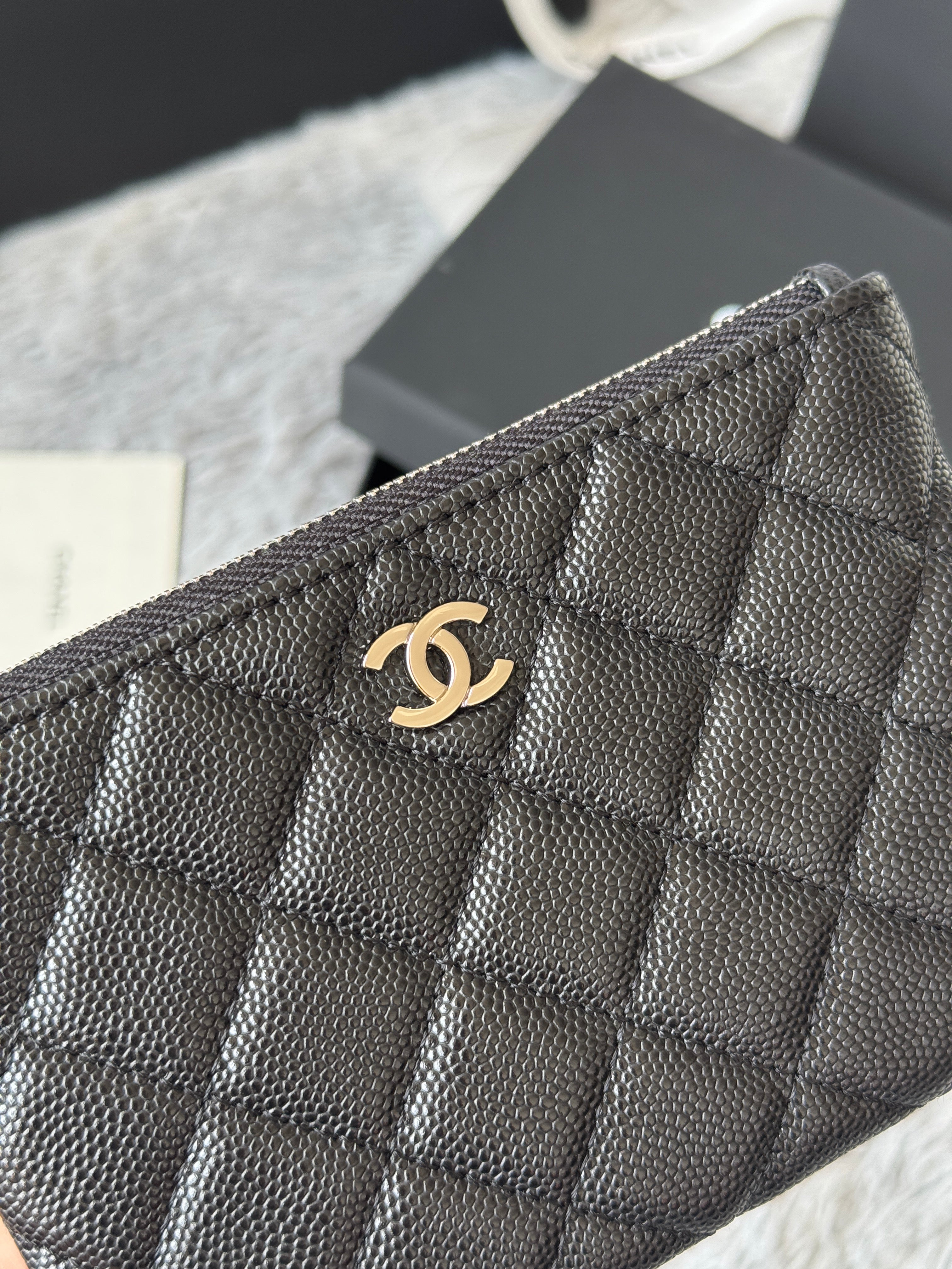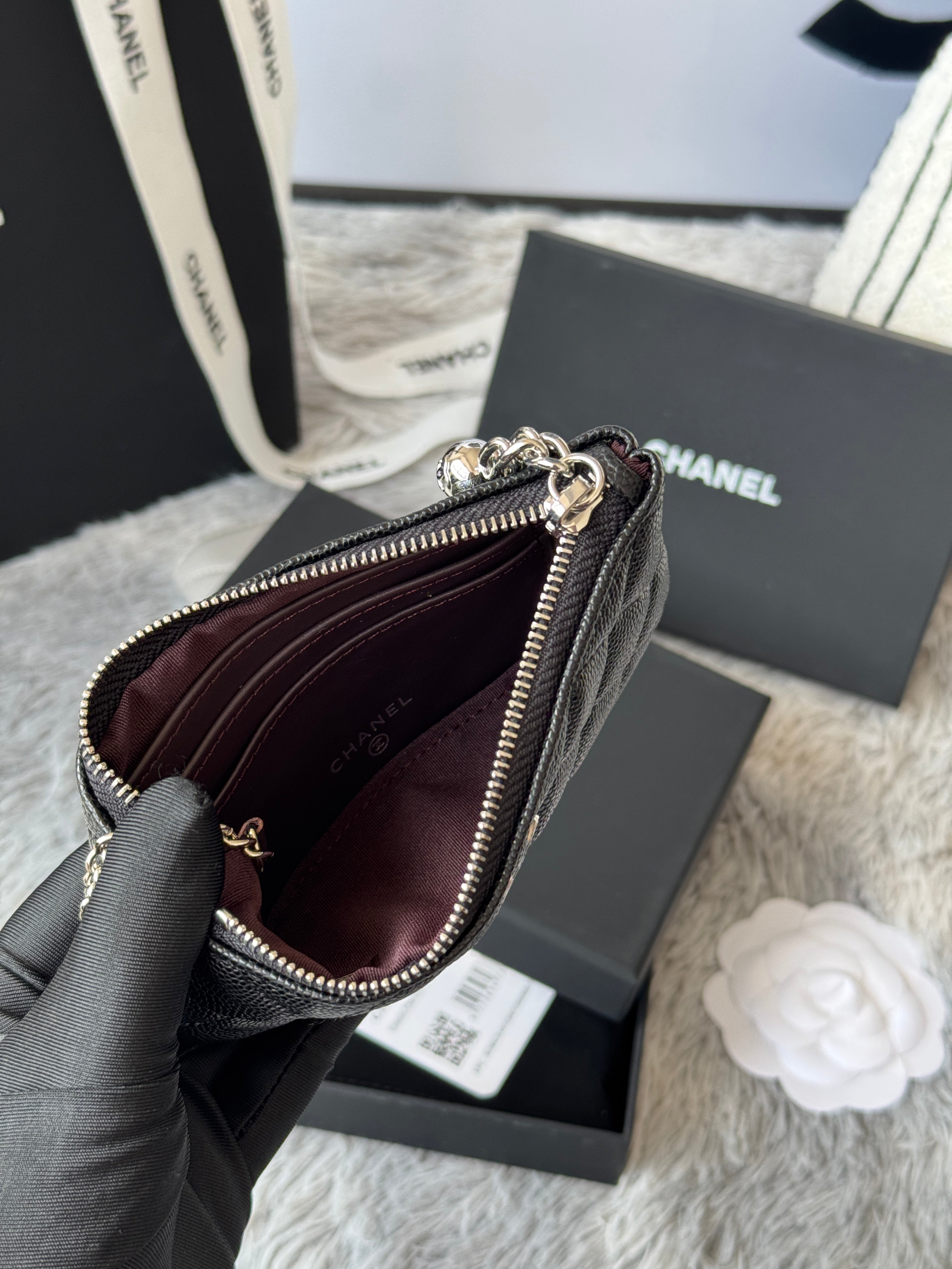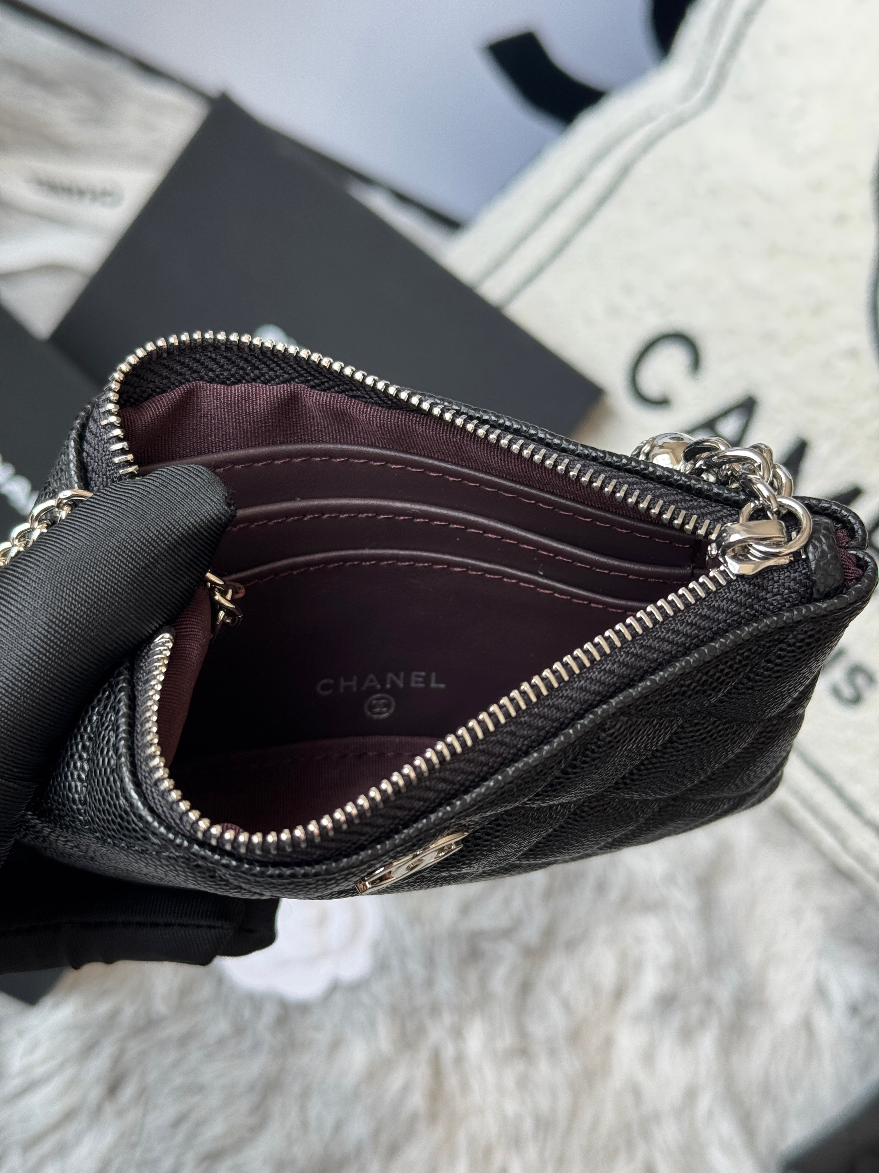 CC CLASSIC ZIPPED POUCH 14 IN BLACK GRAINED CALFSKIN SILVER-TONE CHARM CHAIN