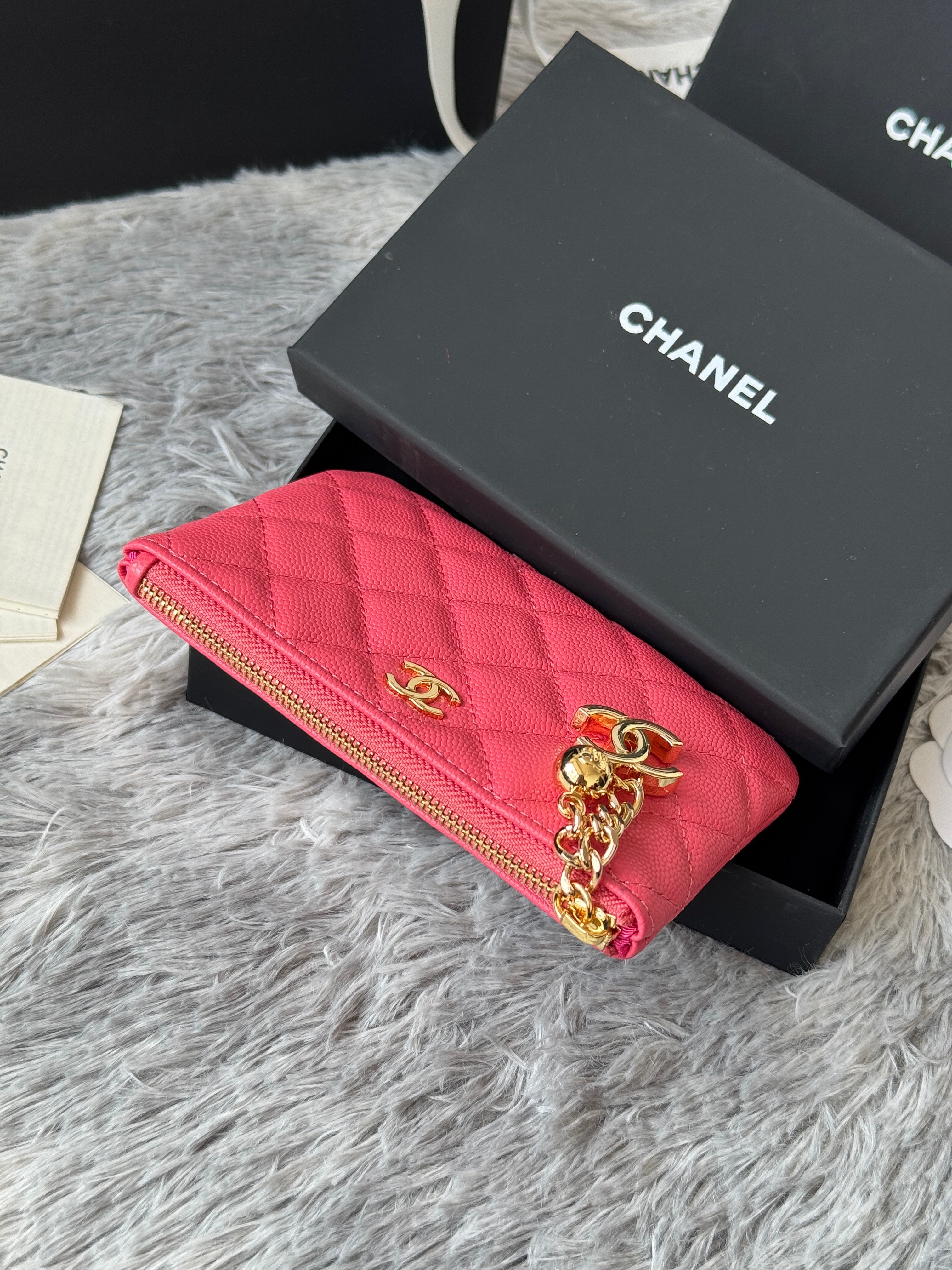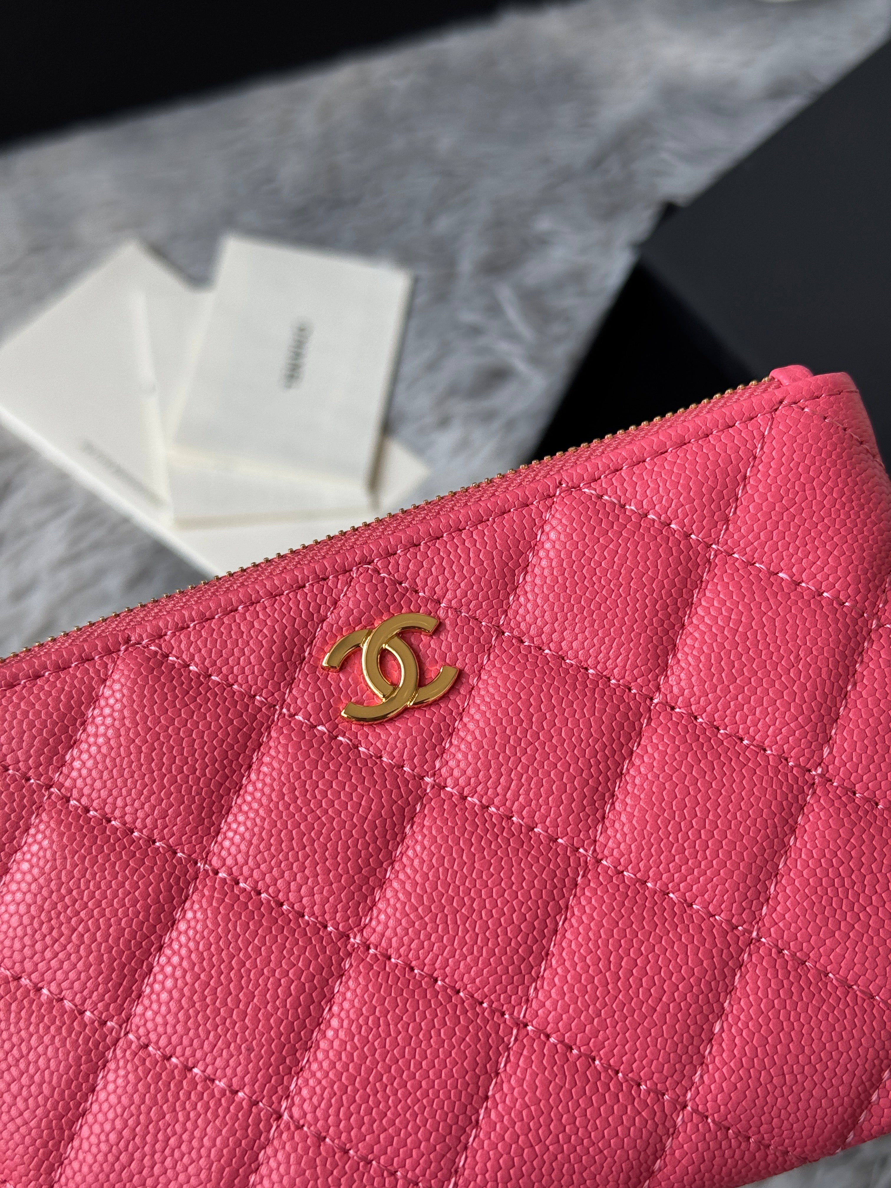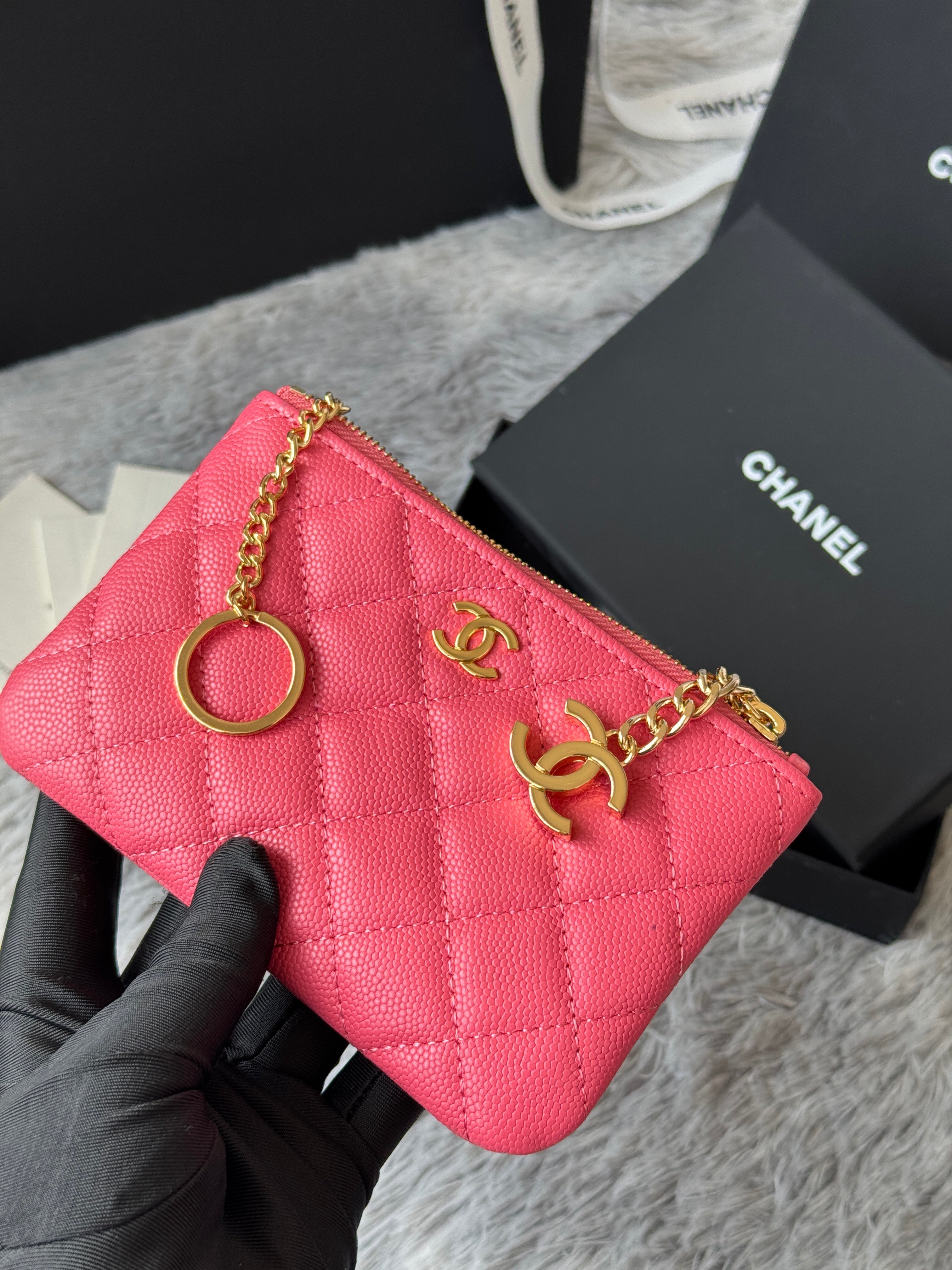 CC CLASSIC ZIPPED POUCH 14 IN CHESTNUT ROSE PINK GRAINED CALFSKIN GOLD-TONE CHARM CHAIN