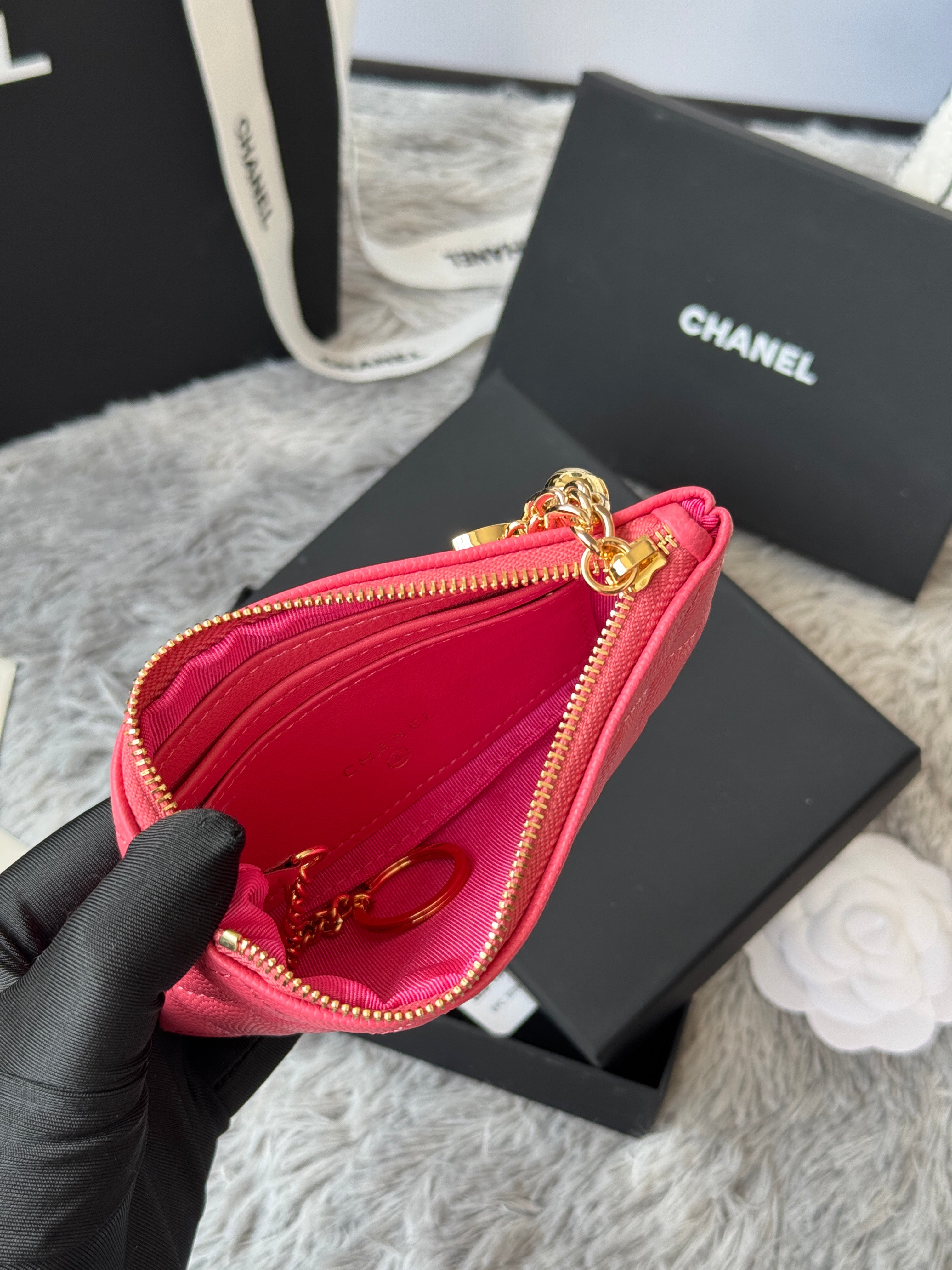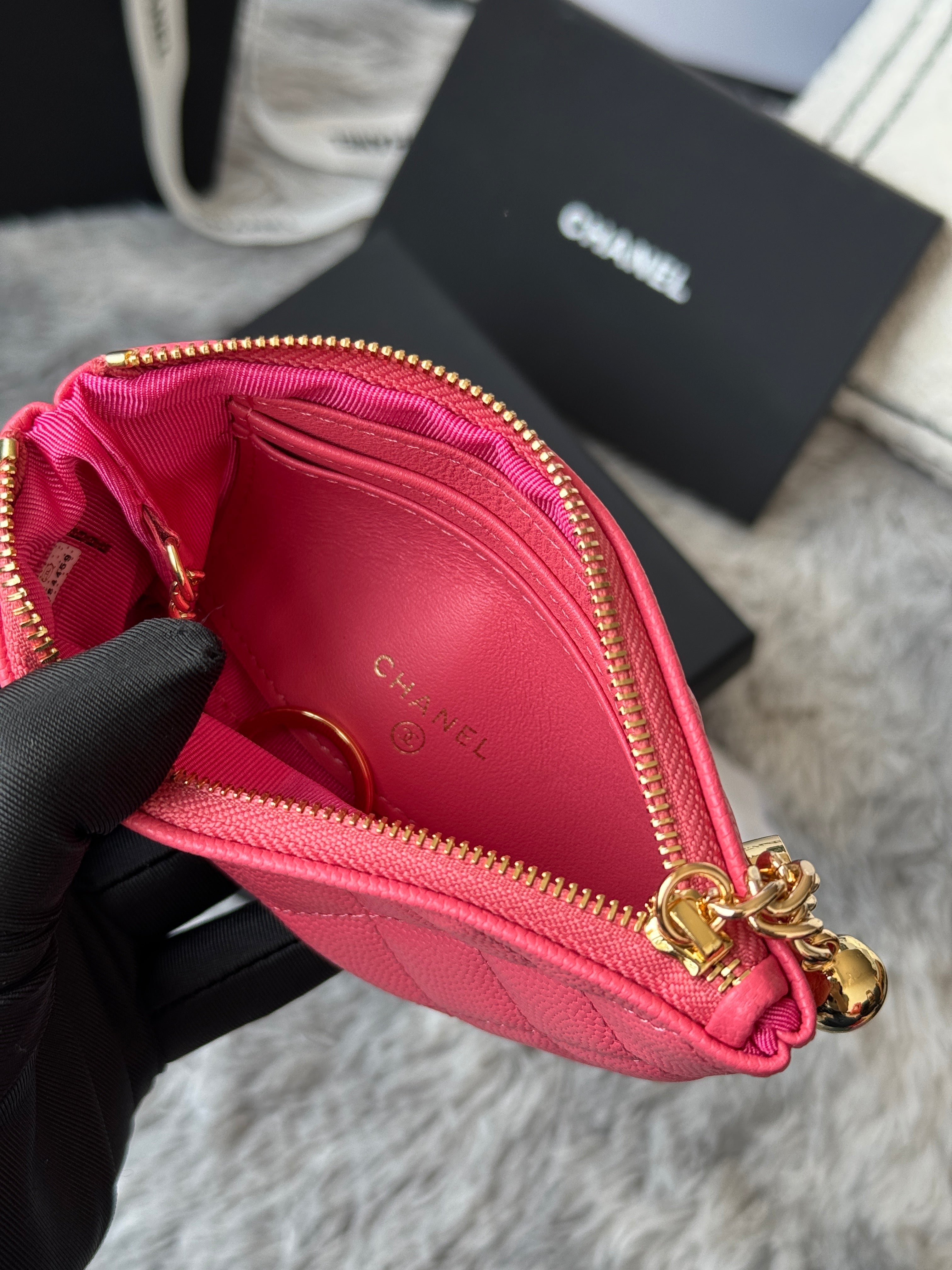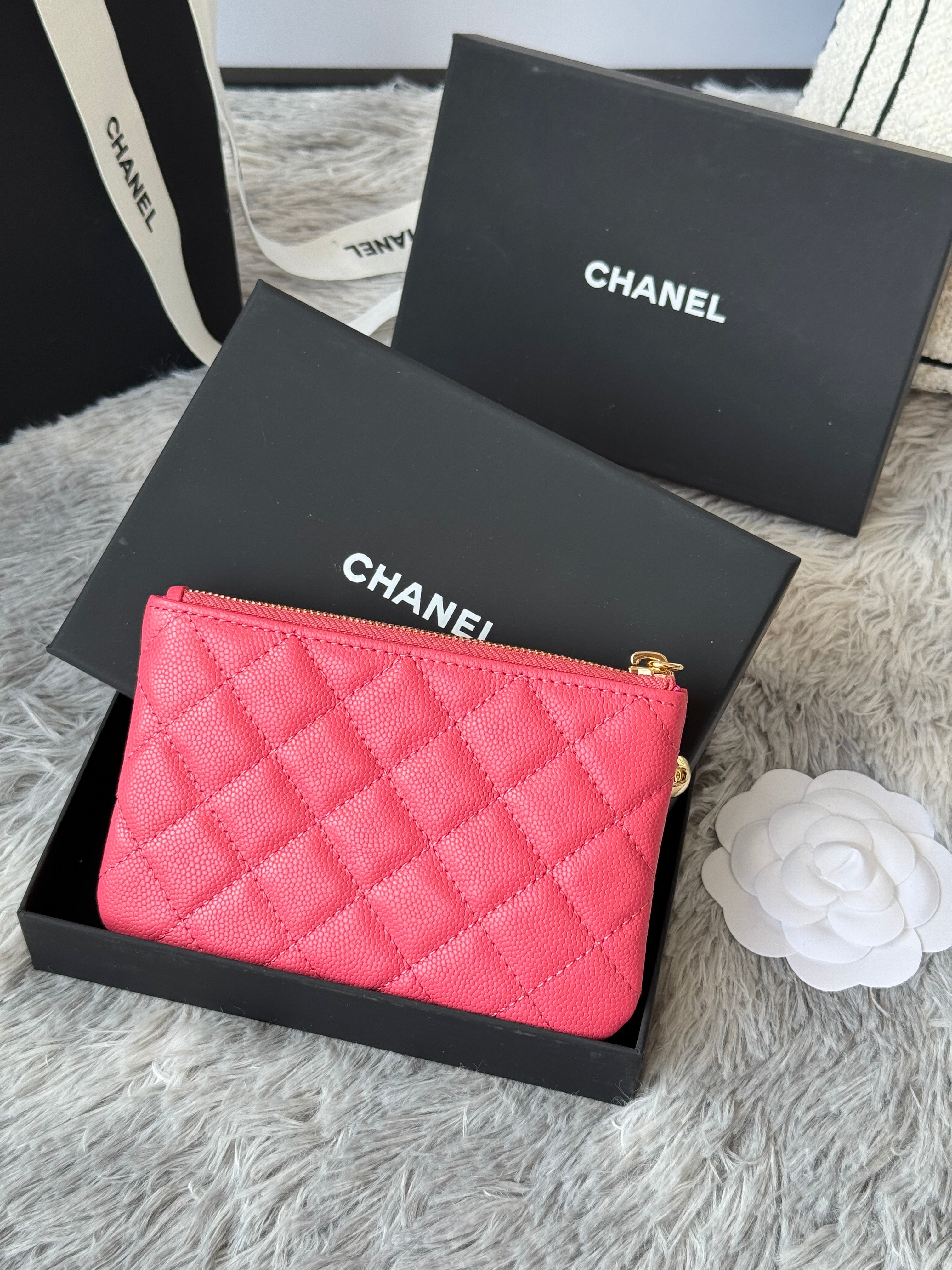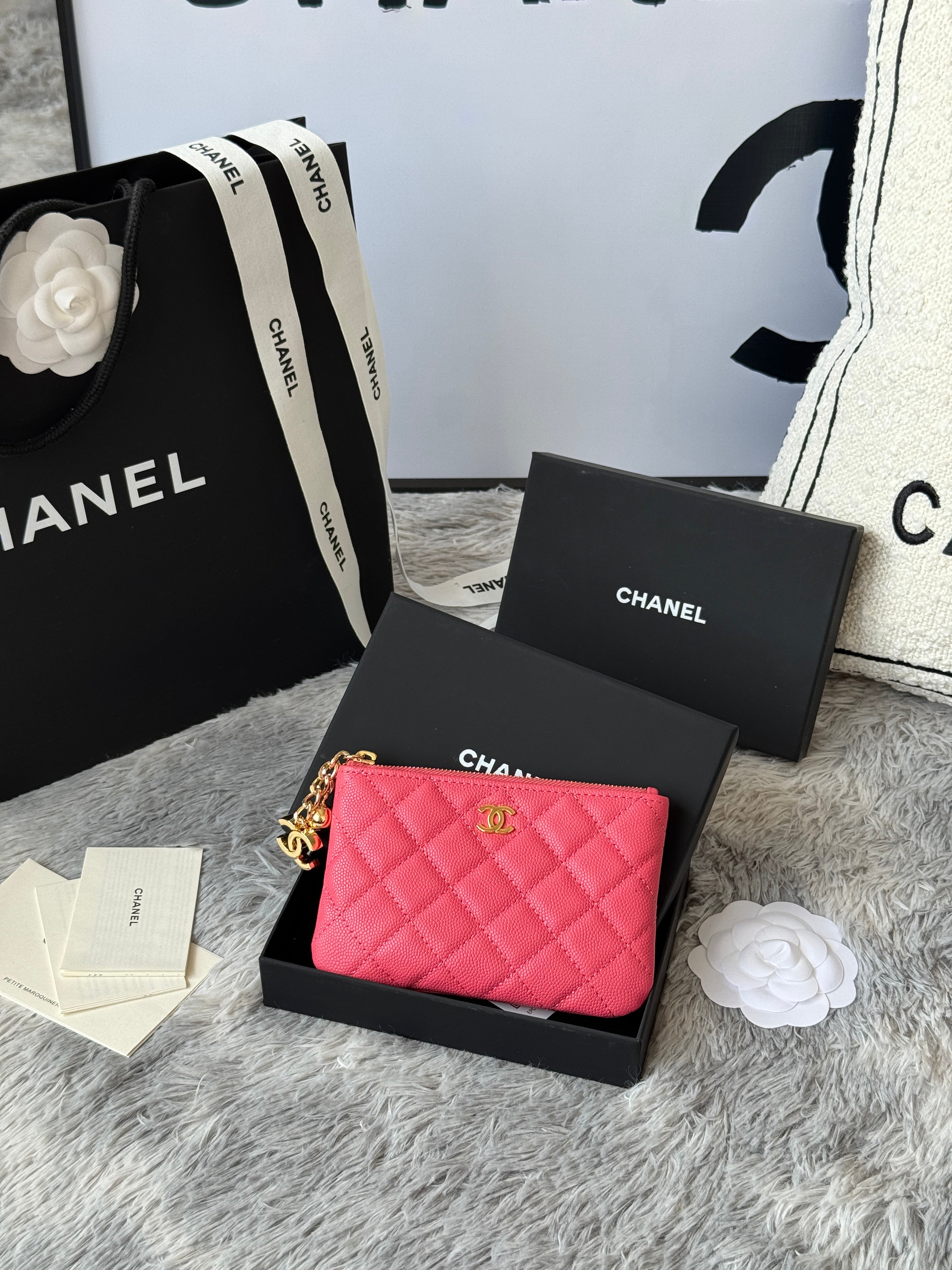 CC CLASSIC ZIPPED POUCH 14 IN CHESTNUT ROSE PINK GRAINED CALFSKIN GOLD-TONE CHARM CHAIN