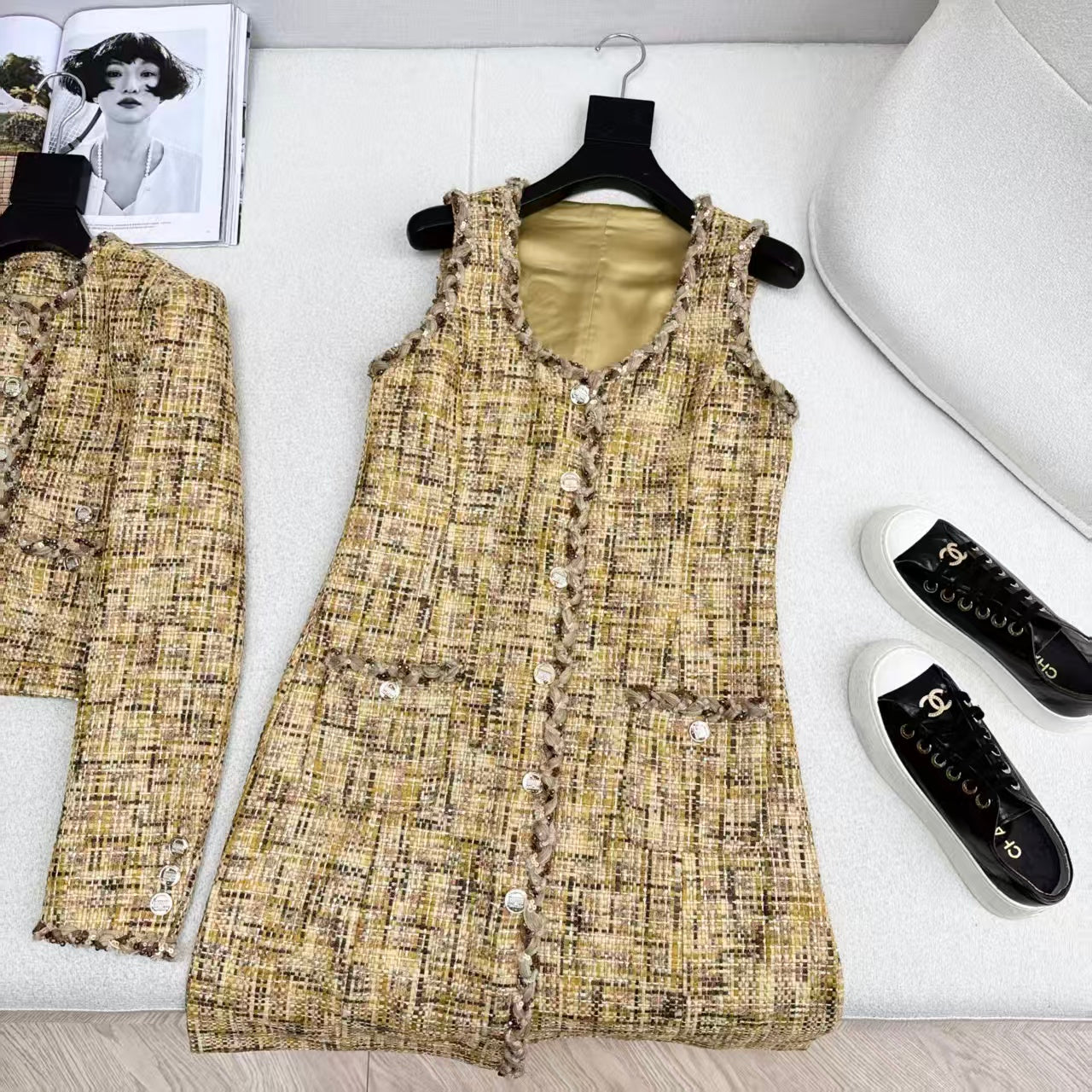 CC DRESS IN YELLOW MIX BROWN TWEED
