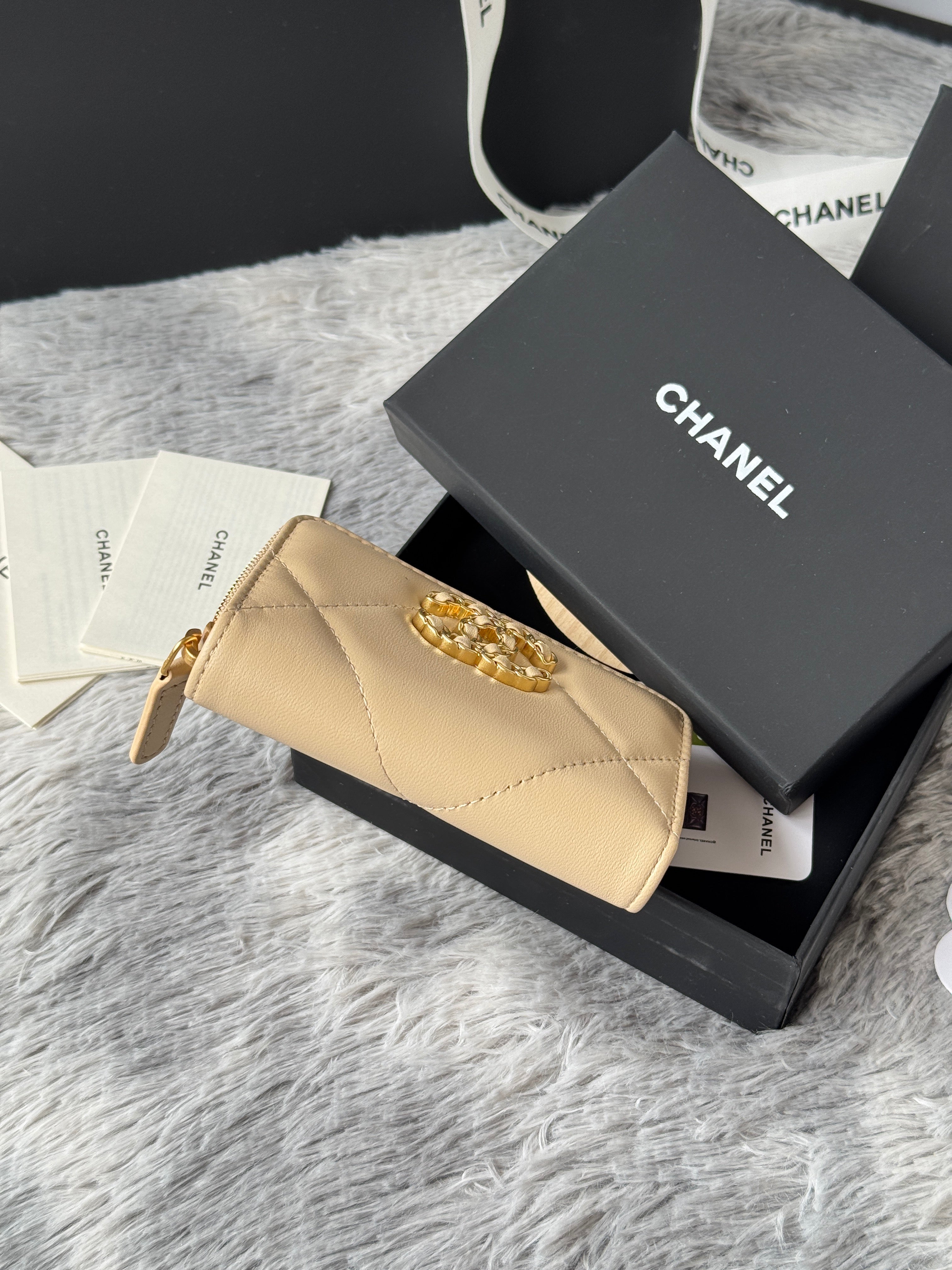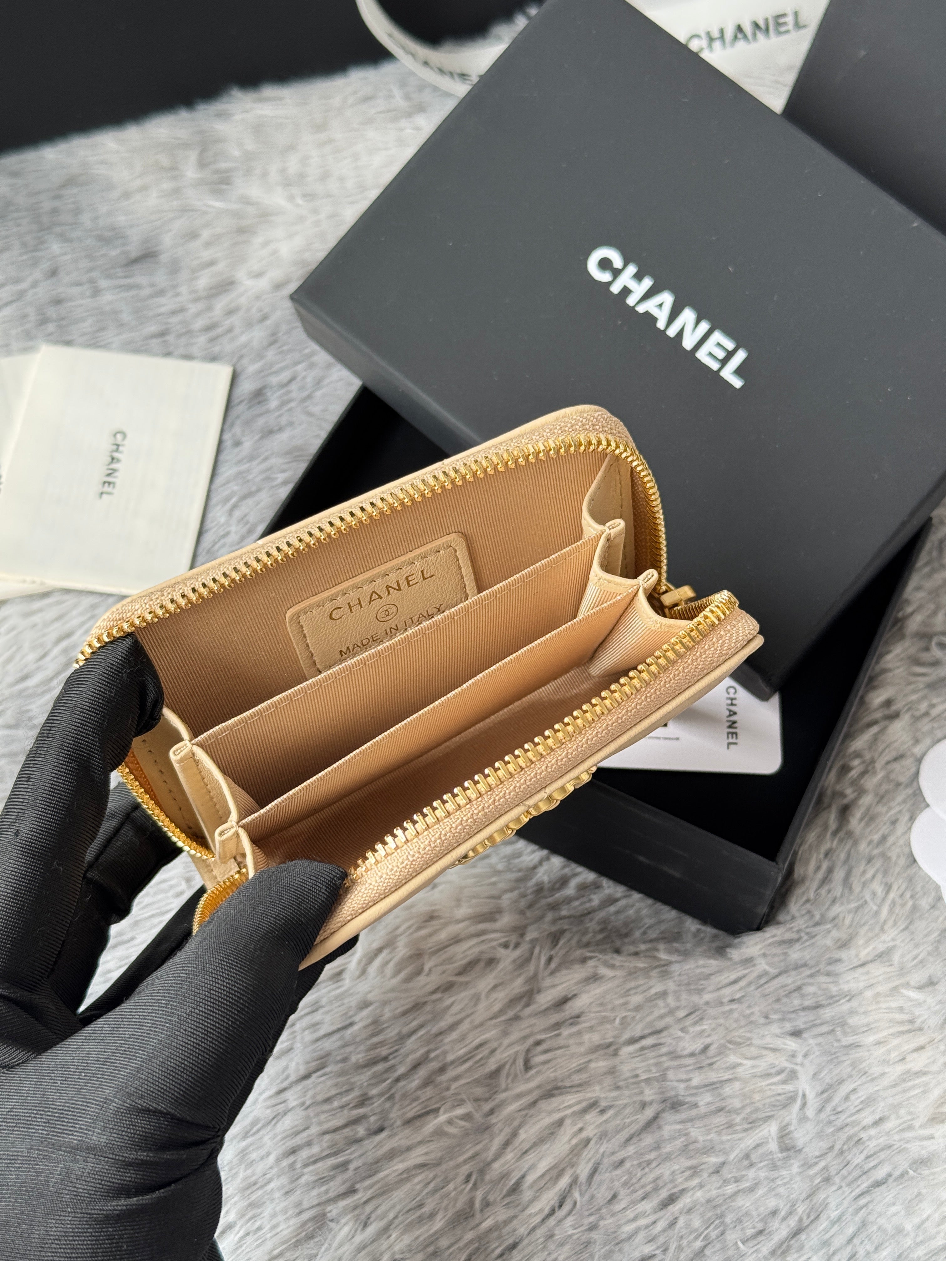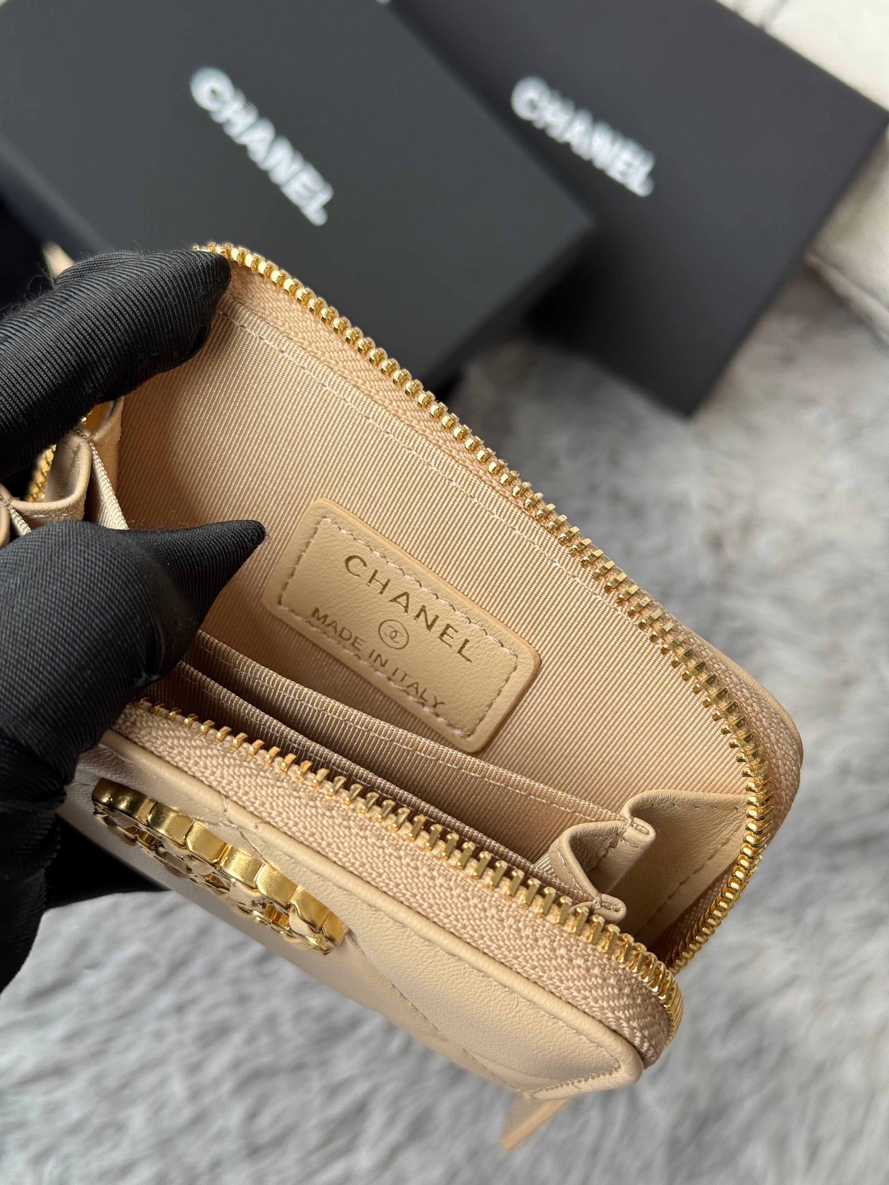 CC ZIPPED CARD HOLDER 11 IN BEIGE LAMBSKIN GOLD-TONE METALLIC