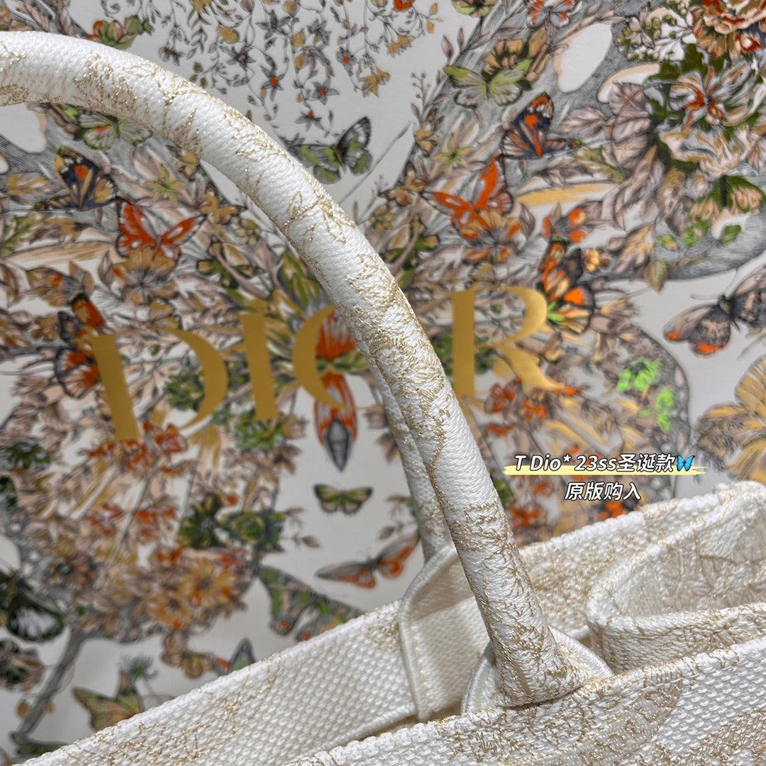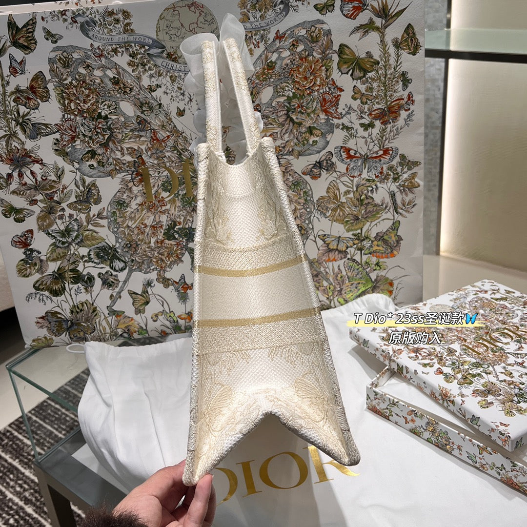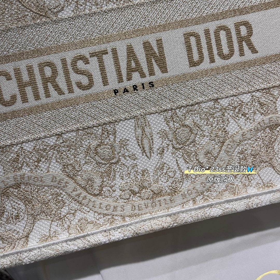 CD BOOK TOTE BAG 36 IN IVORY BEIGE EMBROIDERED CANVAS