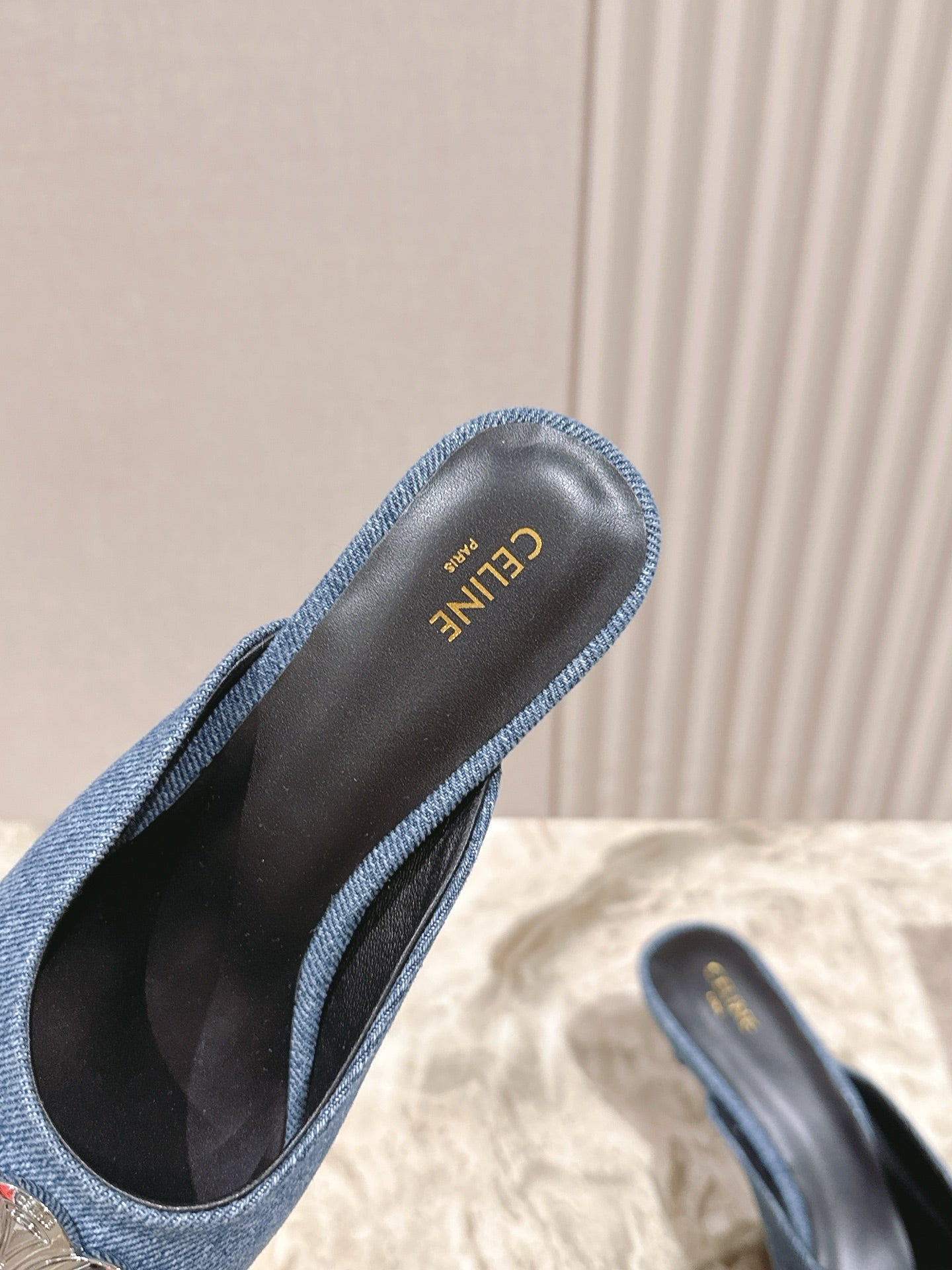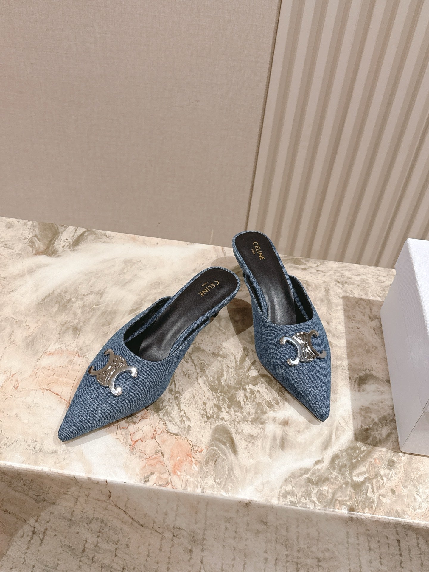 CELINE 25S ALMA TRIOMPHE MULE 45MM IN DENIM SILVER HARDWARE