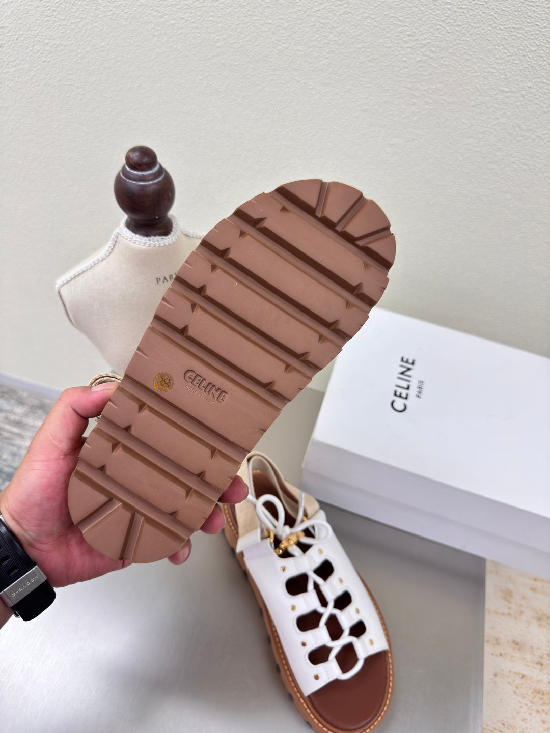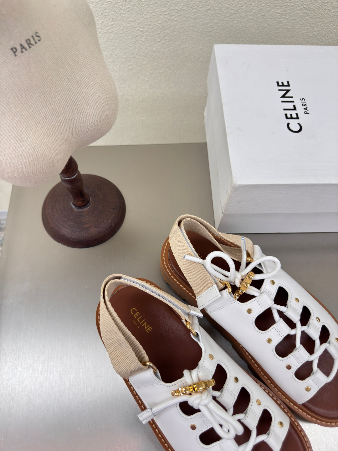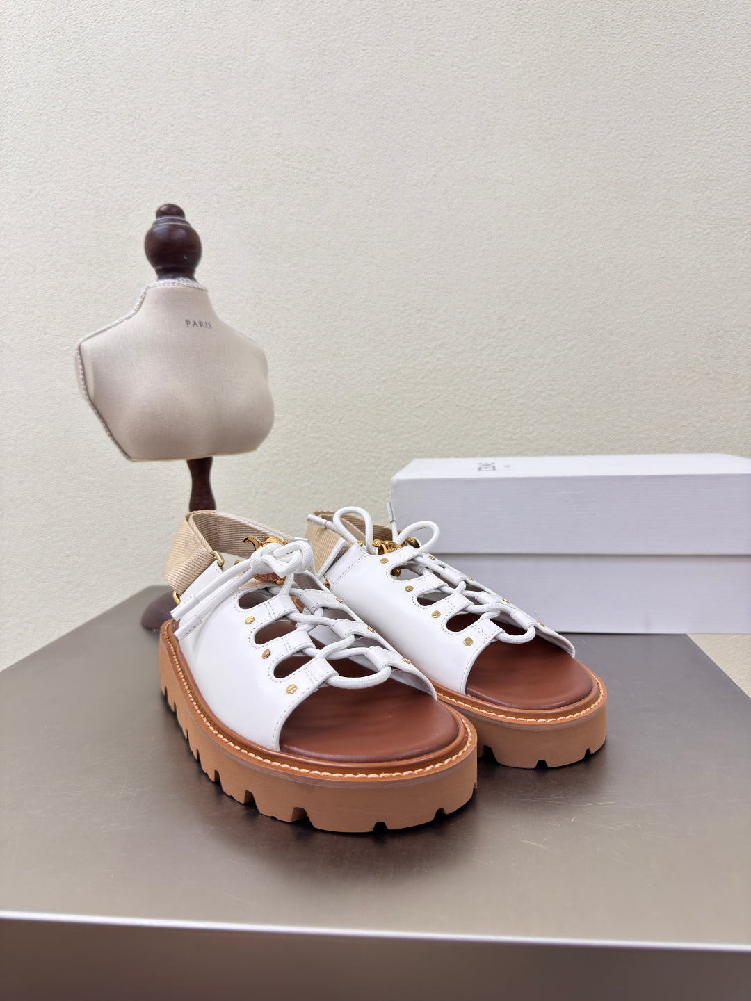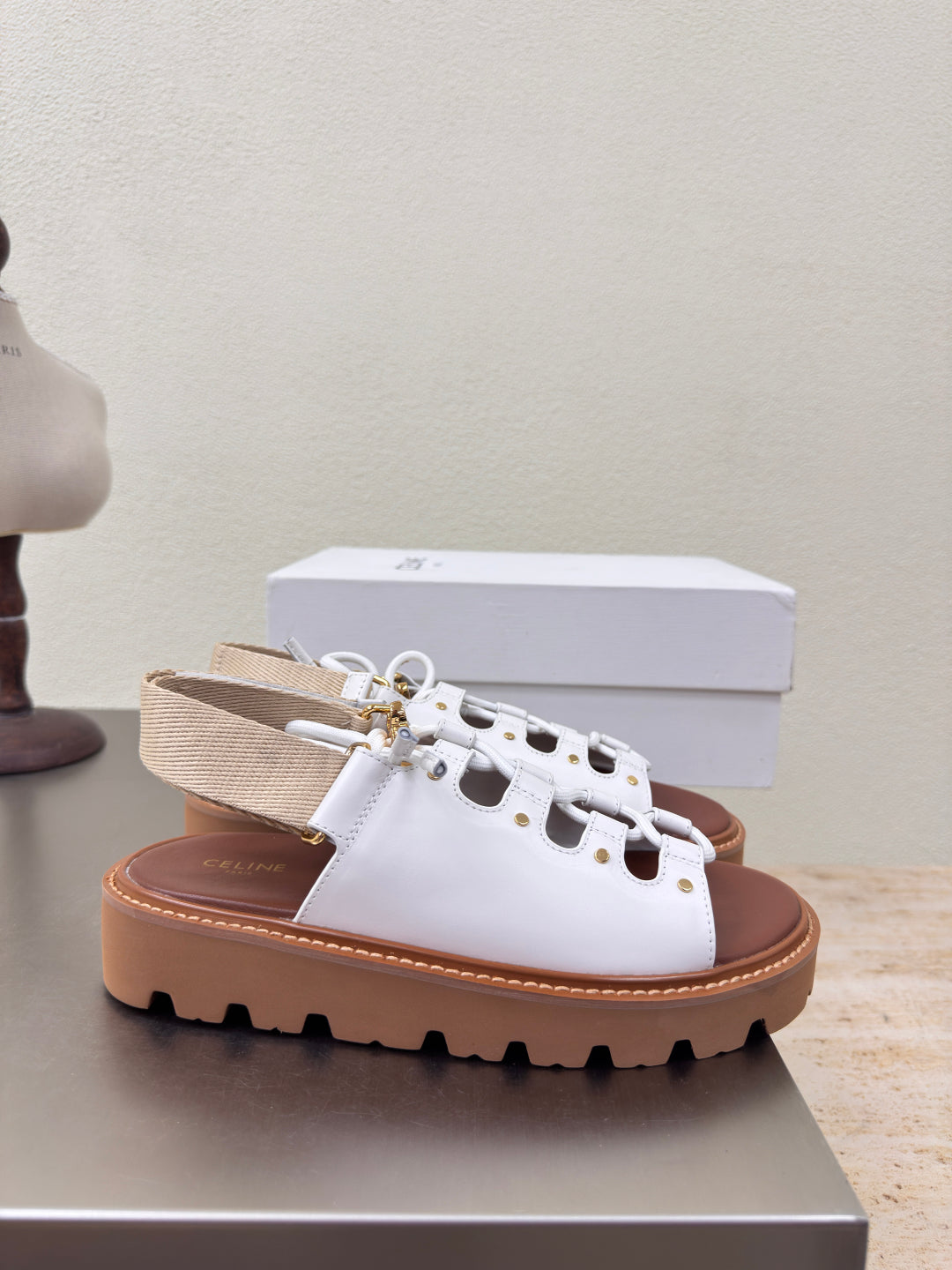 CELINE 25S BILLIE CHUNKY SANDAL IN WHITE CALFSKIN AND TEXTILE