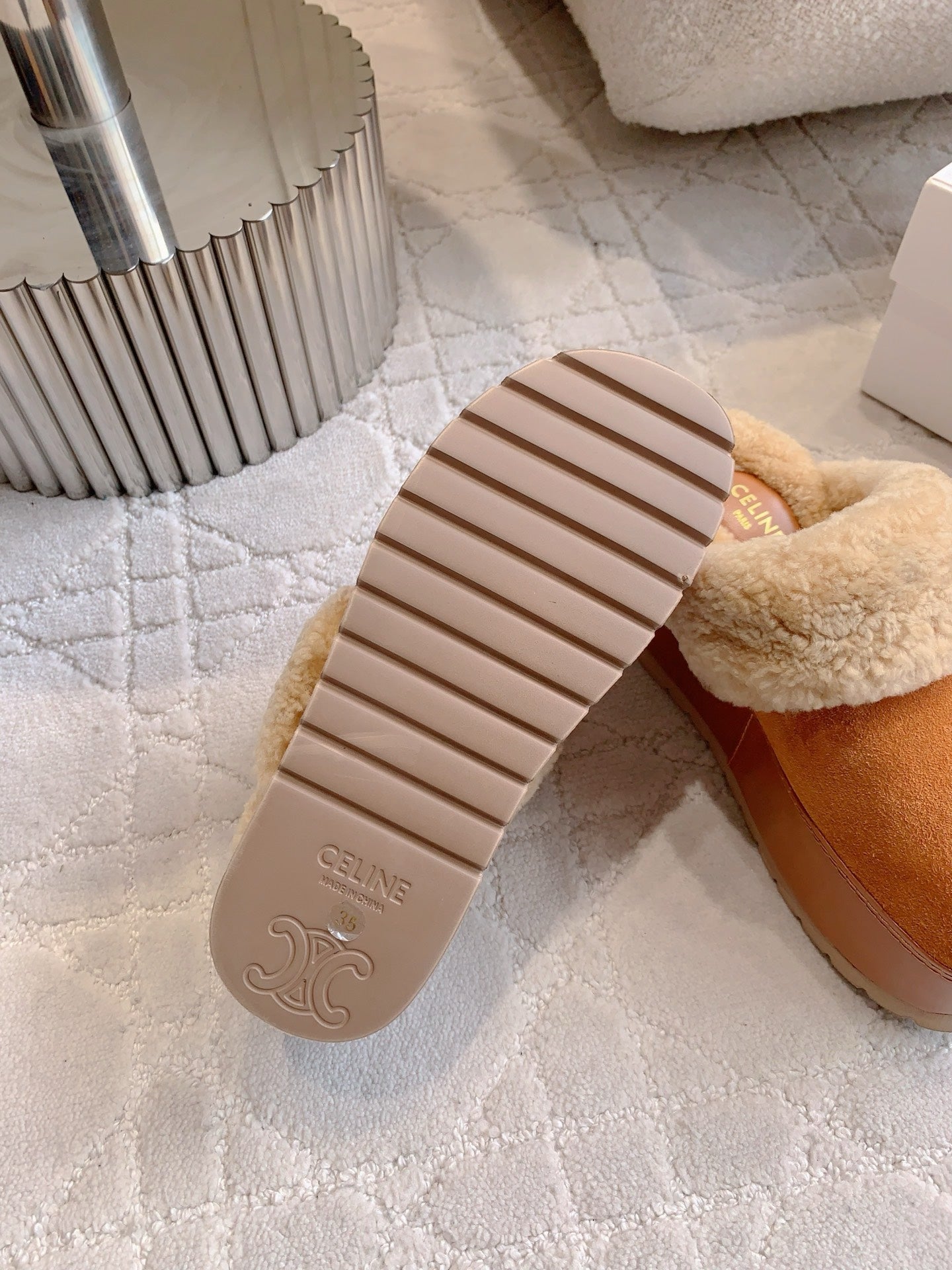 CELINE 25S DANA WEDGE MULE 70MM IN BURNT ORANGE SUEDE CALFSKIN AND SHEARLING