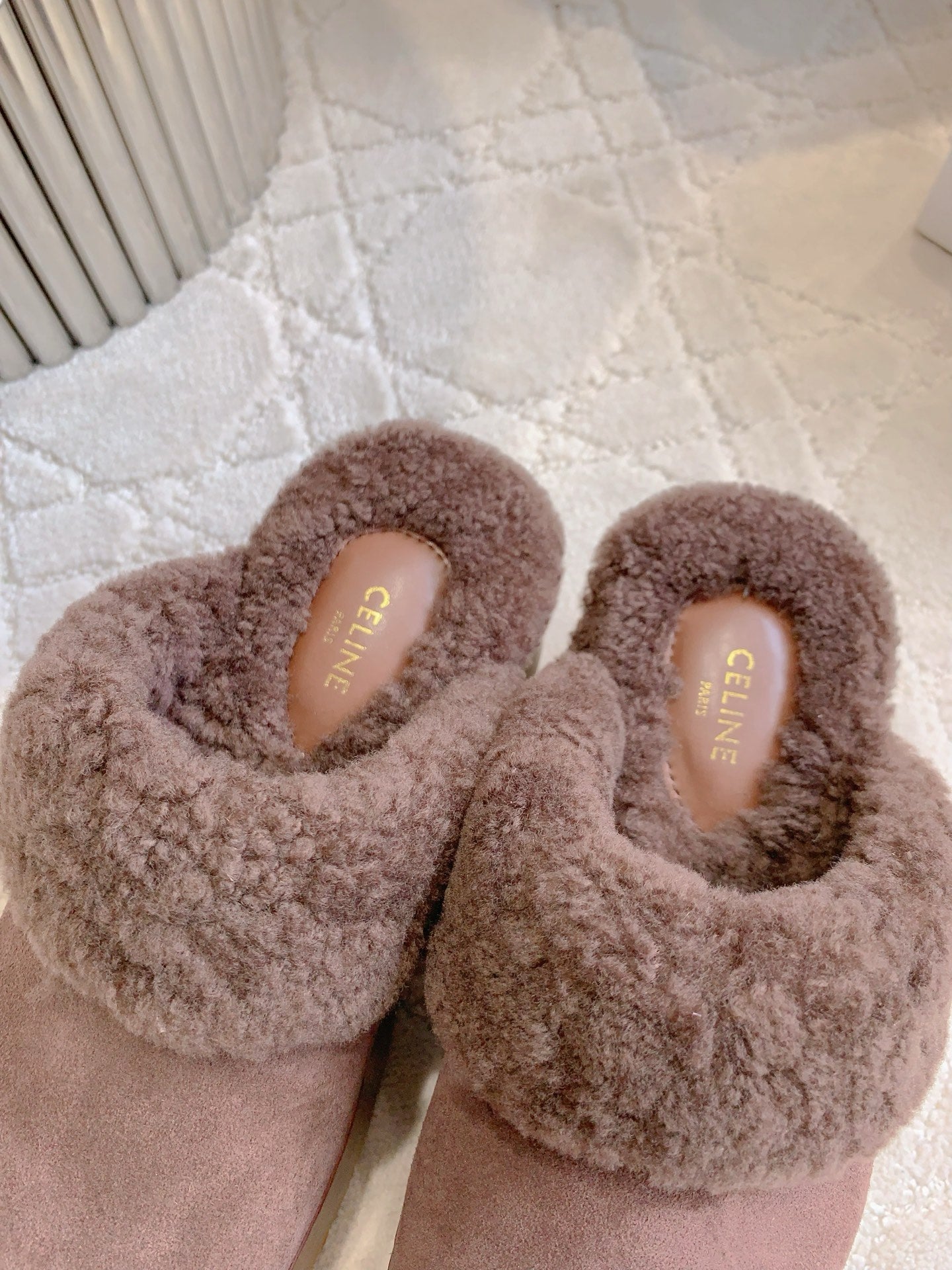 CELINE 25S DANA WEDGE MULE 70MM IN DARK BROWN SUEDE CALFSKIN AND SHEARLING
