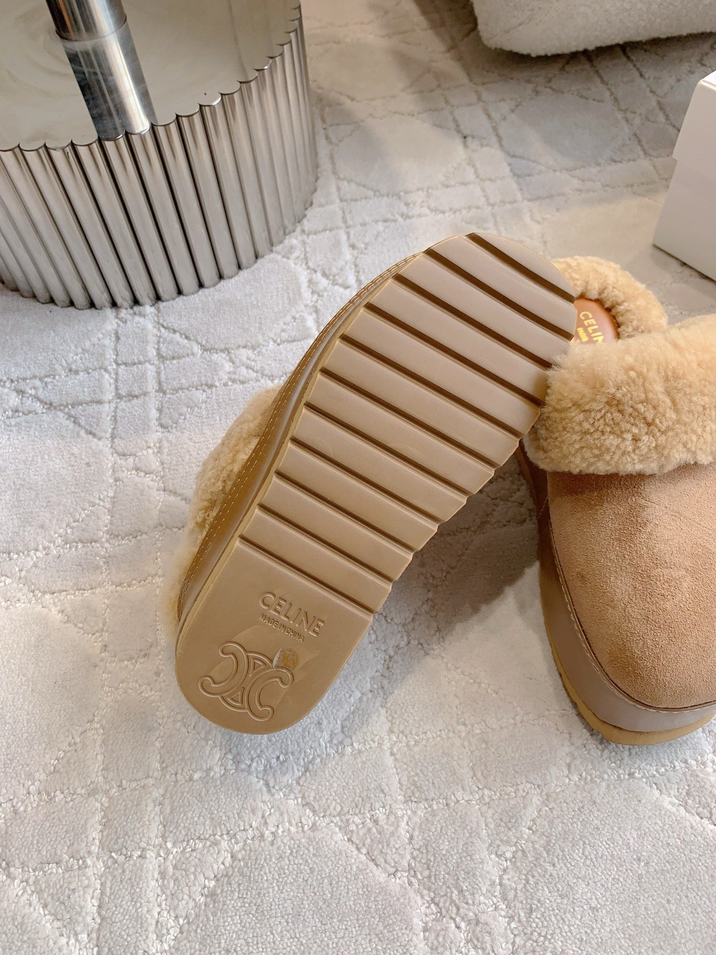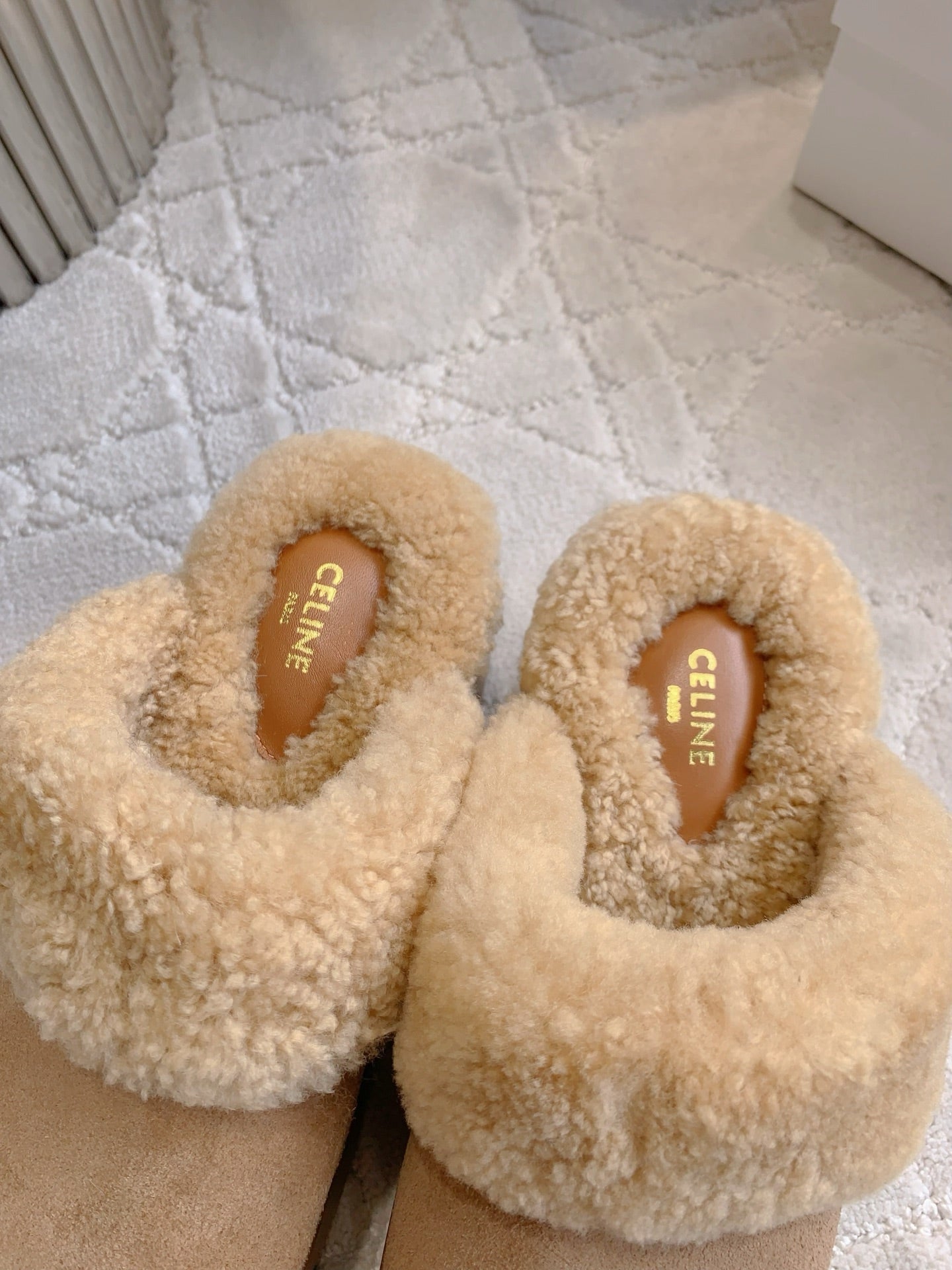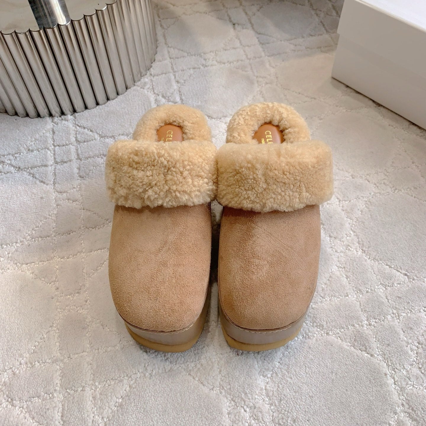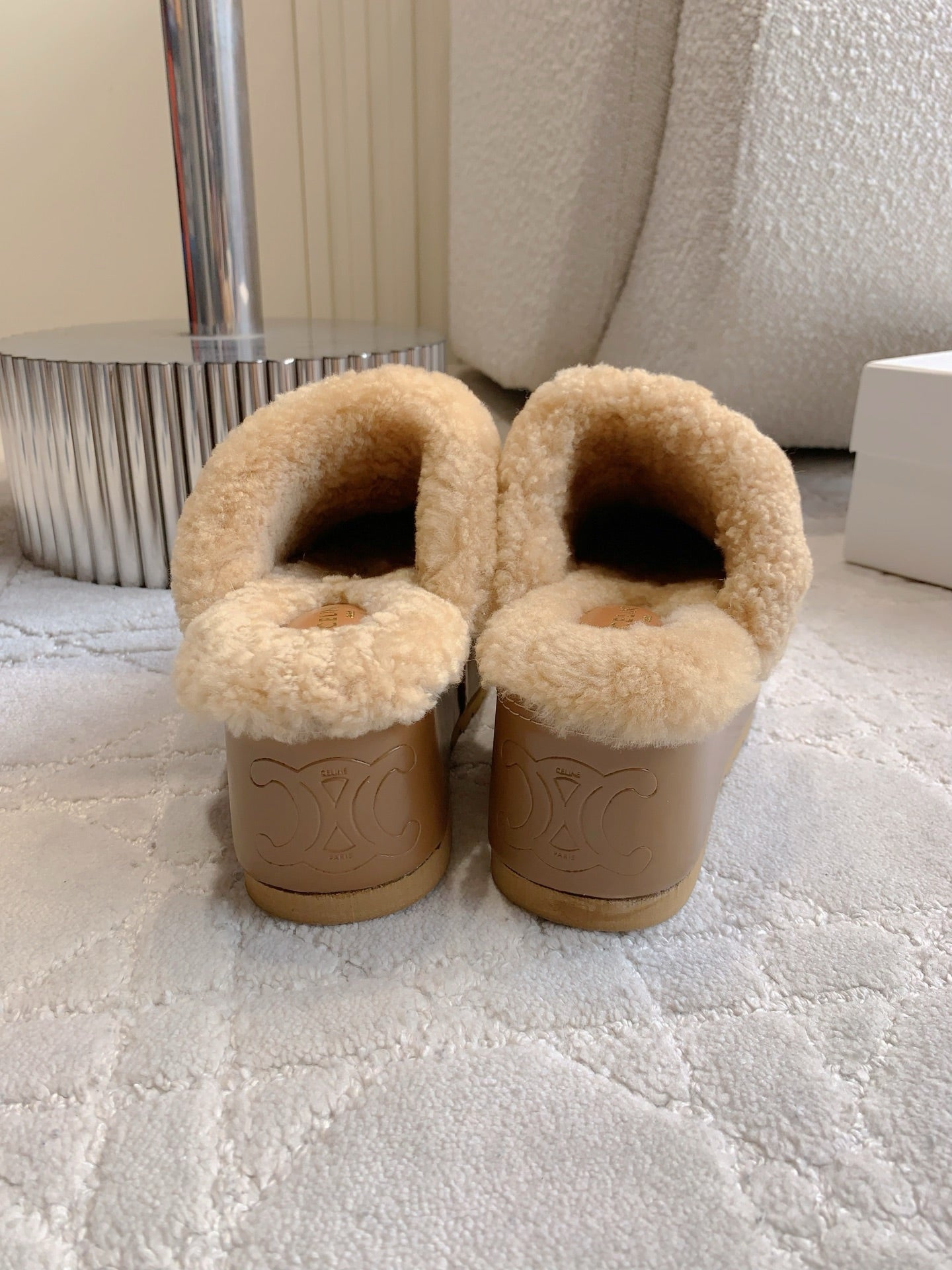 CELINE 25S DANA WEDGE MULE 70MM IN LIGHT BROWN SUEDE CALFSKIN AND SHEARLING