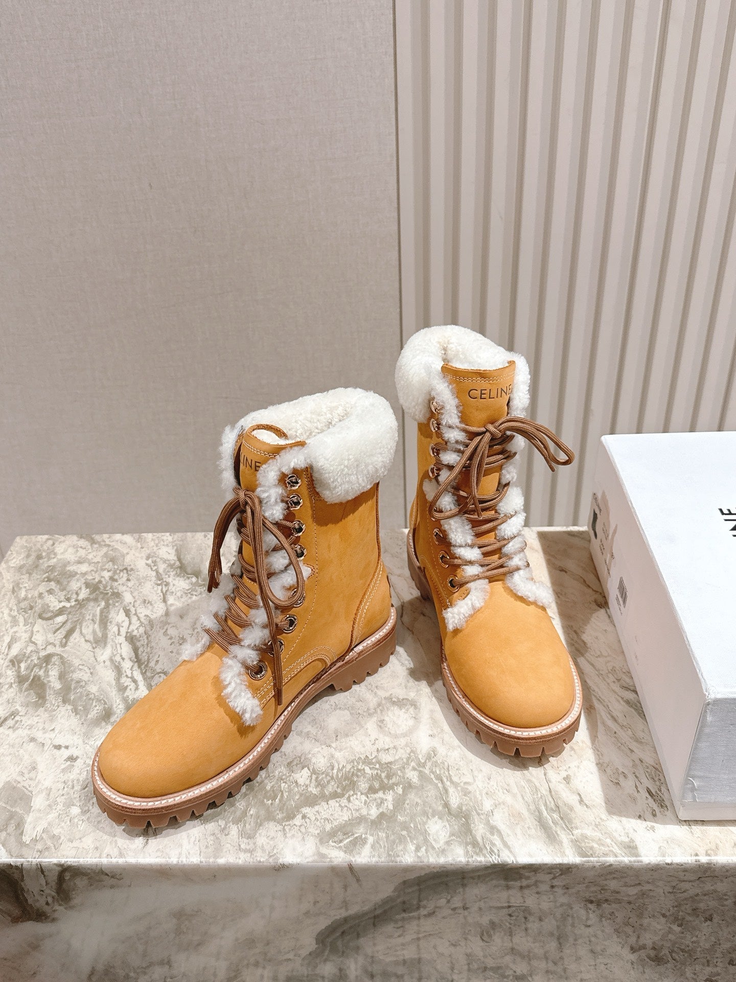 CELINE 25S KURT LACE UP MID BOOT IN MEDIUM ORANGE SUEDE AND SHEARLING