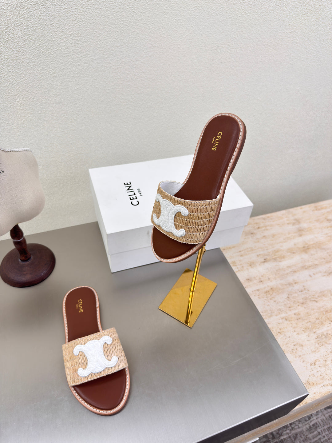 CELINE 25S LYMPIA MULE BEIGE RAFFIA WHITE WOOL LOGO