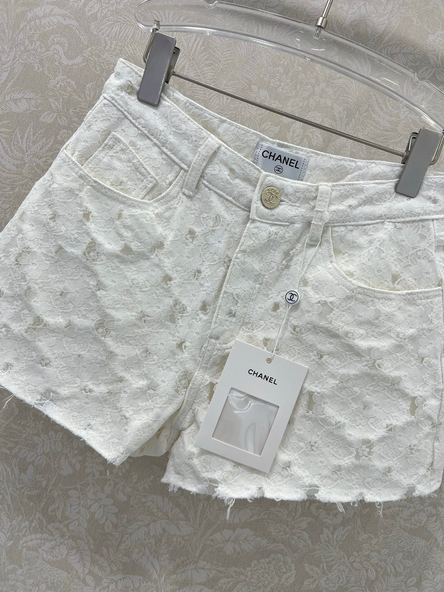 CHANEL LACE-TRIMMED DENIM SHORTS 275066