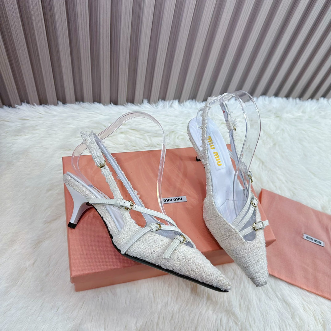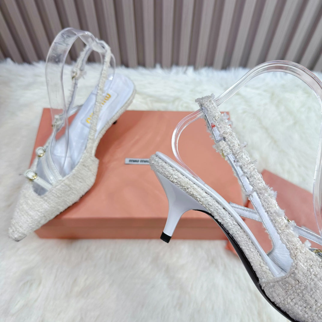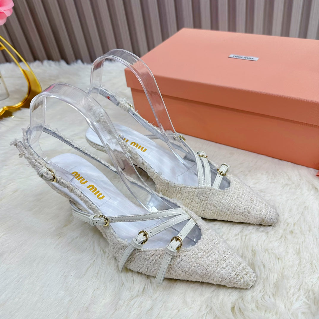 CROSS STRAP HIGH HEELED SLINGBACK IN BEIGE TWEED