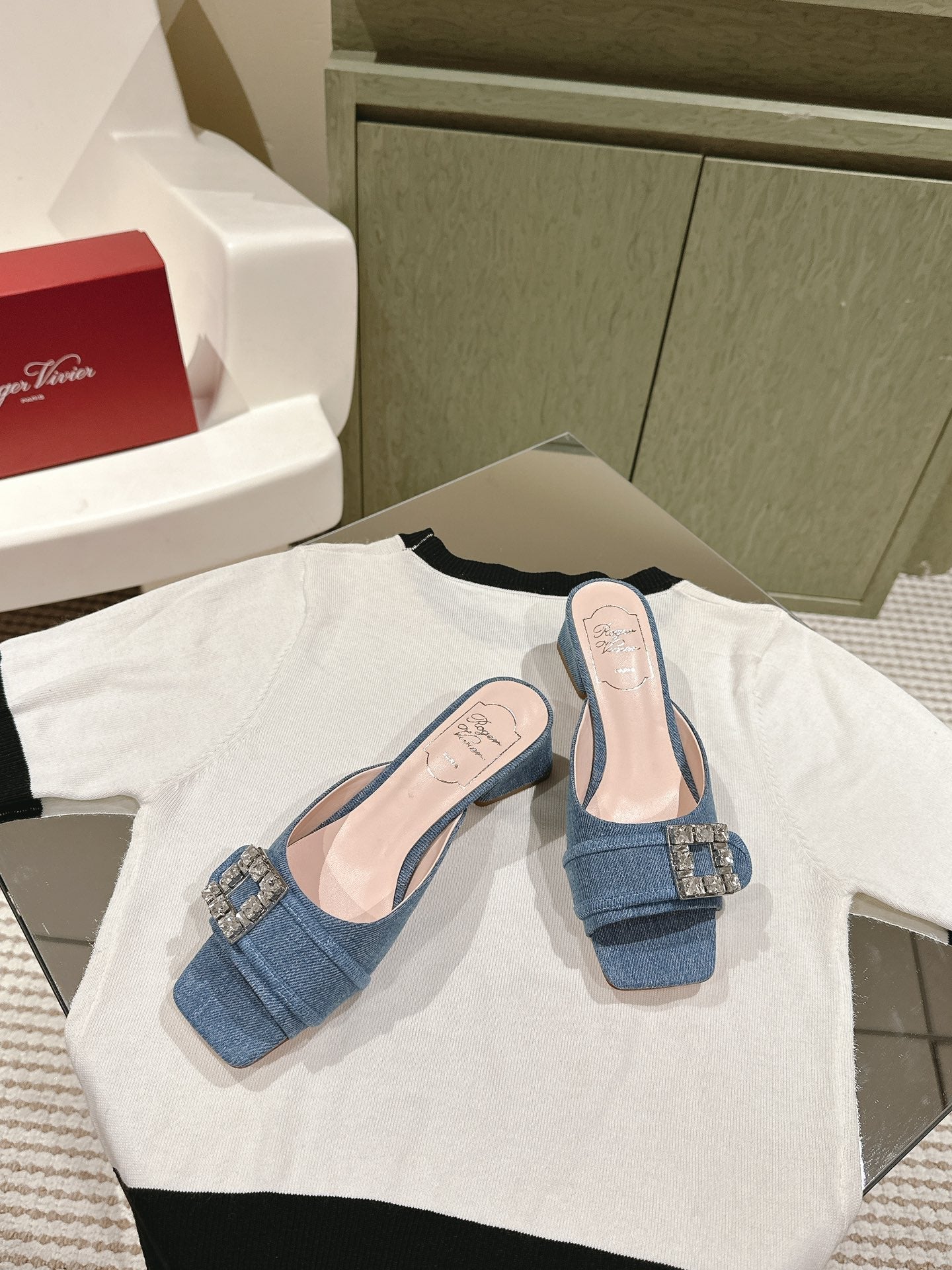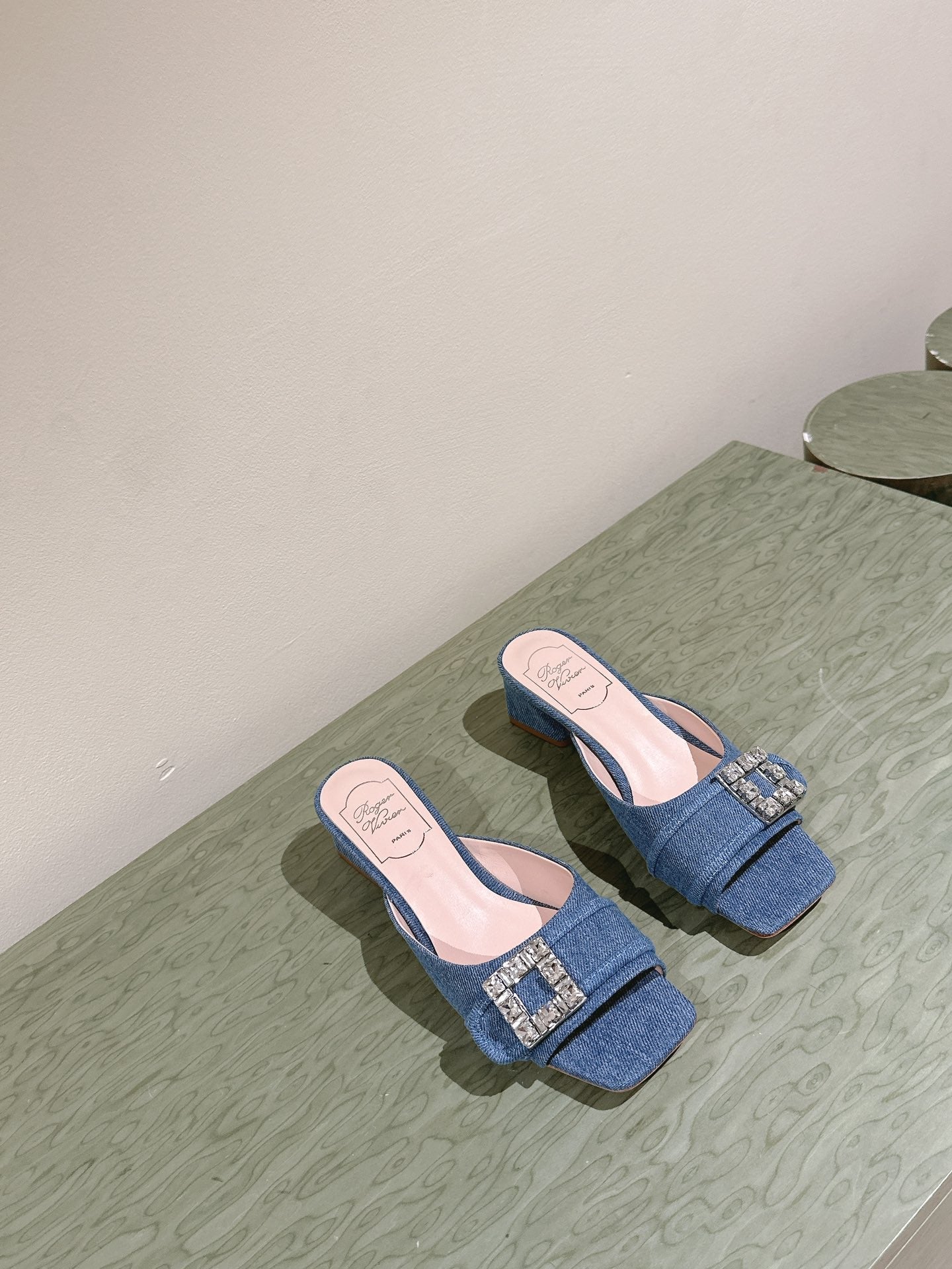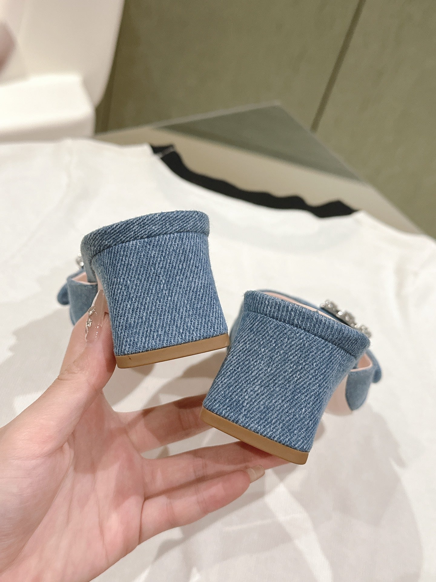 CRYSTAL HEEL MULE IN BLUE DENIM WITH EMBELLISHED BUCKLE