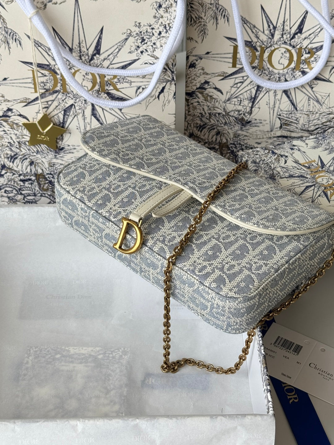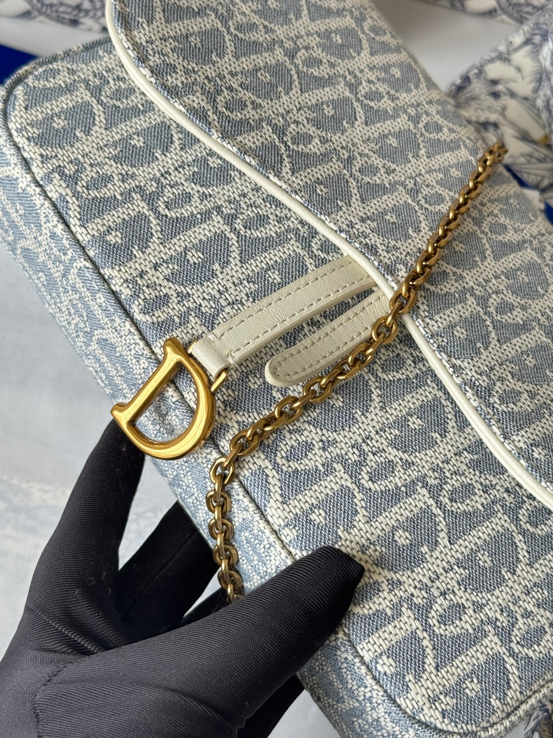 DIOR 25S MEDIUM SADDLE POUCH WITH CHAIN 21 IN LIGHT BLUE DIOR OBLIQUE JACQUARD CANVAS
