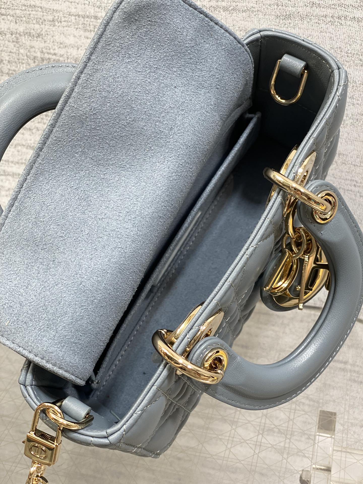 DIOR 25S SMALL LADY D‑JOY BAG 19 IN STEEL BLUE GRAY CANNAGE CALFSKIN GOLD HARDWARE