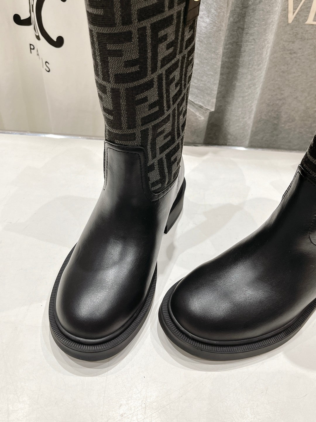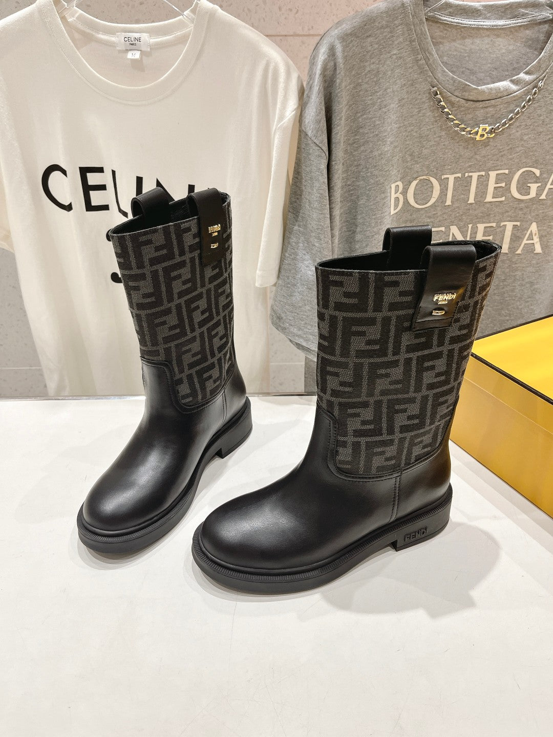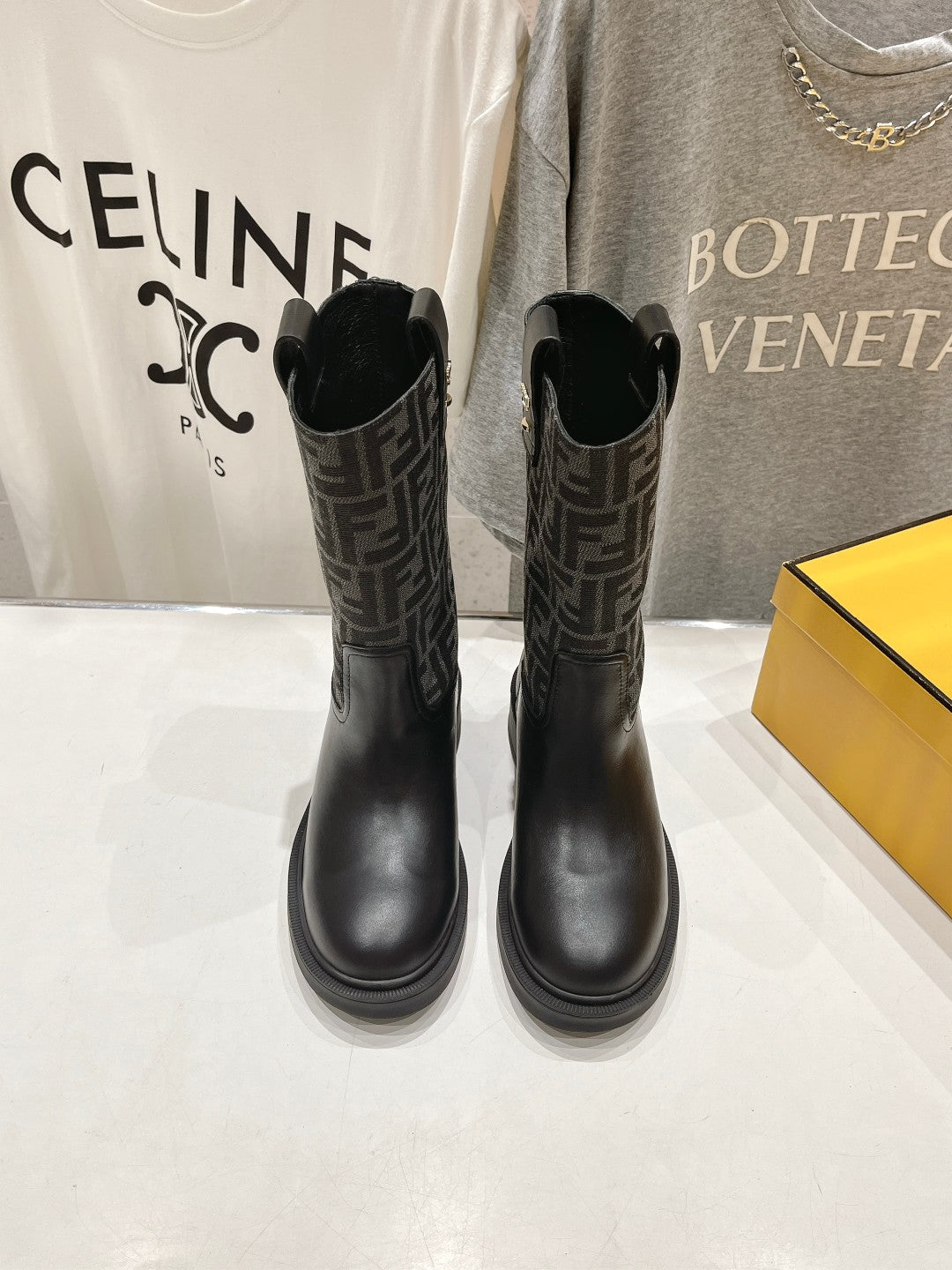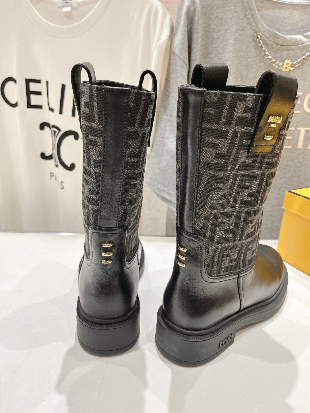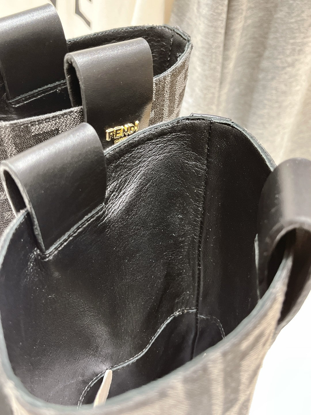 FENDI 25S ANKLE BOOTS IN BLACK COWHIDE AND CANVAS LOGO EMBOSSING
