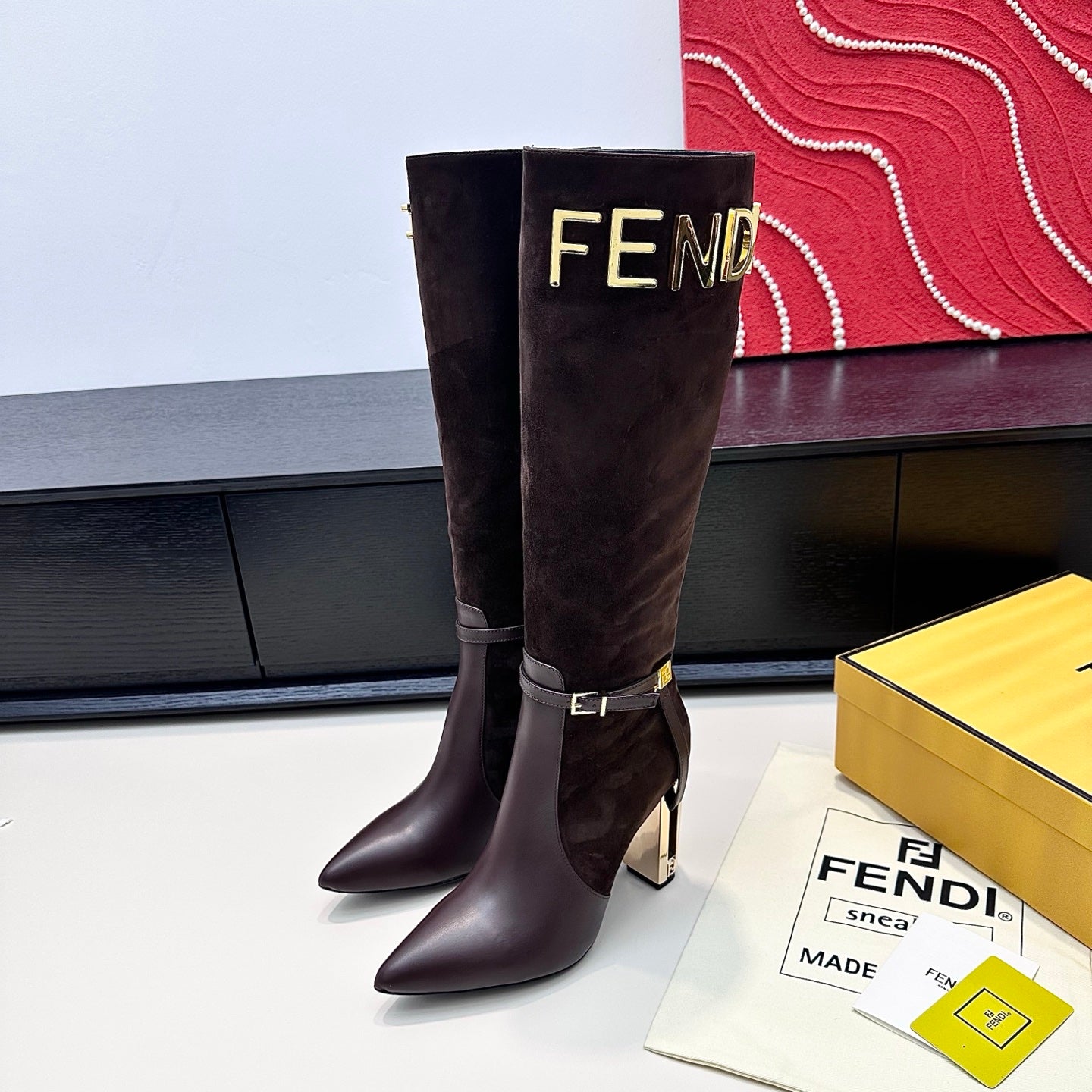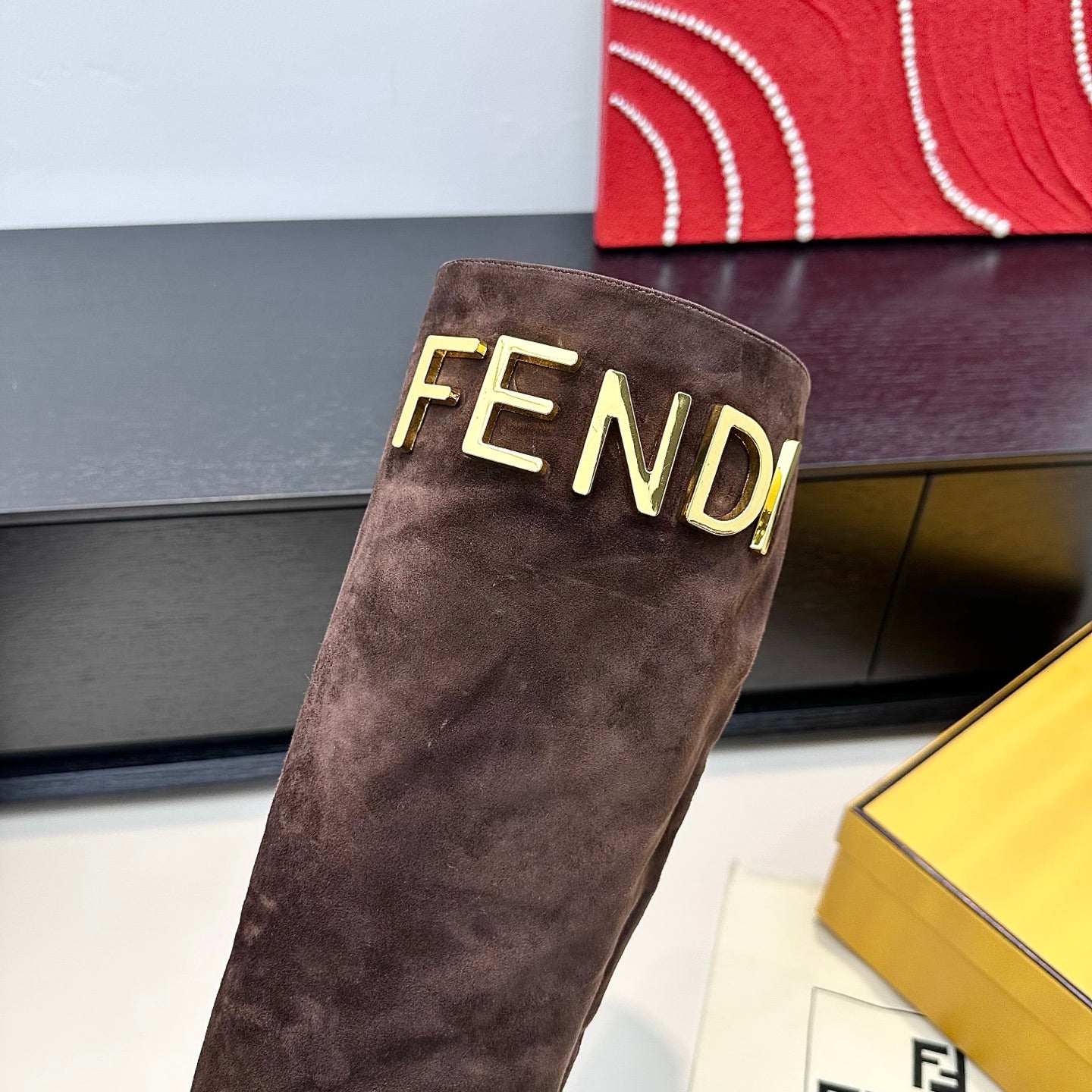 FENDI 25S HIGH-CUT METALLIC HEEL BOOTS 100 MM IN DARK BROWN SUEDE AND CALFSKIN