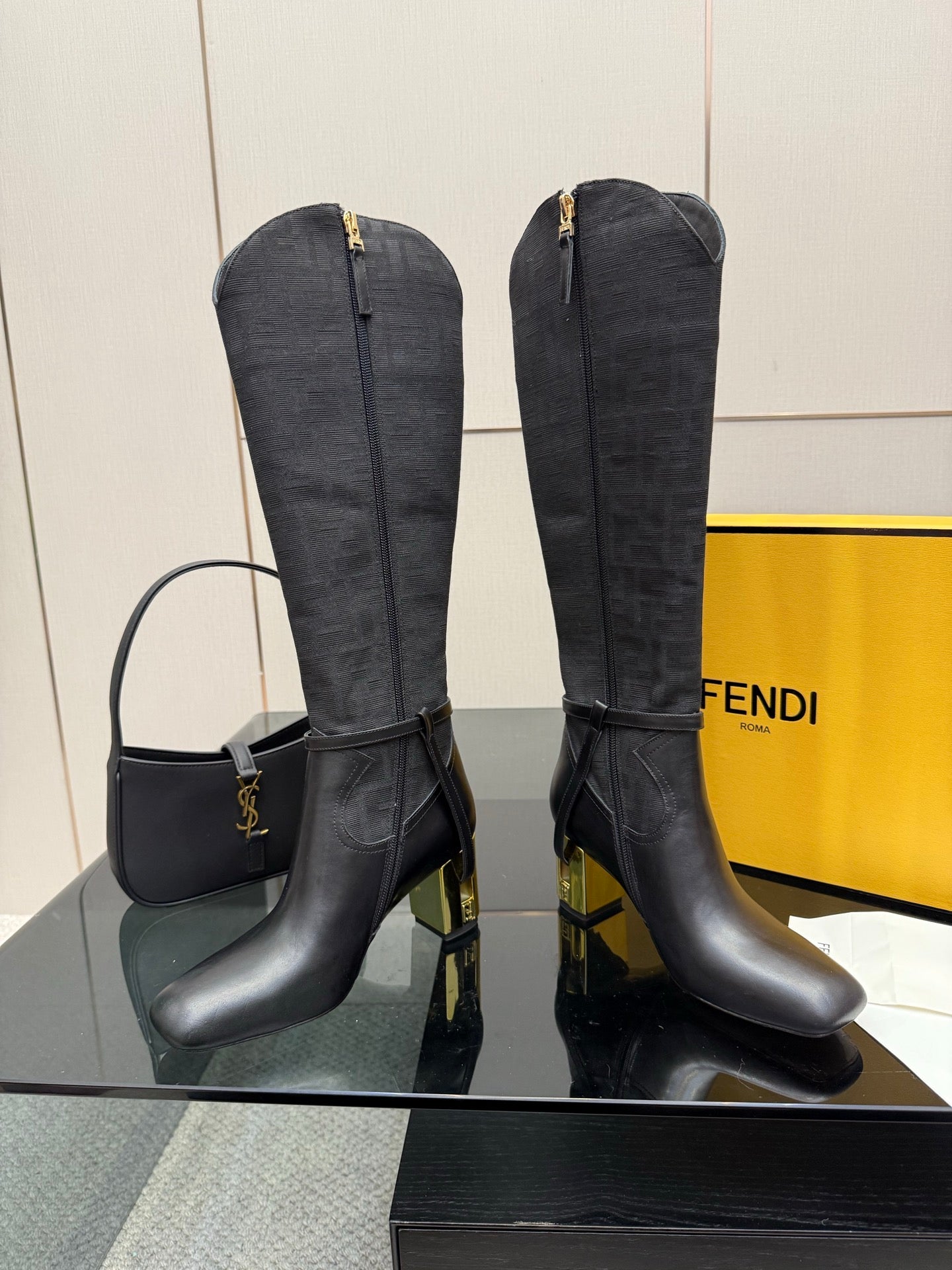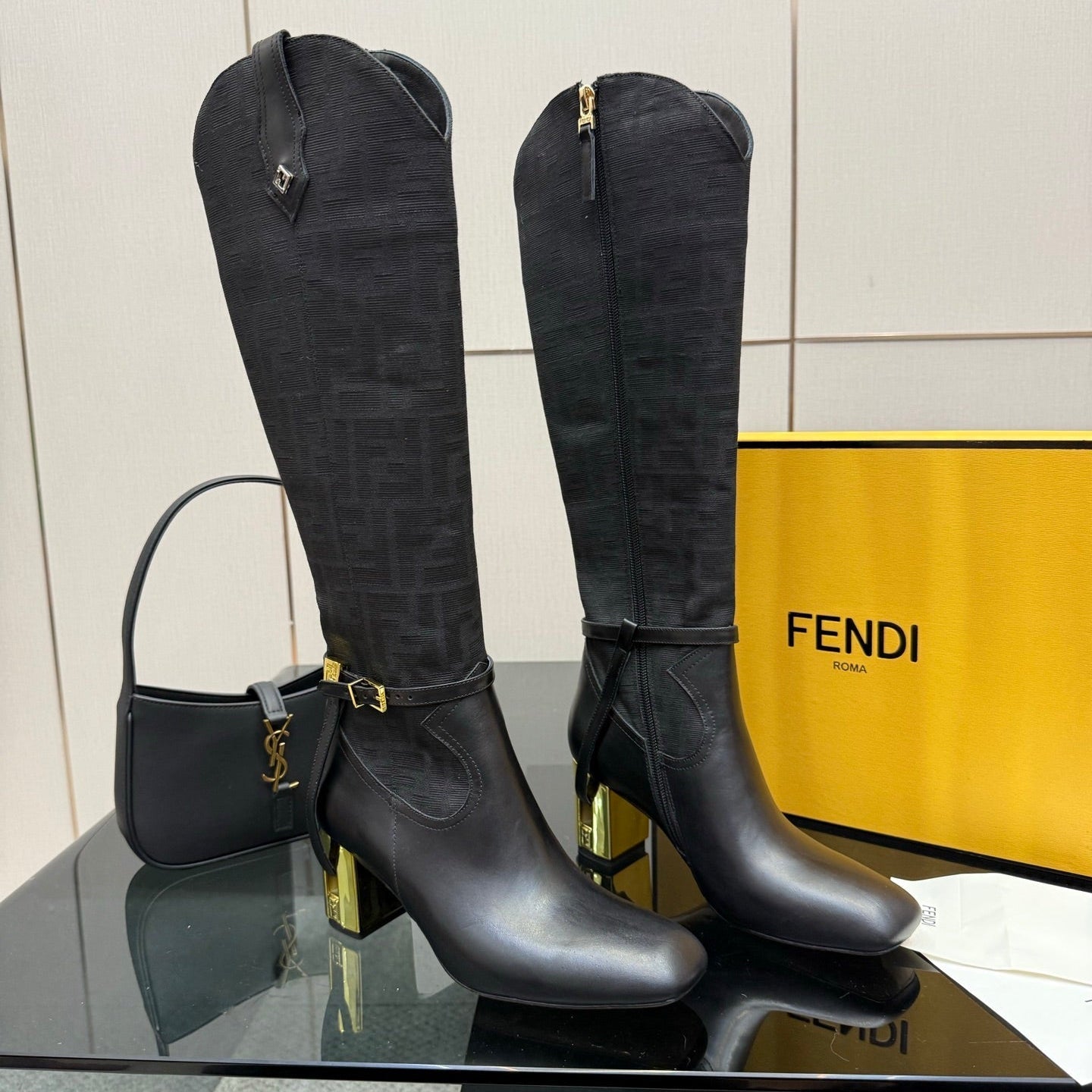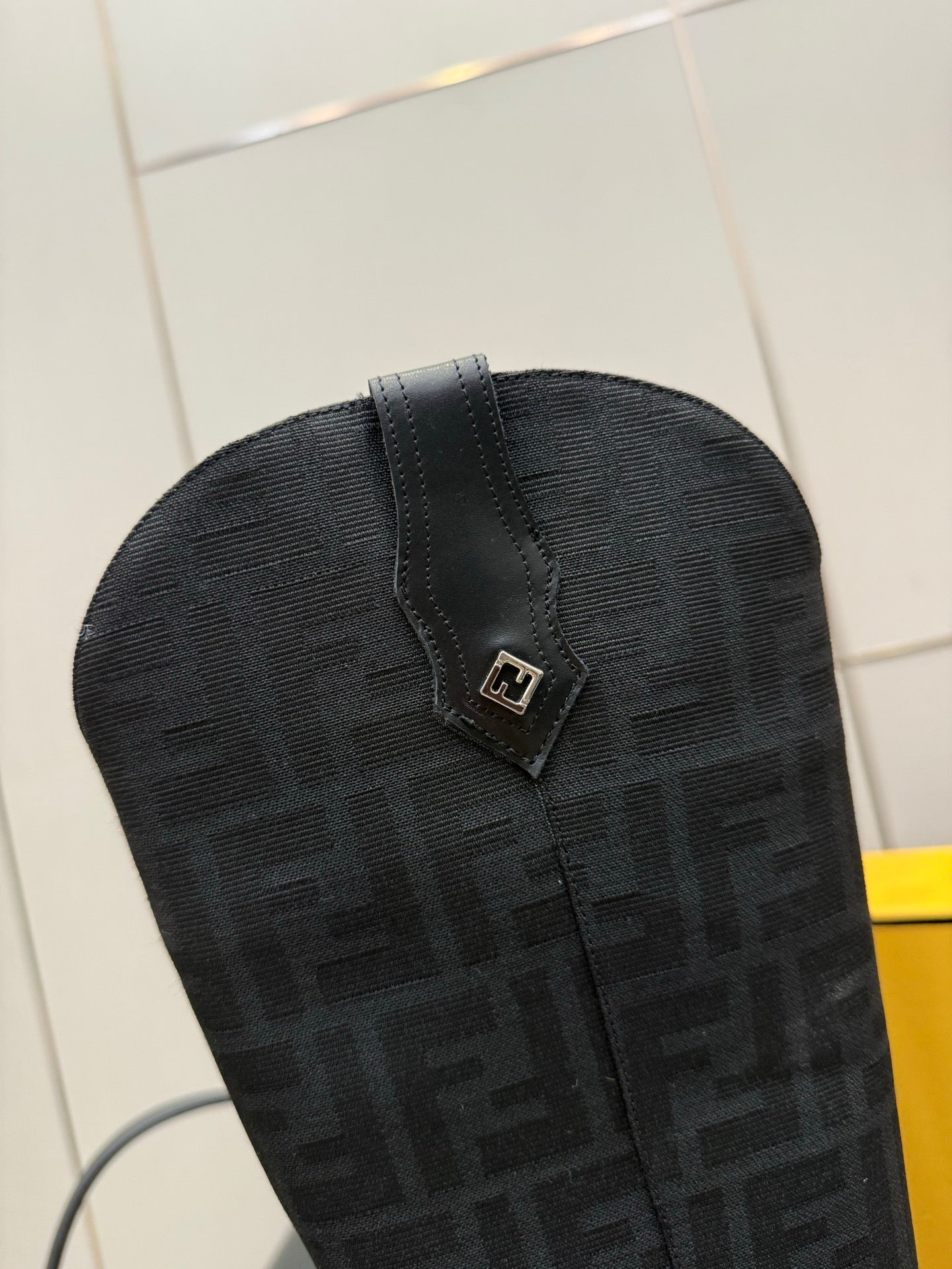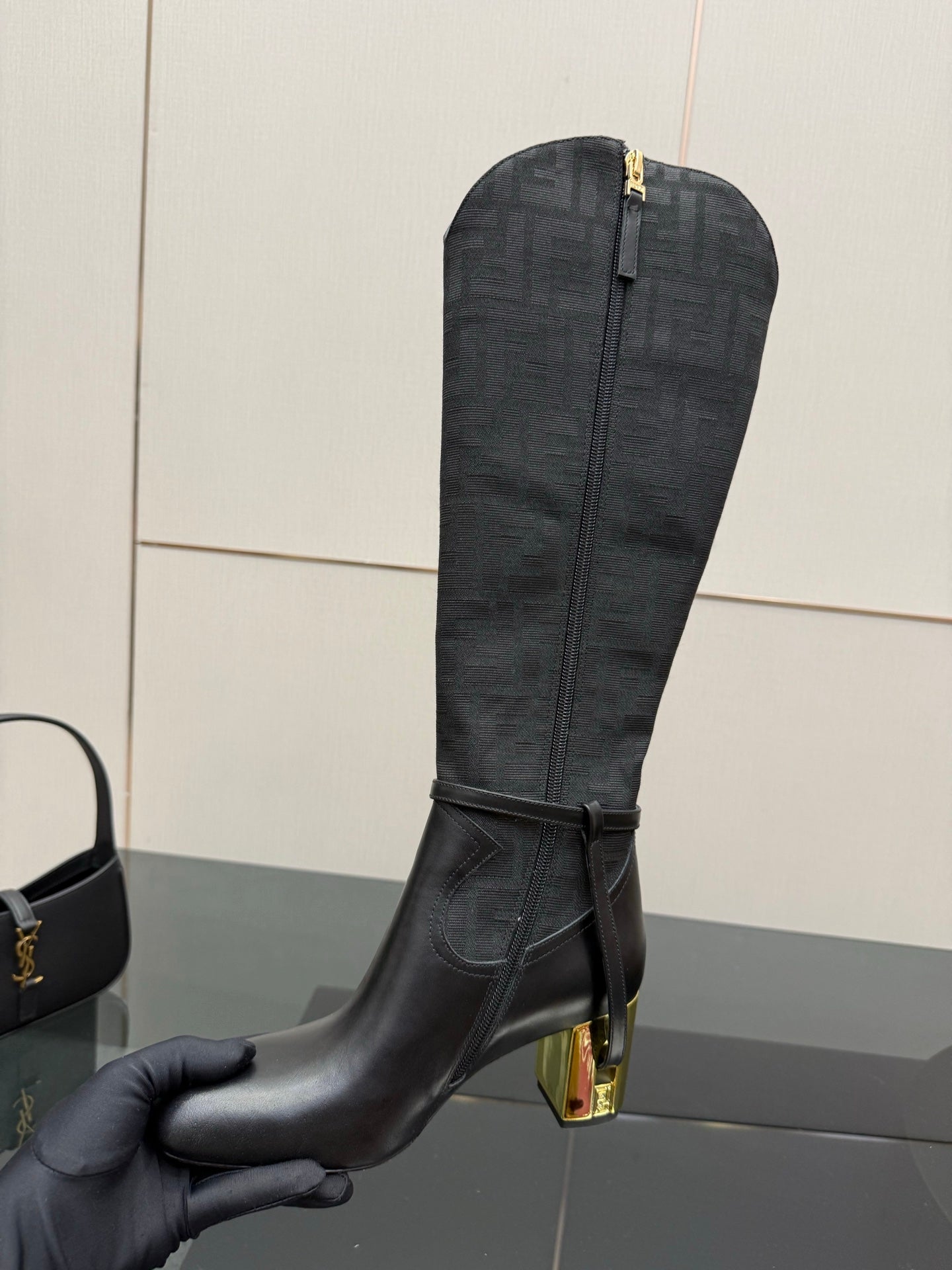 FENDI 25SKNEE-HIGH BOOTS 50 MM IN BLACK CALFSKIN AND FABRIC PRINT LOGO
