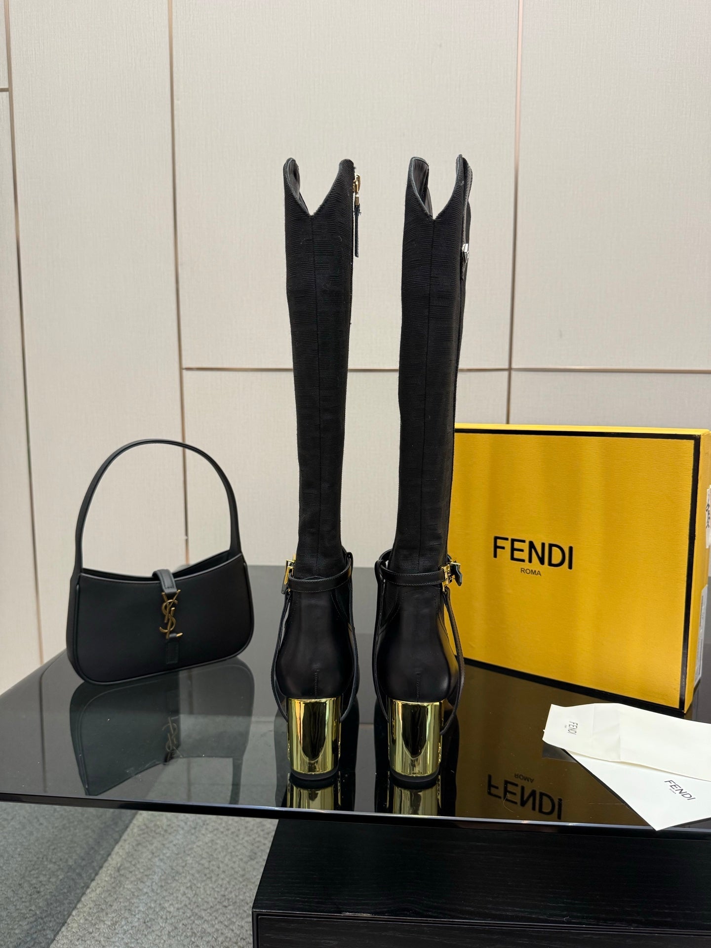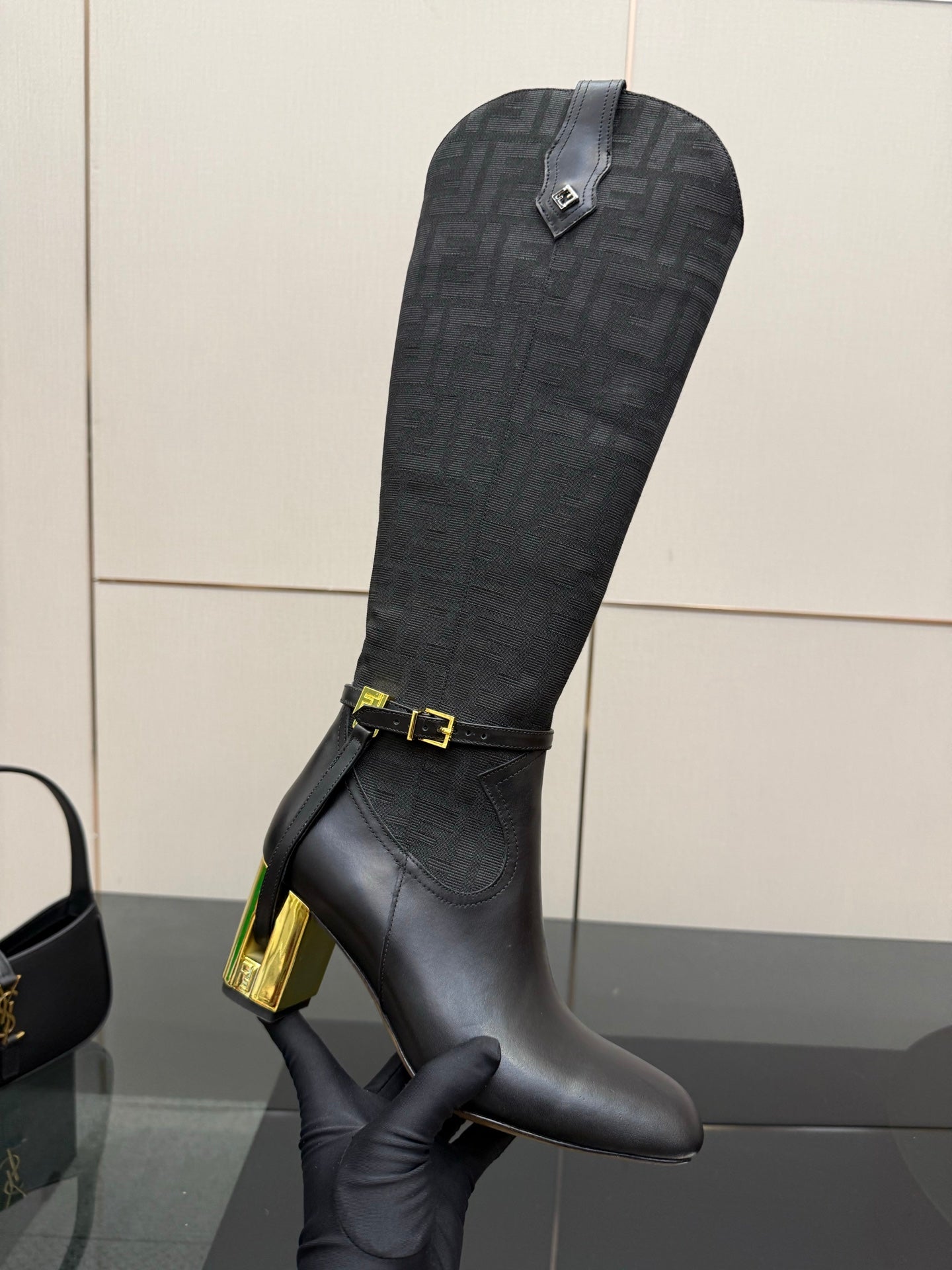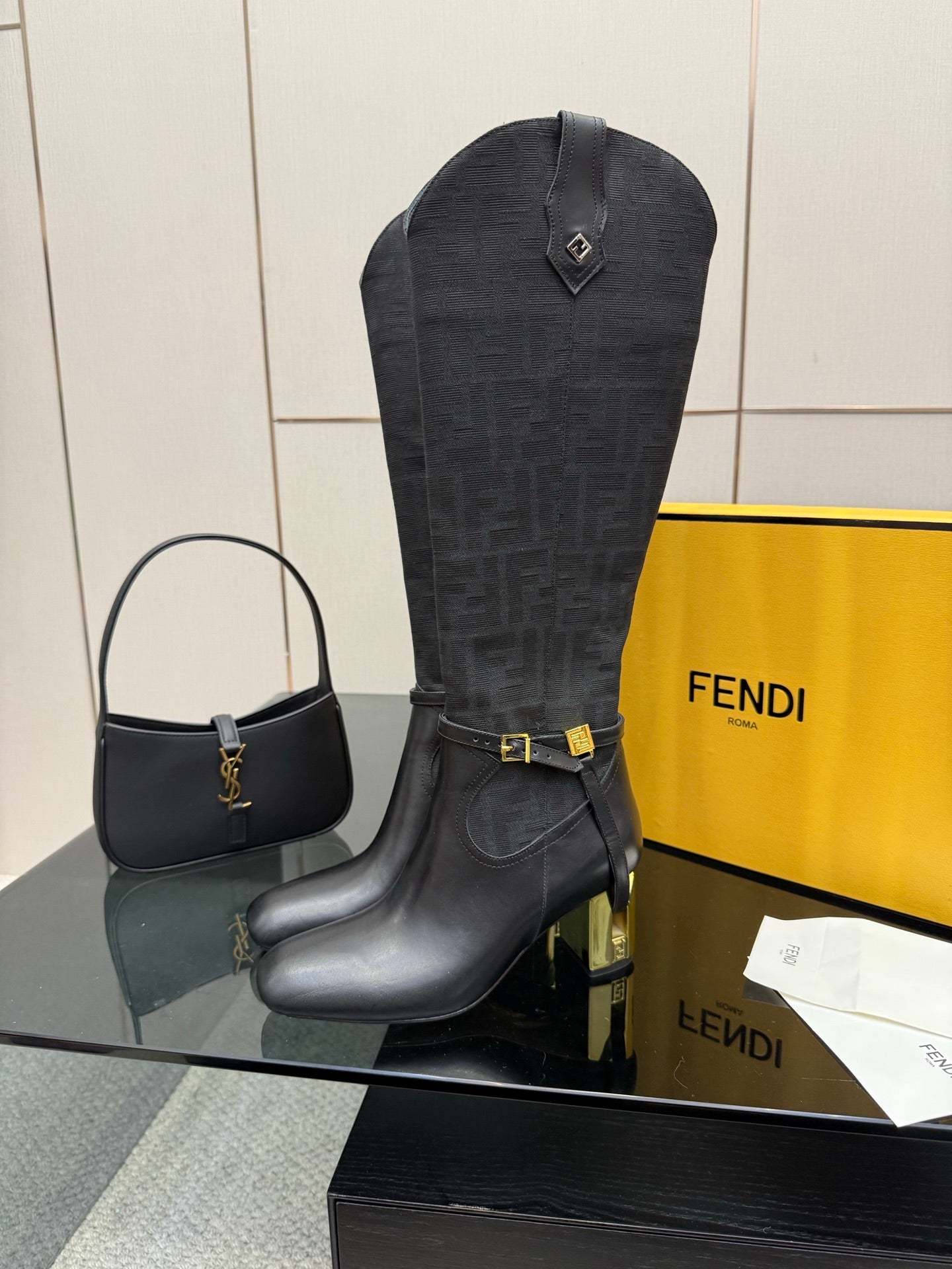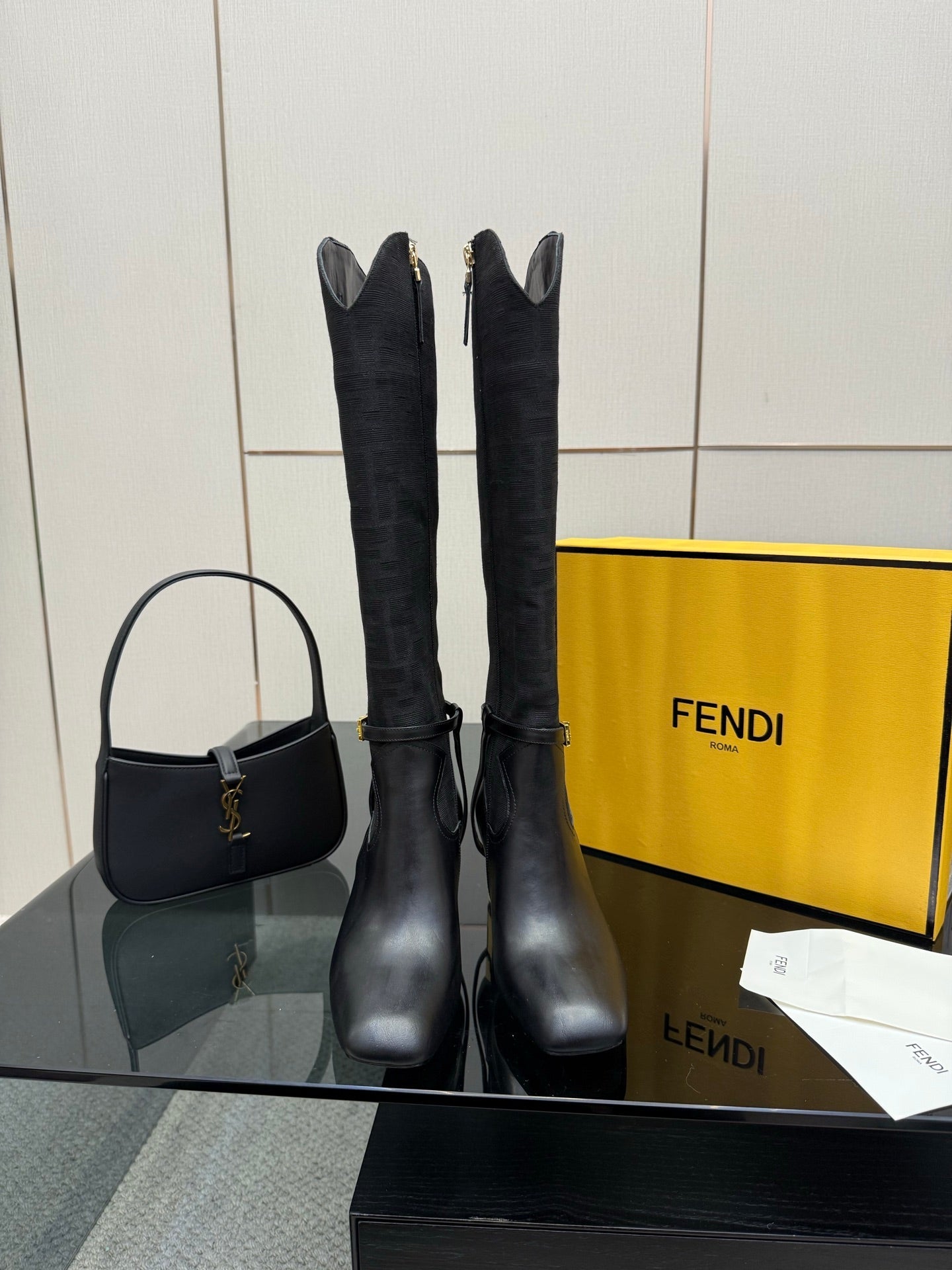 FENDI 25SKNEE-HIGH BOOTS 50 MM IN BLACK CALFSKIN AND FABRIC PRINT LOGO