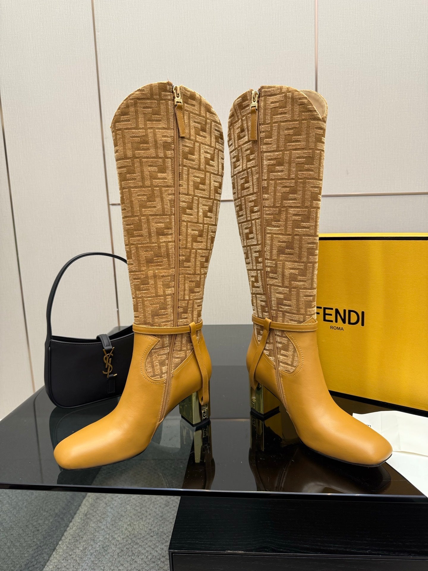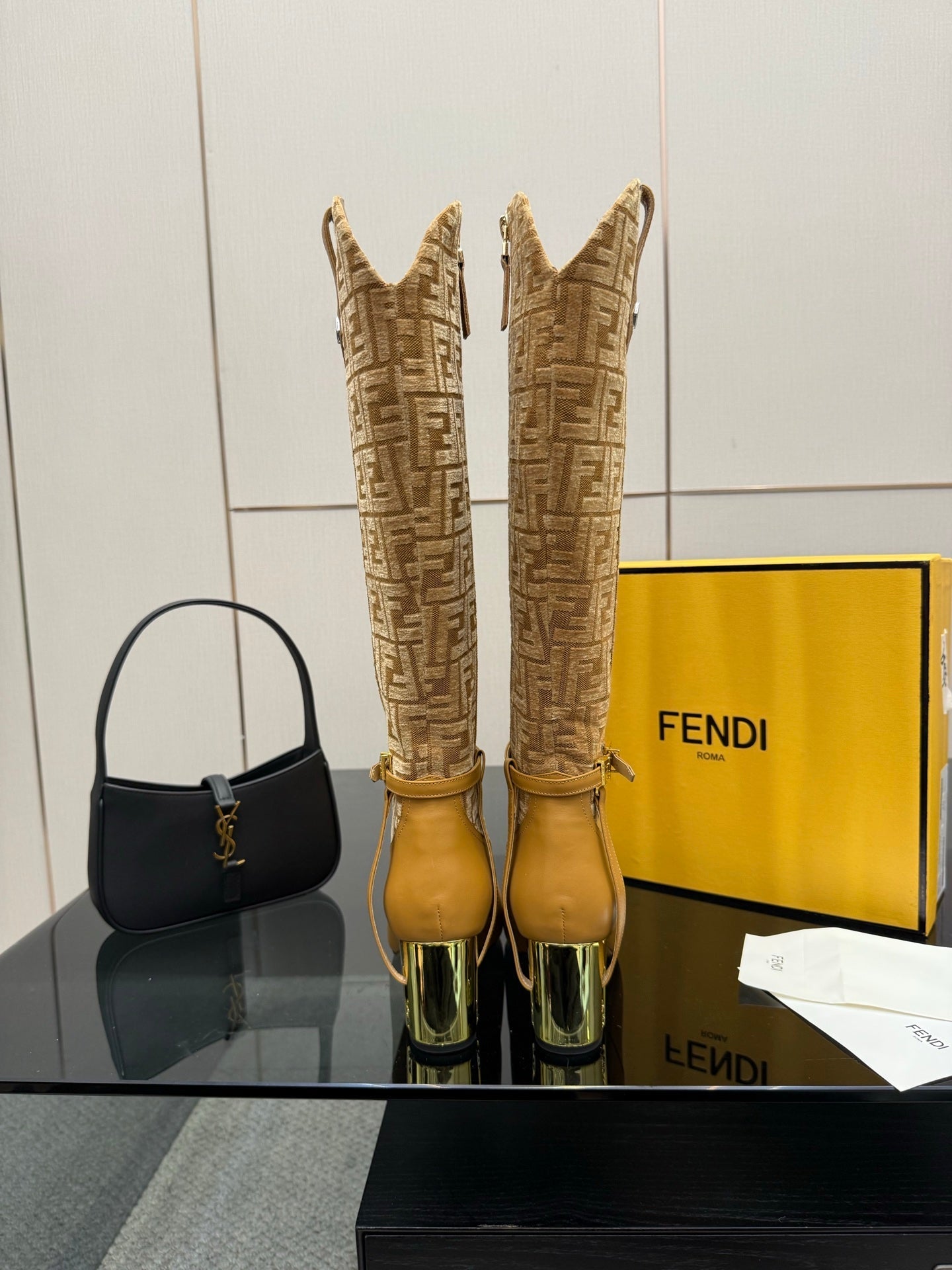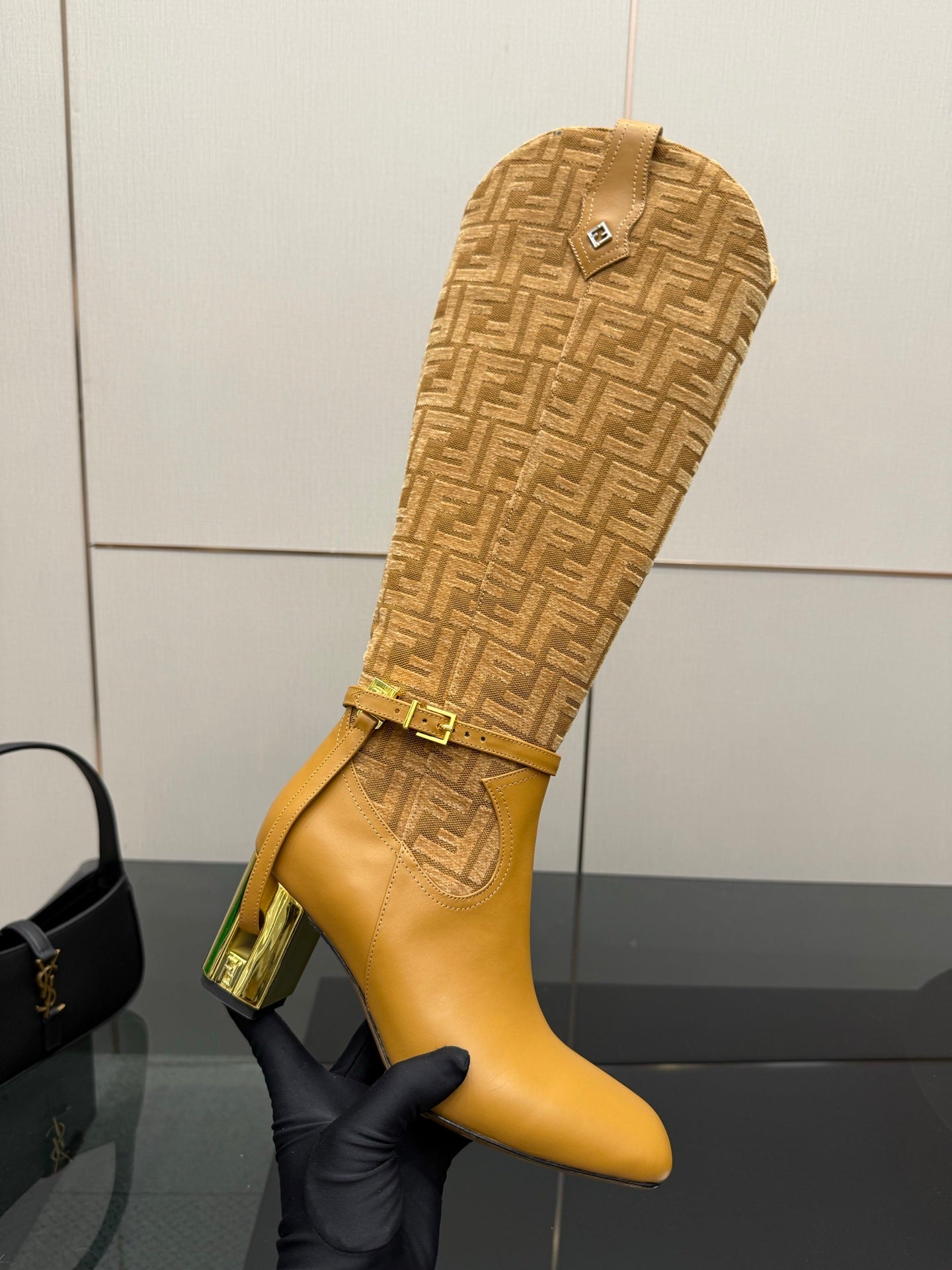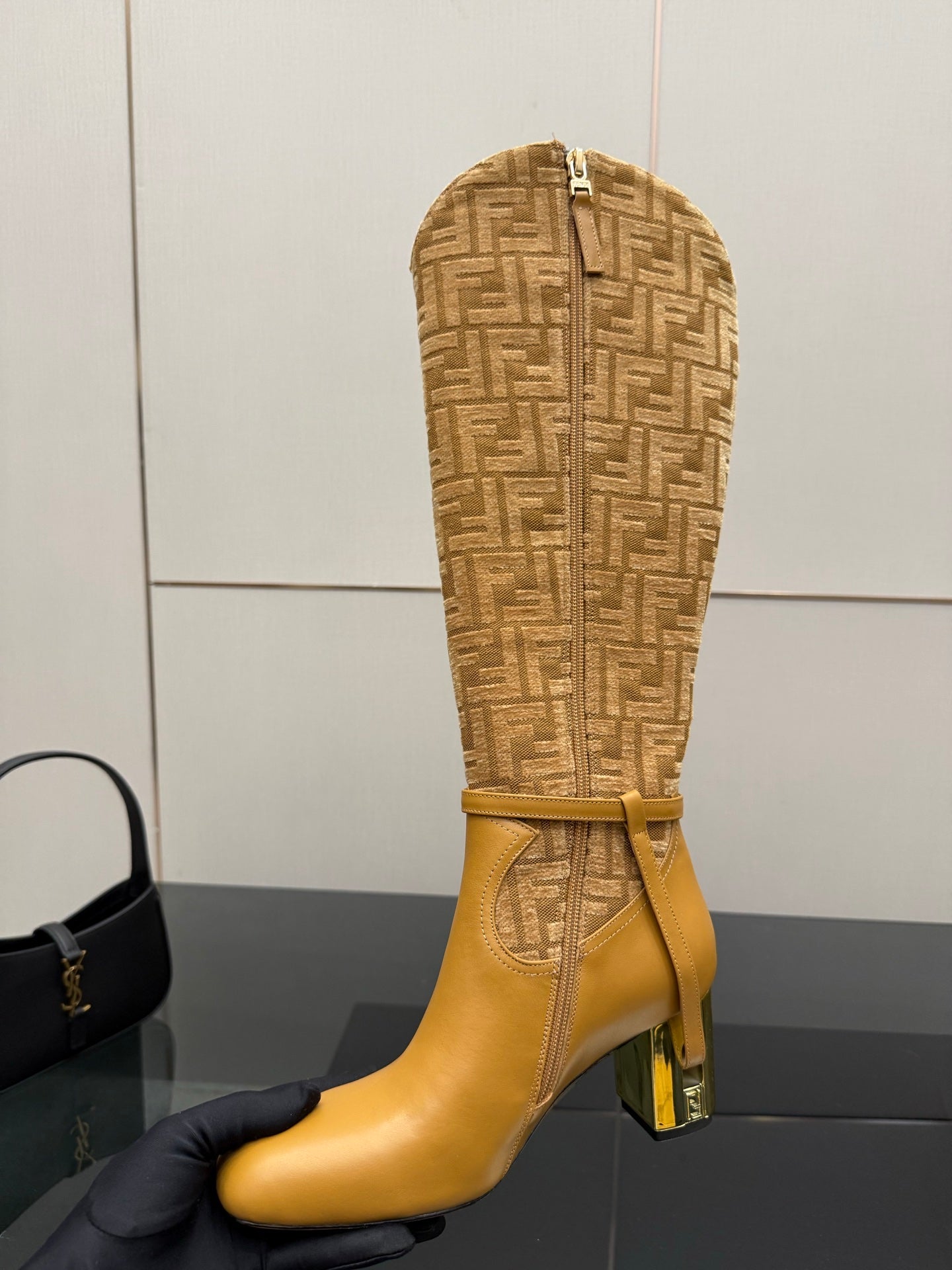 FENDI 25SKNEE-HIGH BOOTS 50 MM IN GOLDEN BROWN CALFSKIN AND FABRIC PRINT LOGO