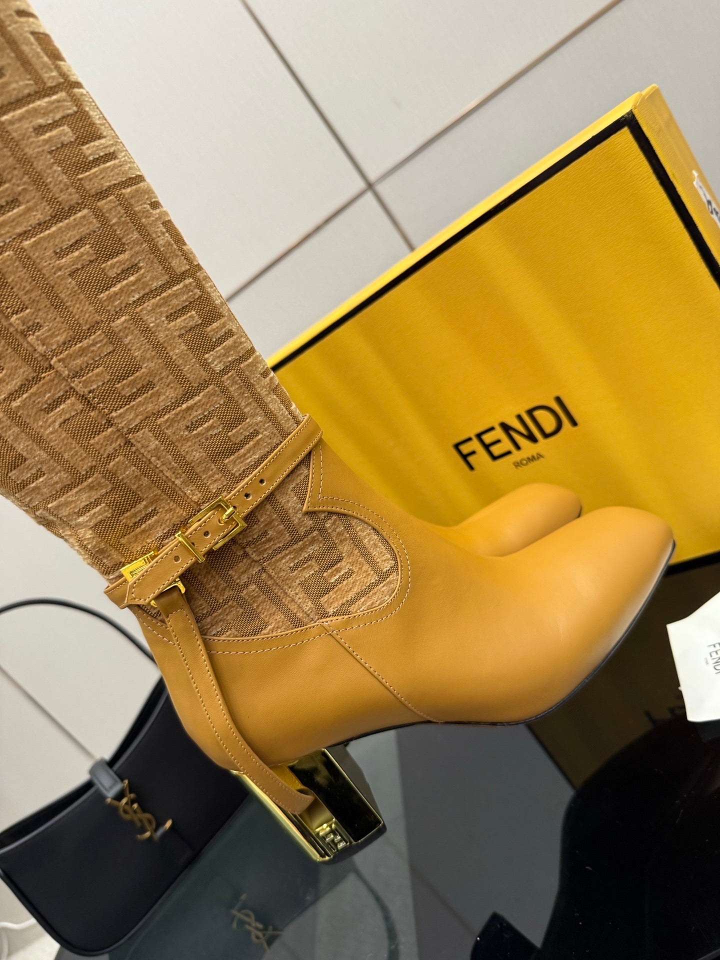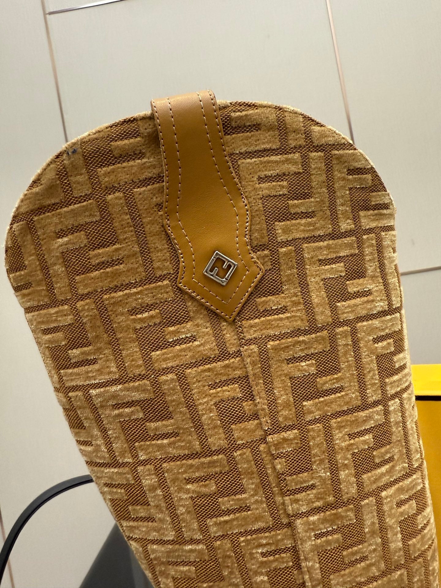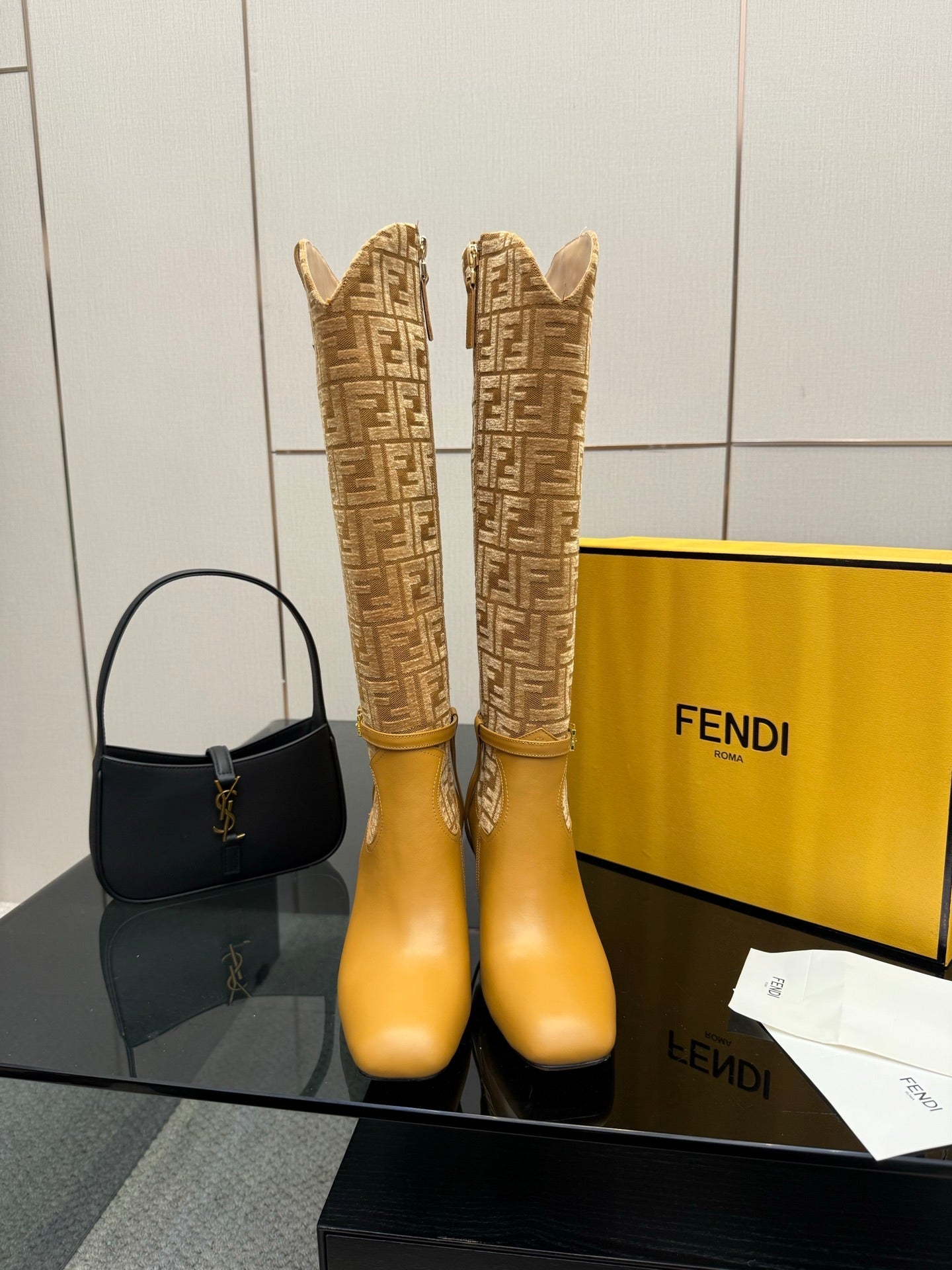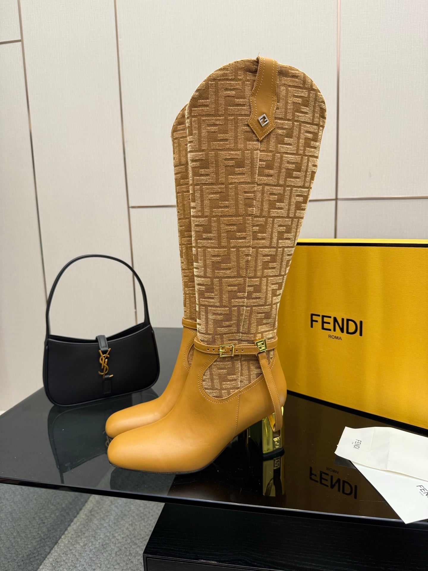 FENDI 25SKNEE-HIGH BOOTS 50 MM IN GOLDEN BROWN CALFSKIN AND FABRIC PRINT LOGO