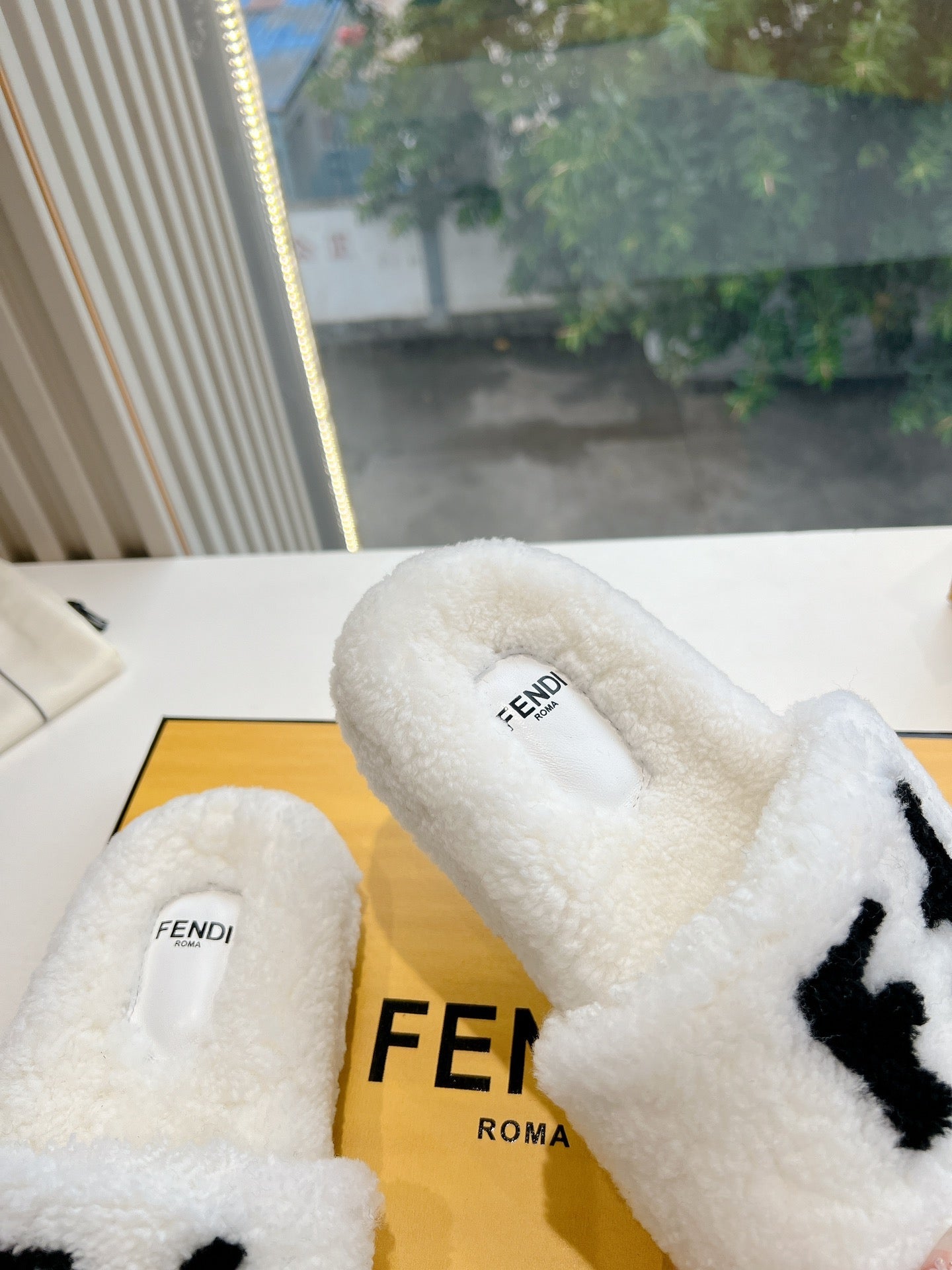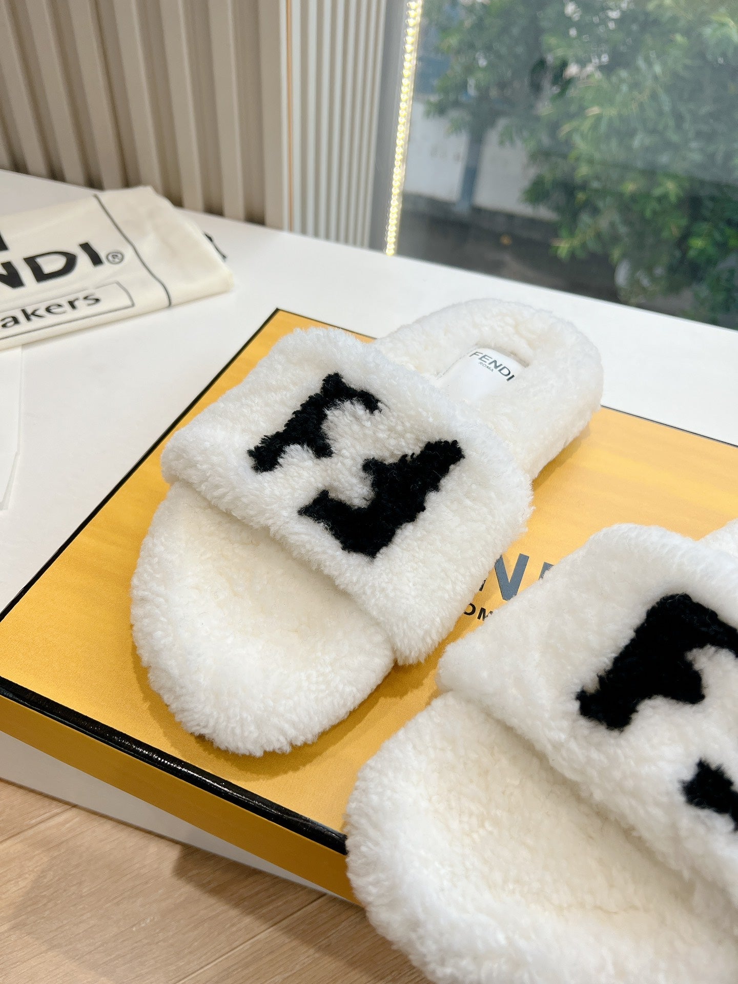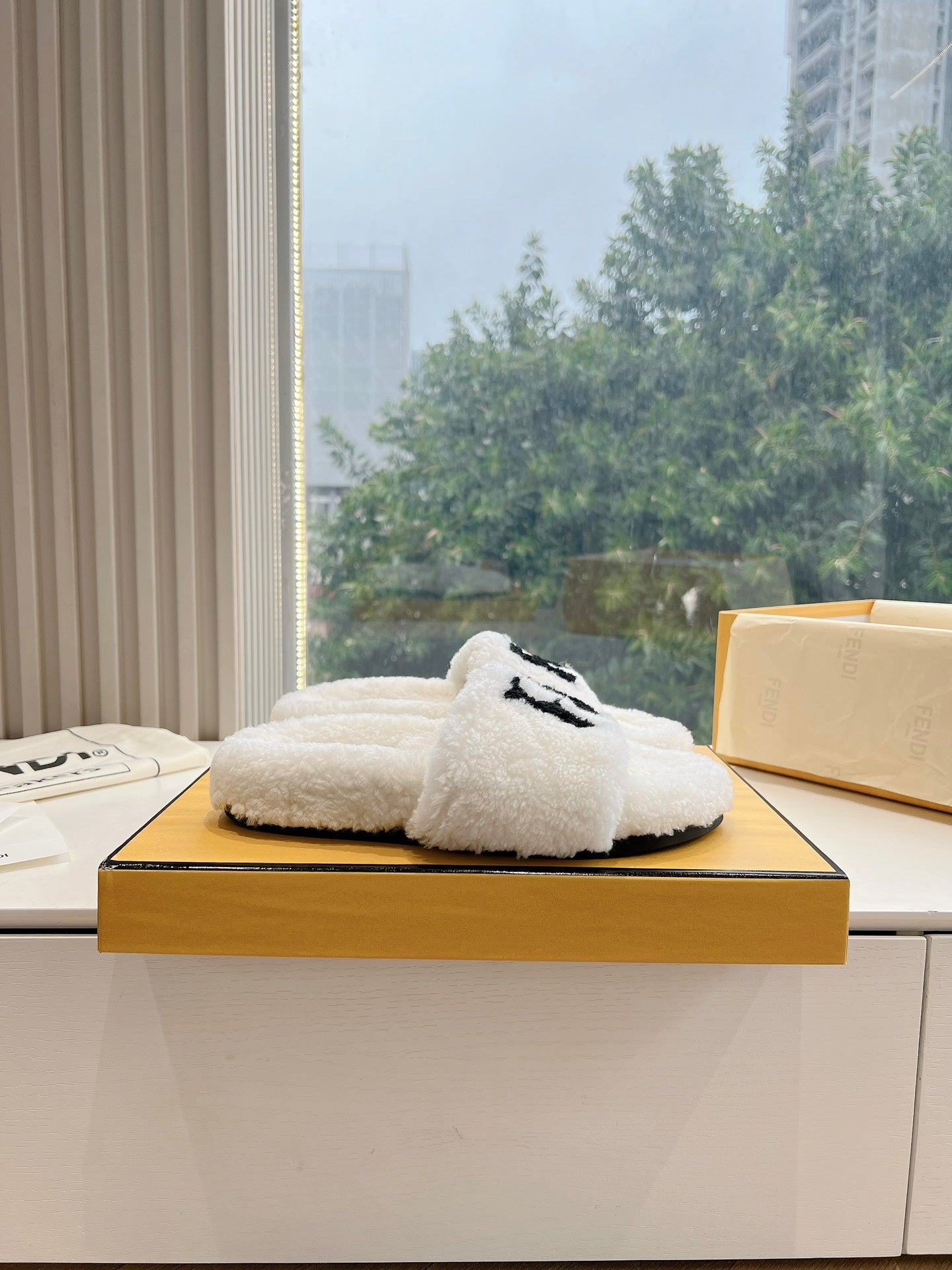 FLAT SLIDE IN WHITE FLEECE WITH BLACK LOGO