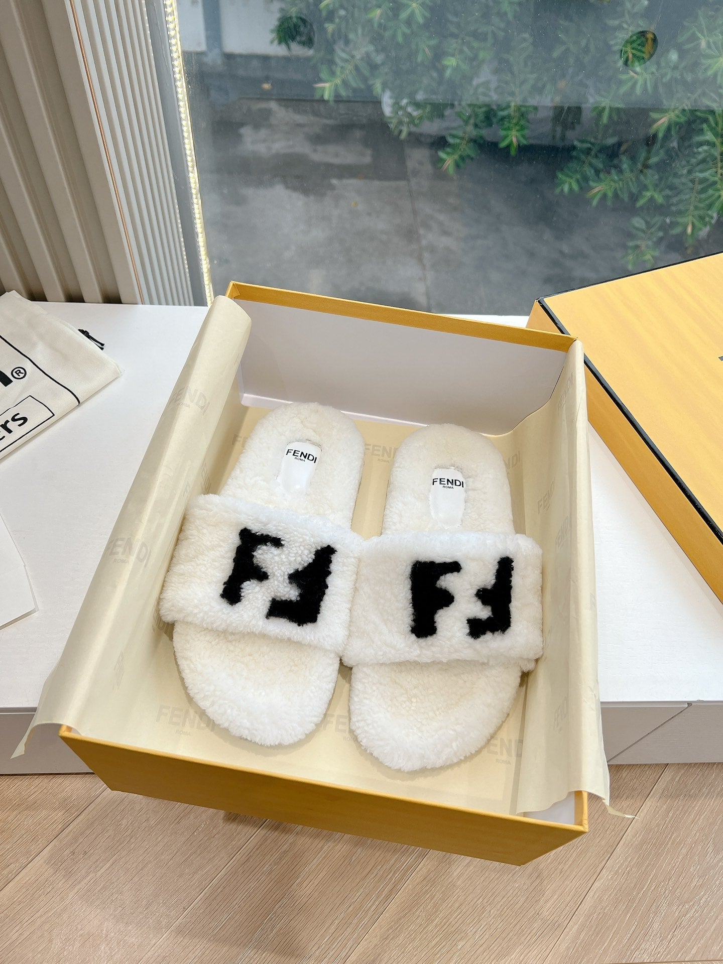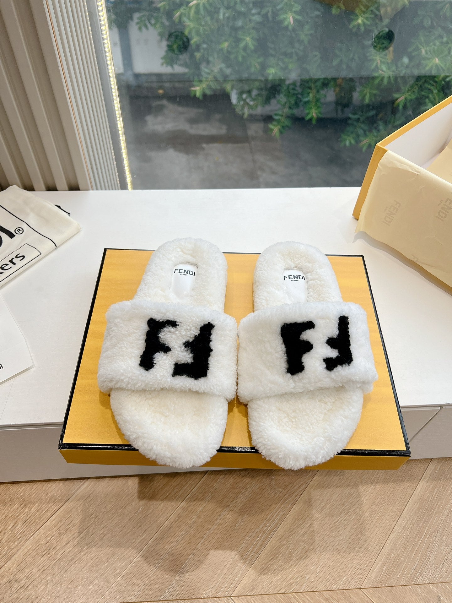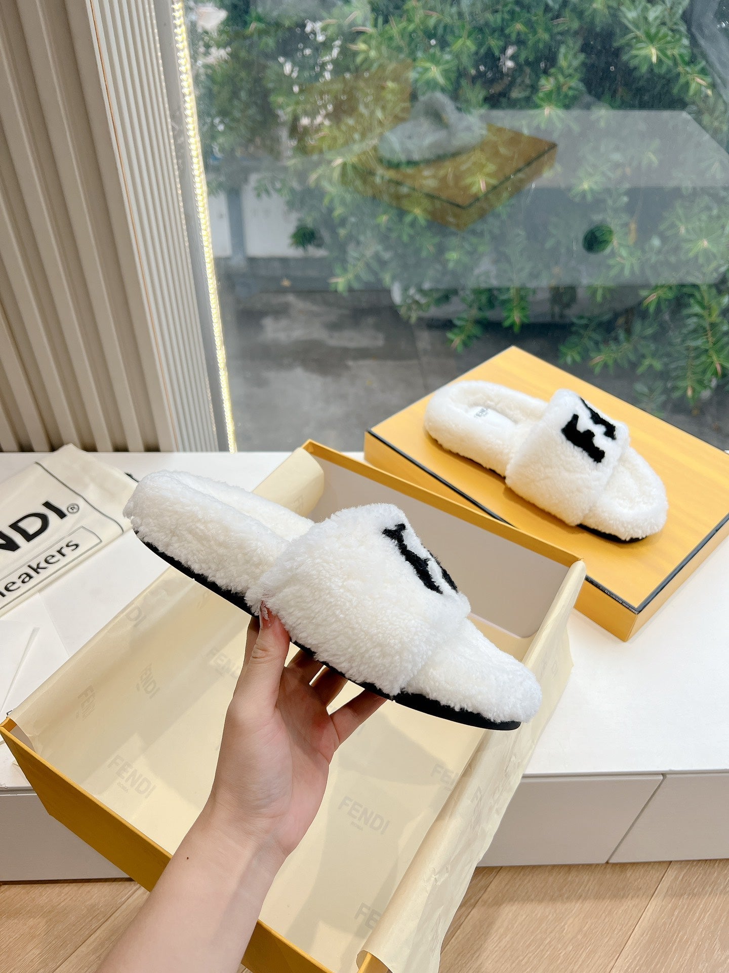 FLAT SLIDE IN WHITE FLEECE WITH BLACK LOGO