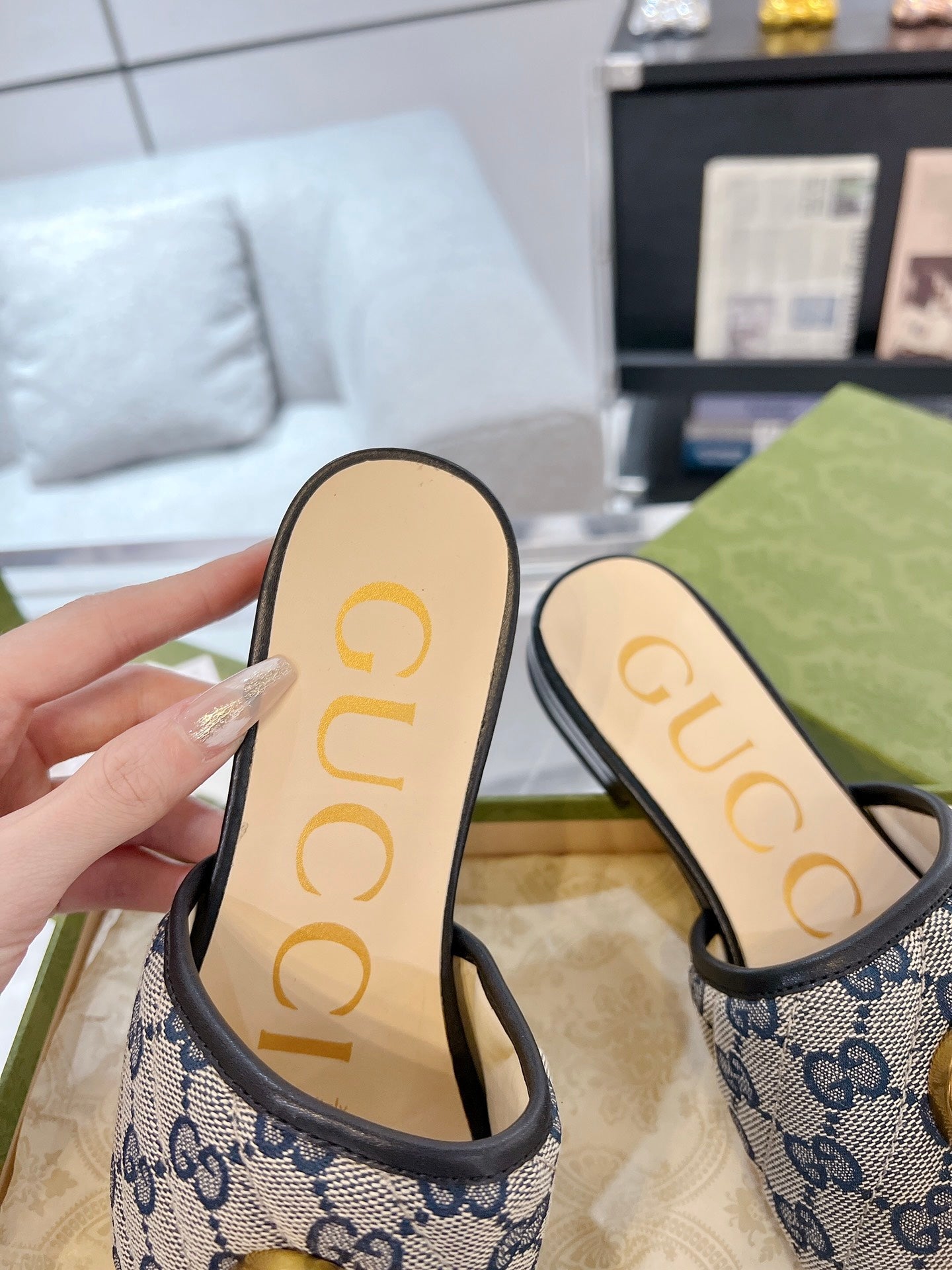 GG EXCLUSIVE SLIDE SANDAL BLACK AND CHARCOAL FABRIC