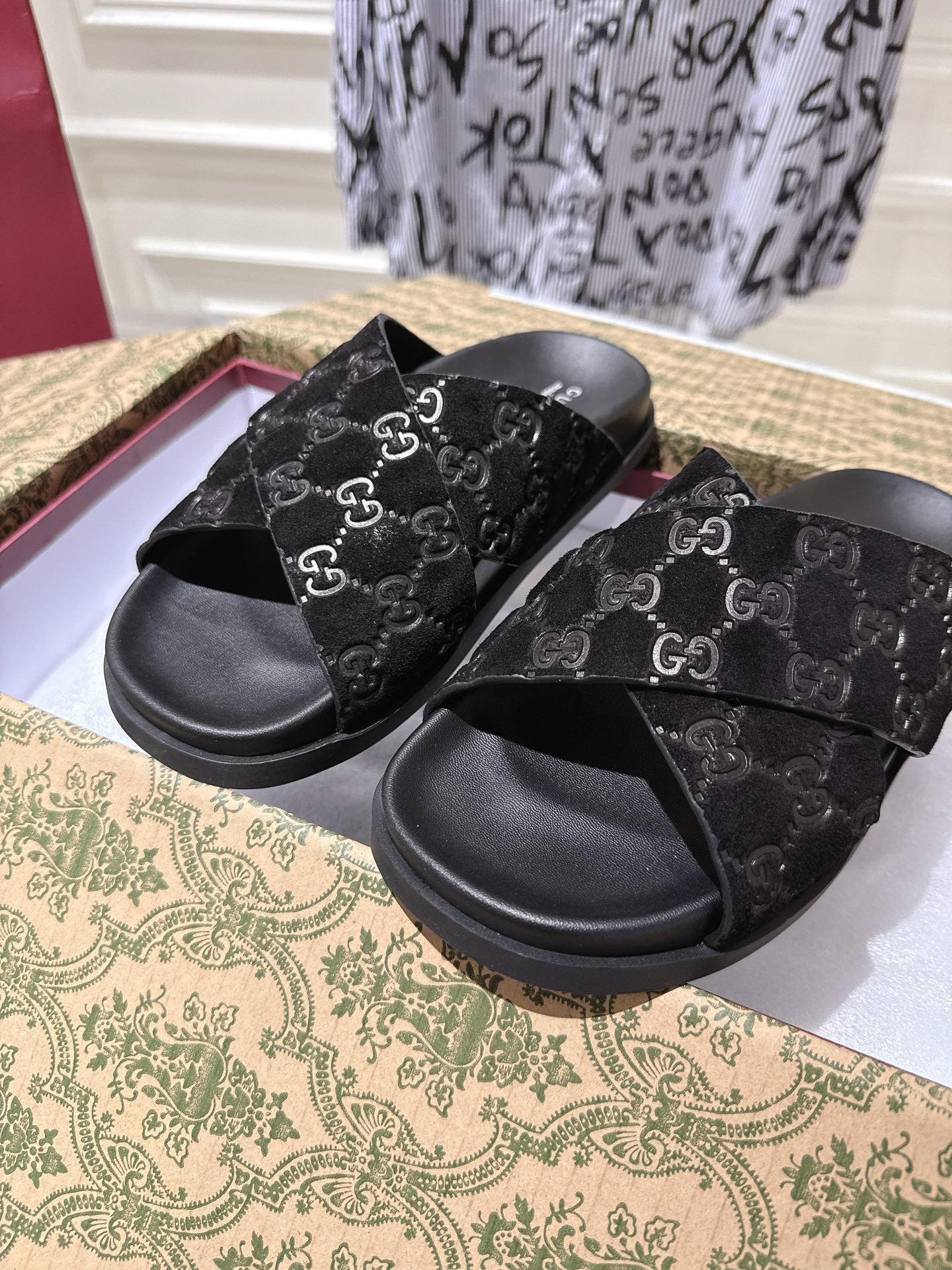 GG SLIDES IN BLACK SUEDE WITH EMBOSSED LOGO STYLE 6