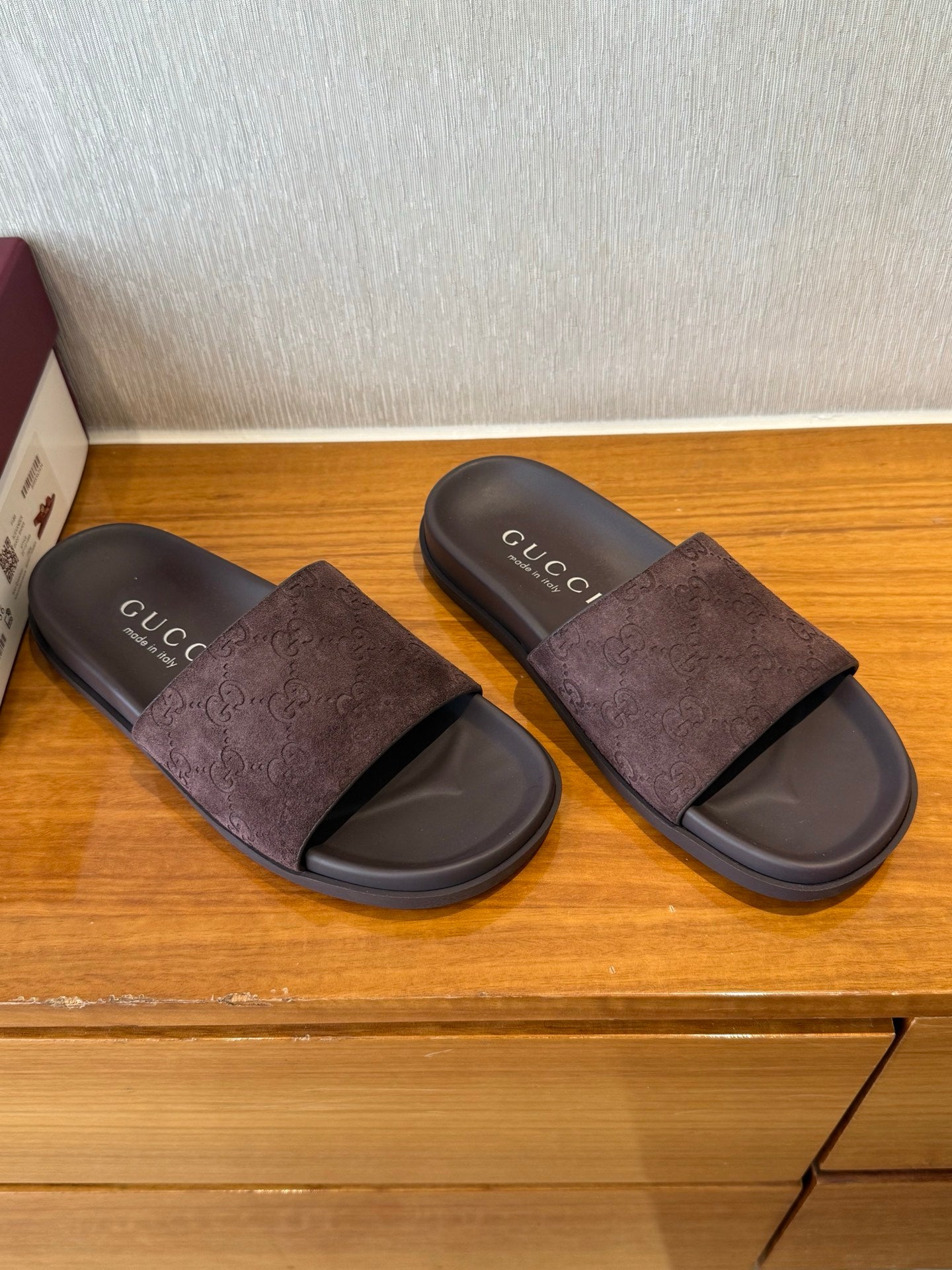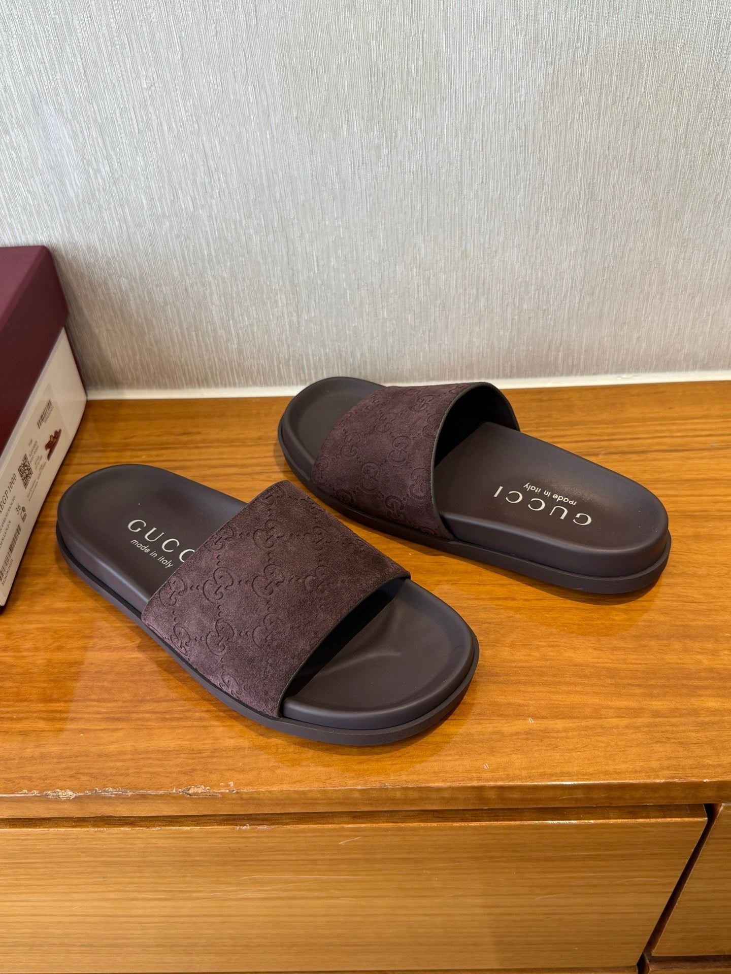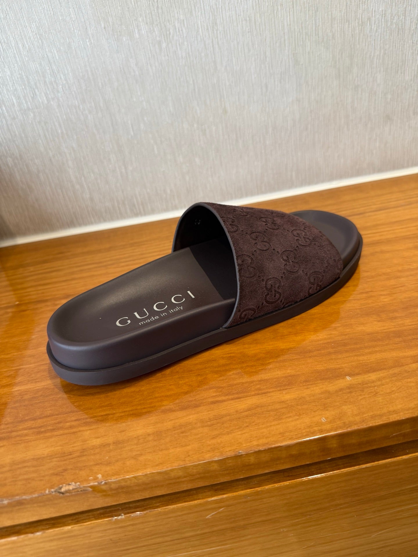 GG SLIDES IN DARK BROWN SUEDE WITH EMBOSSED LOGO