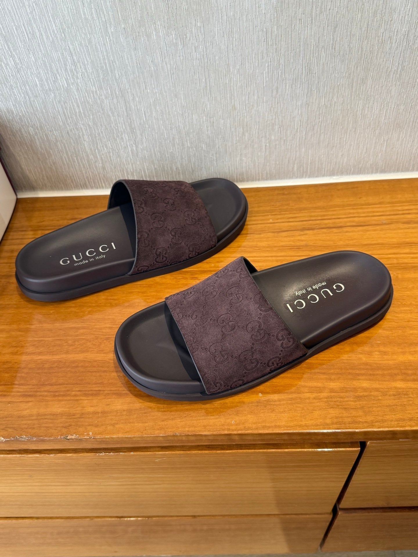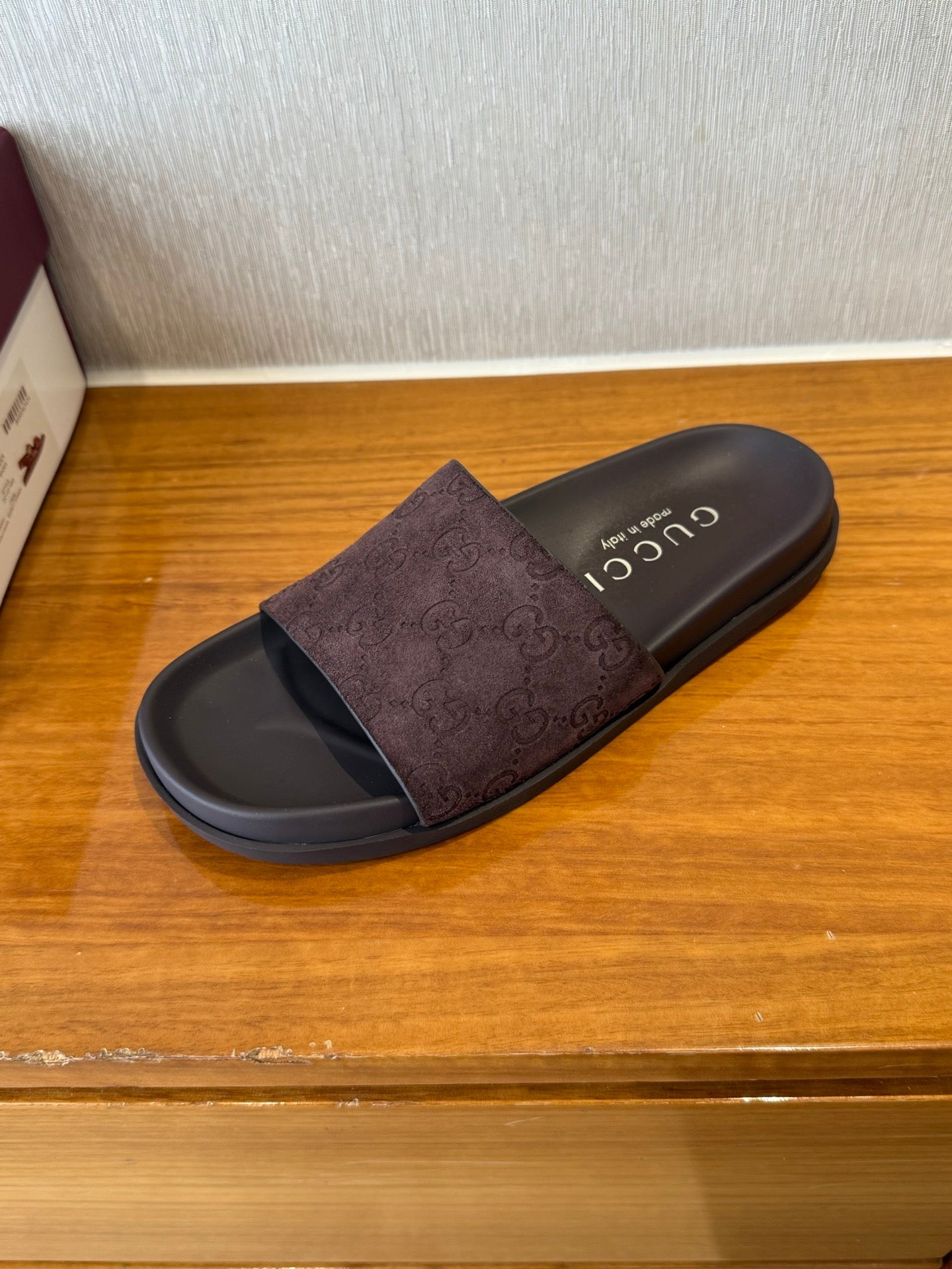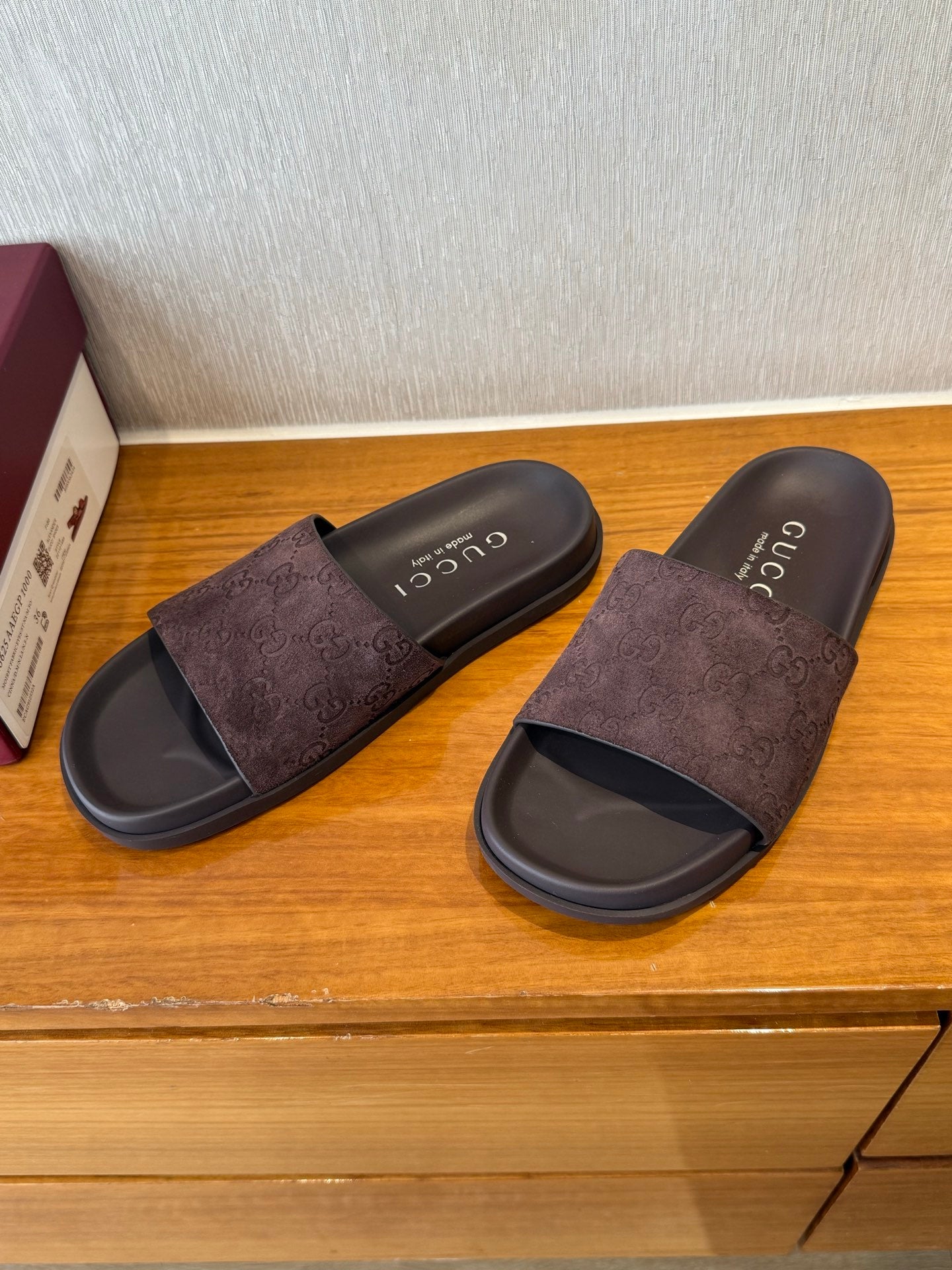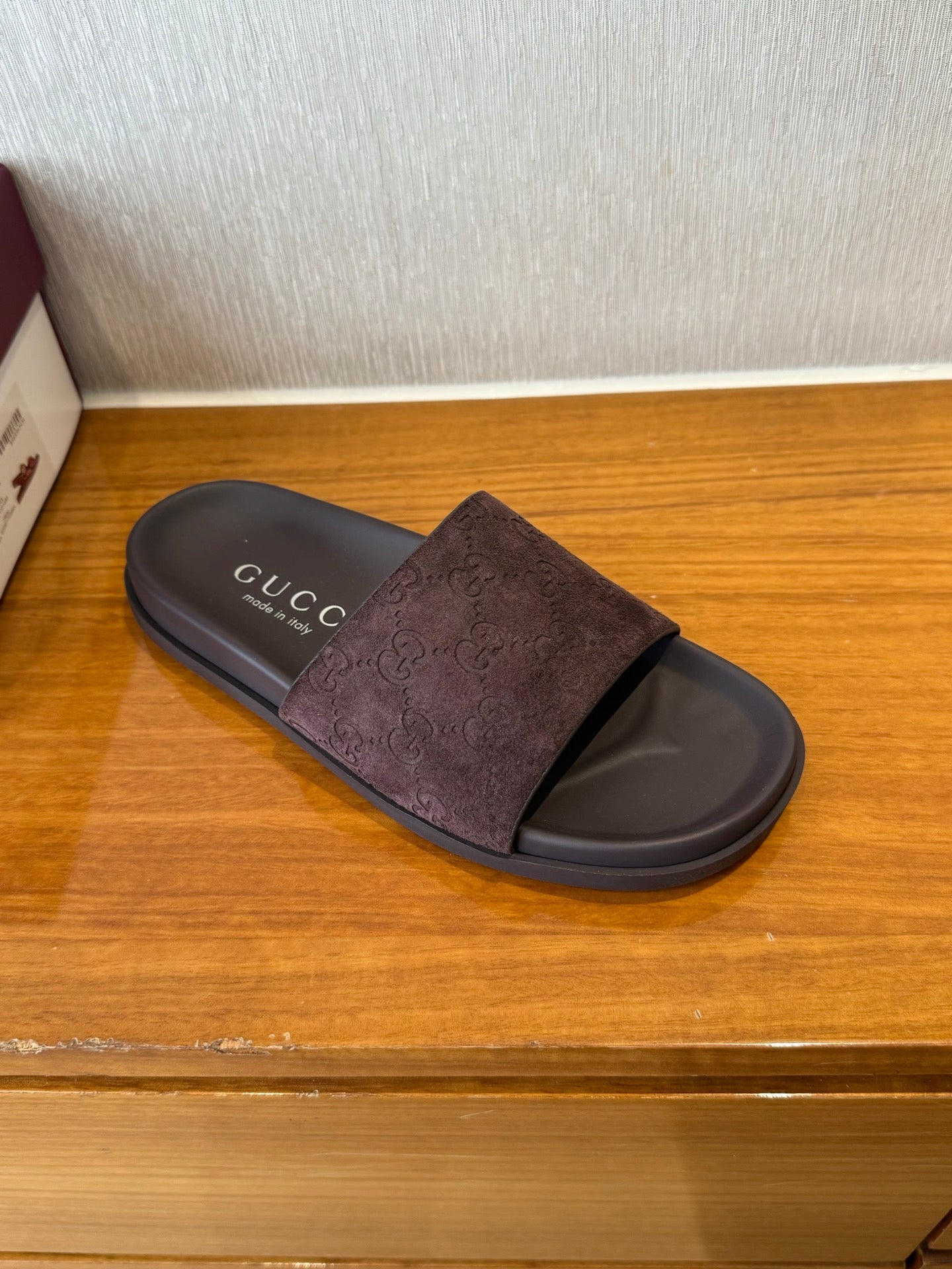 GG SLIDES IN DARK BROWN SUEDE WITH EMBOSSED LOGO