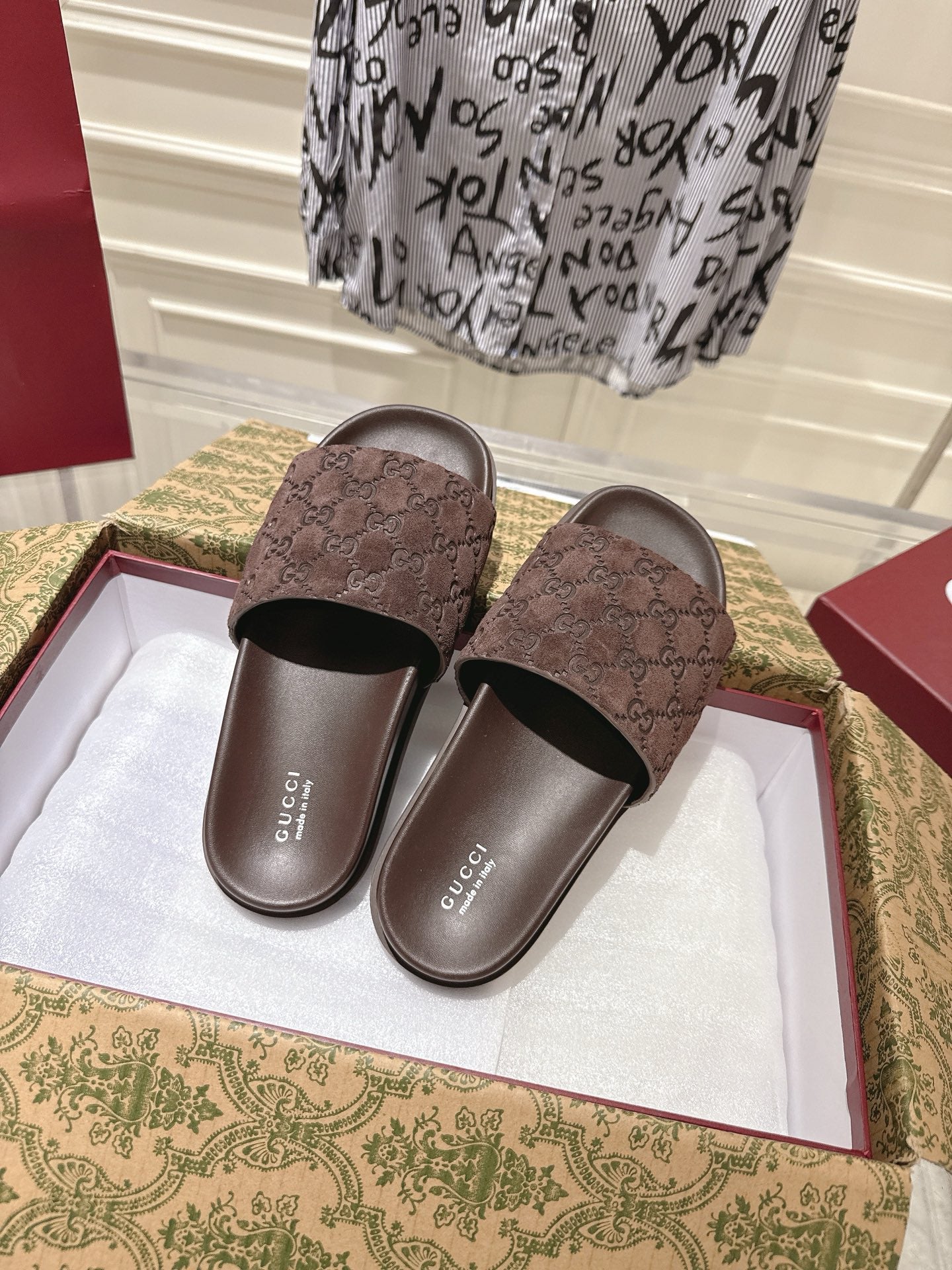 GG SLIDES IN DARK BROWN SUEDE WITH EMBOSSED LOGO STYLE 1