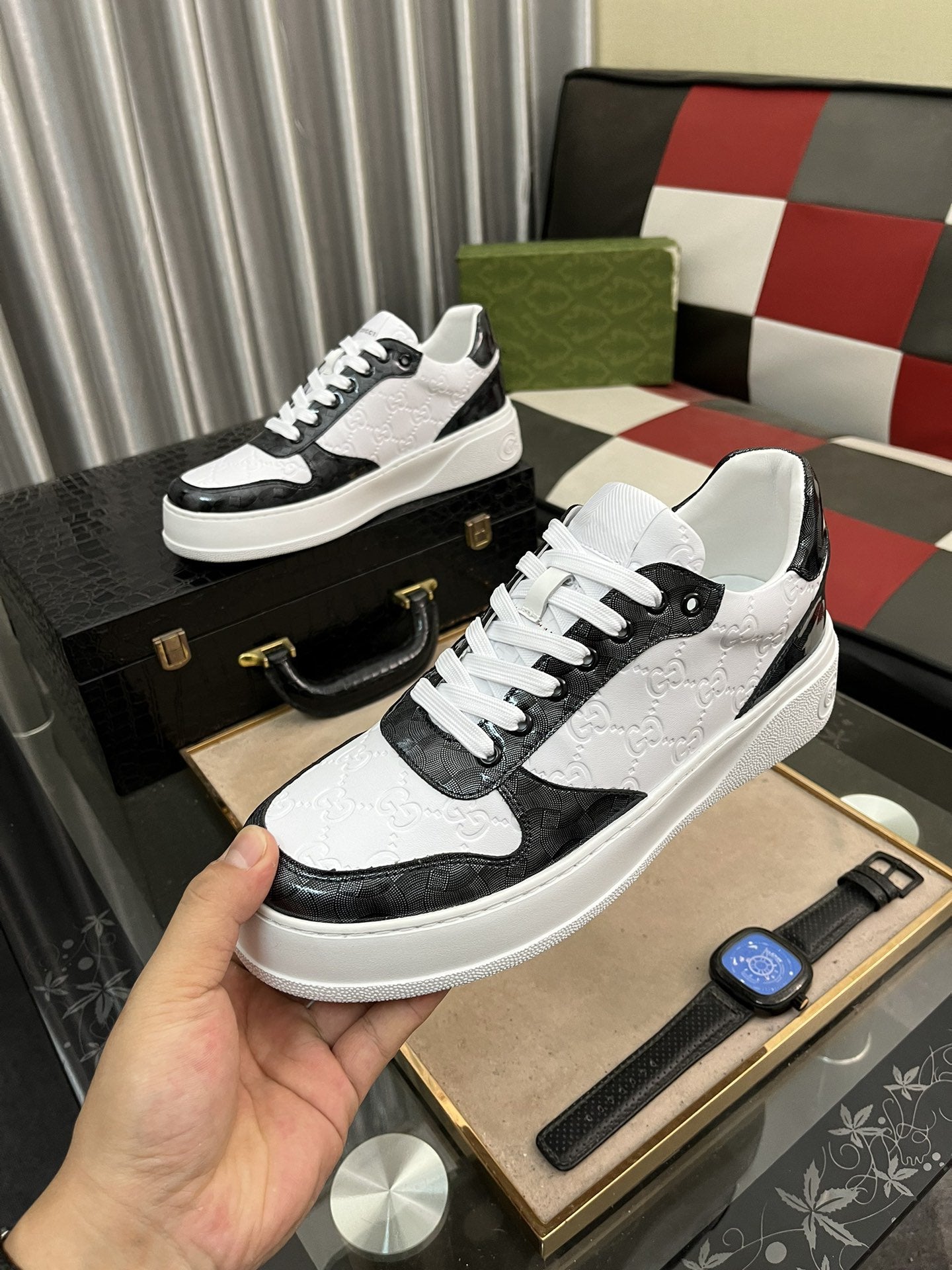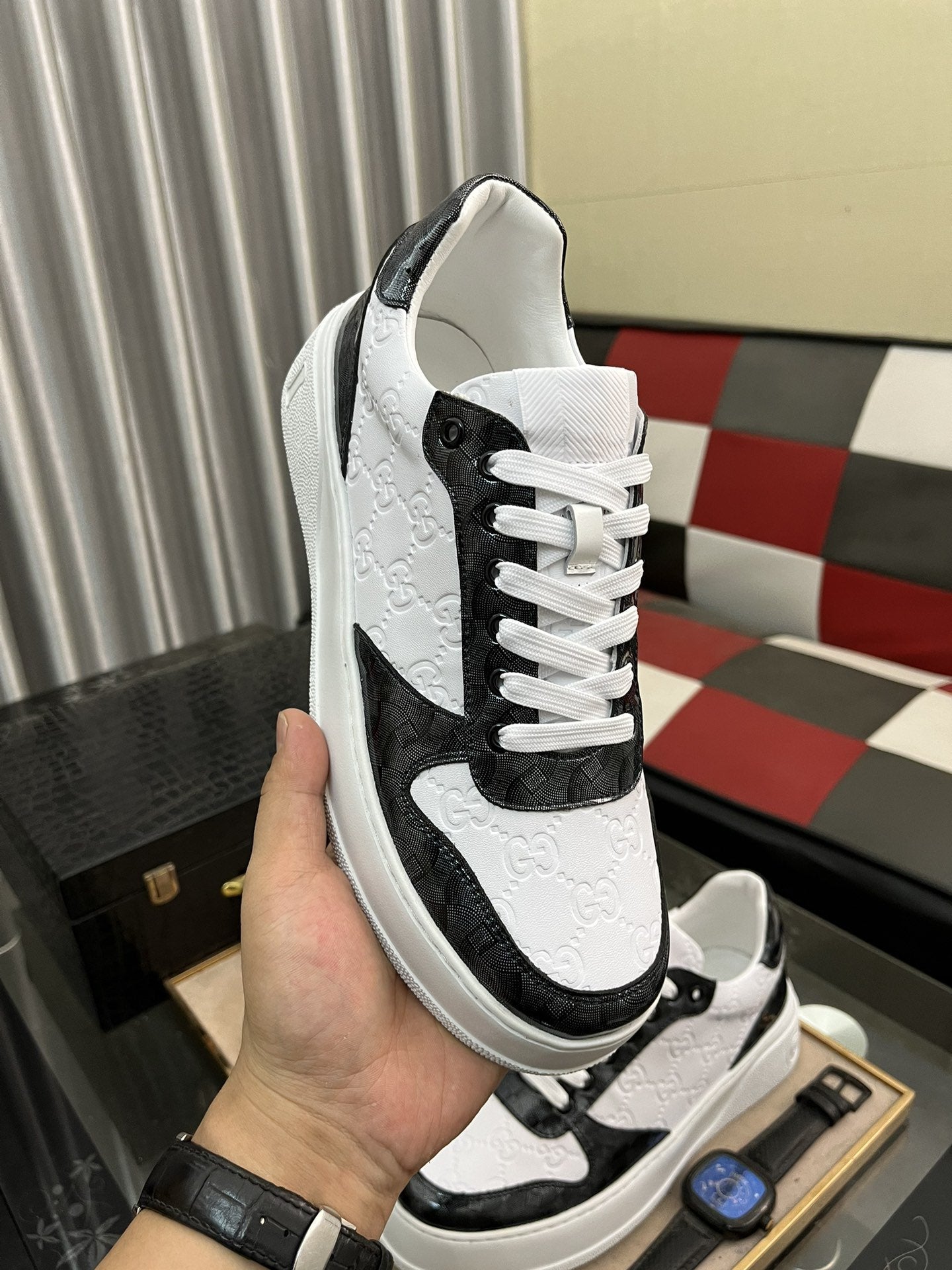 GG SNEAKERS IN EMBOSSED WHITE BLACK COWHIDE LEATHER