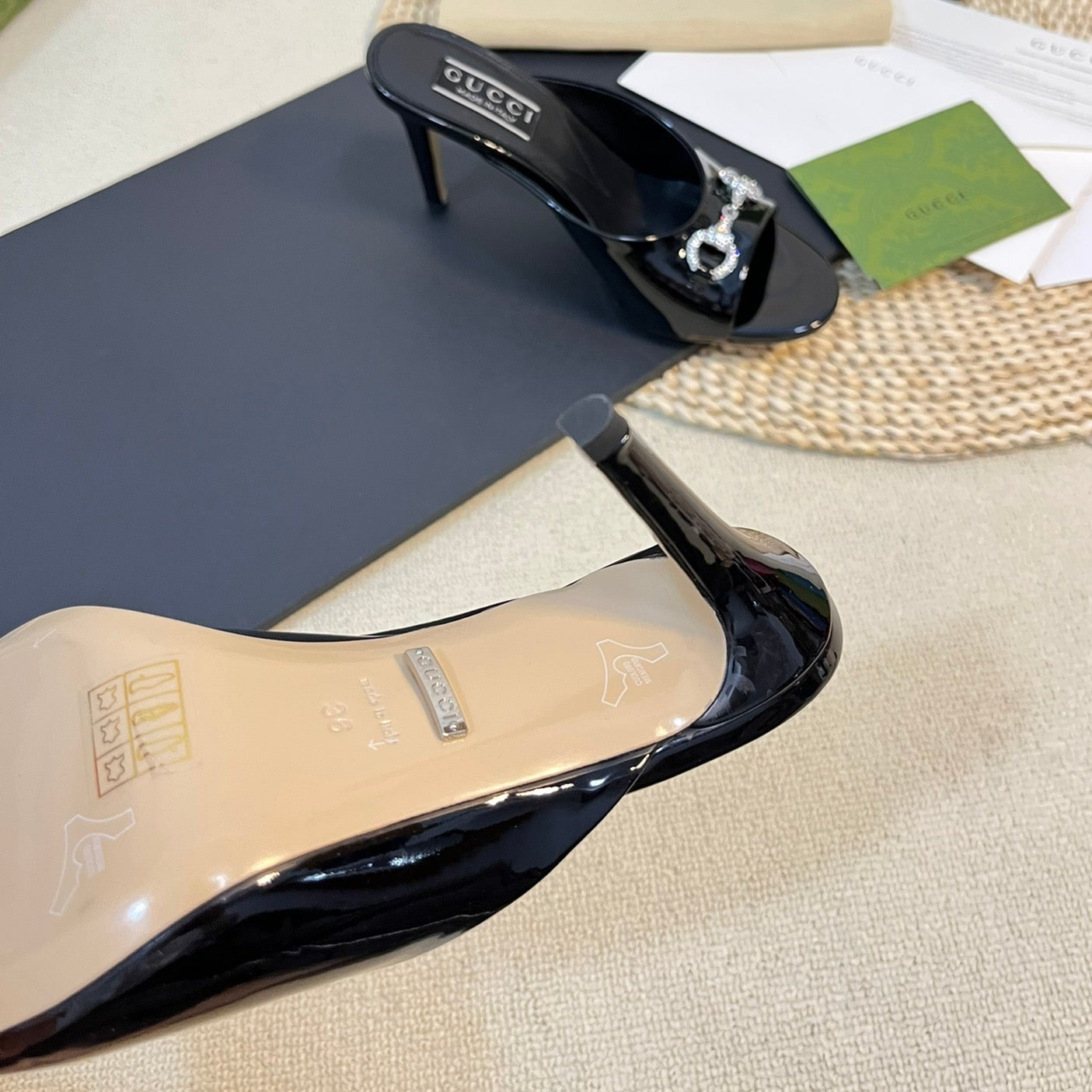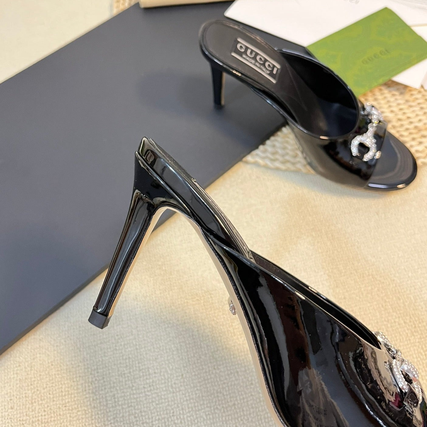 GG Women's Horsebit mid-heel slide sandal in glossy black leather