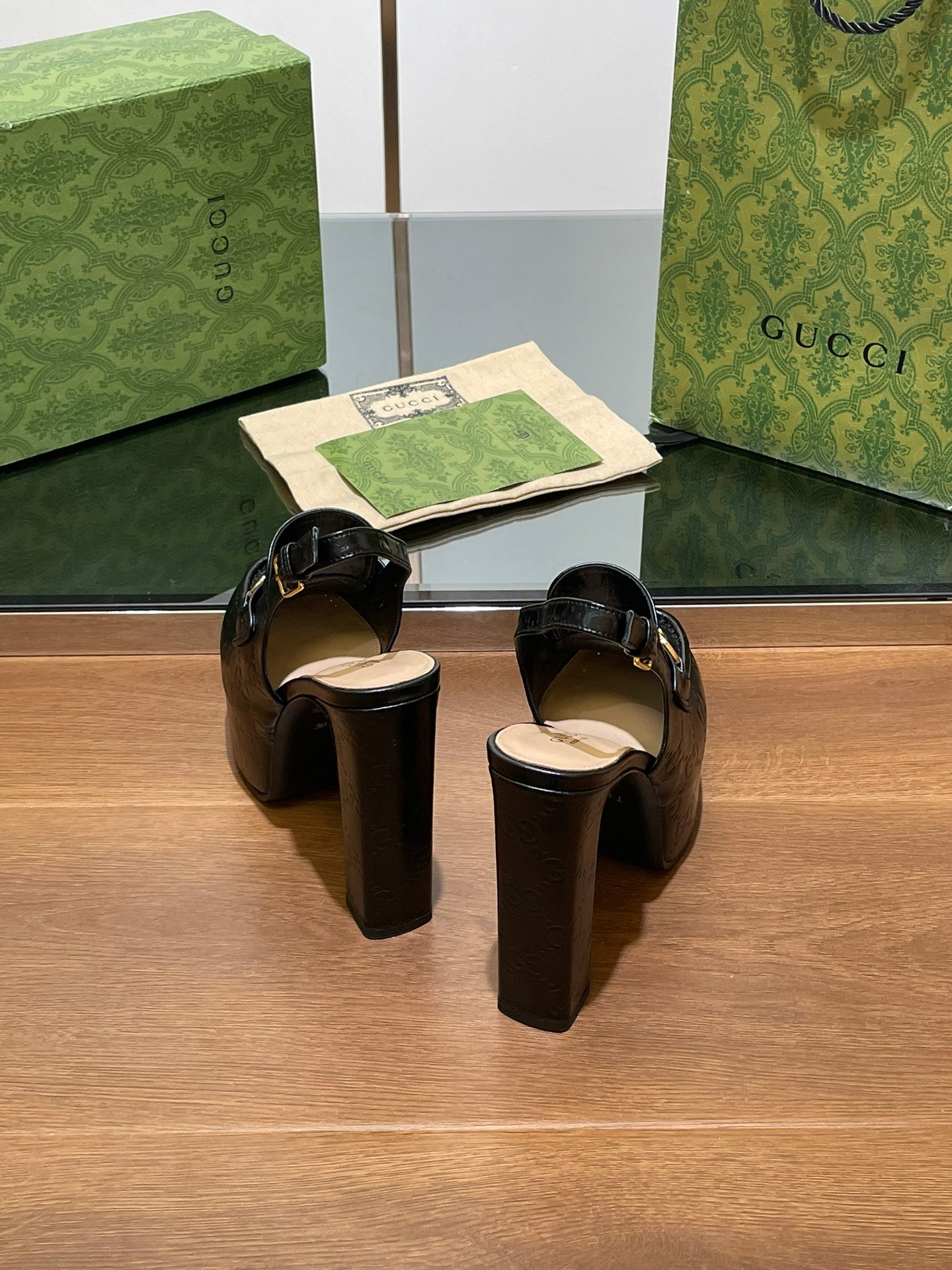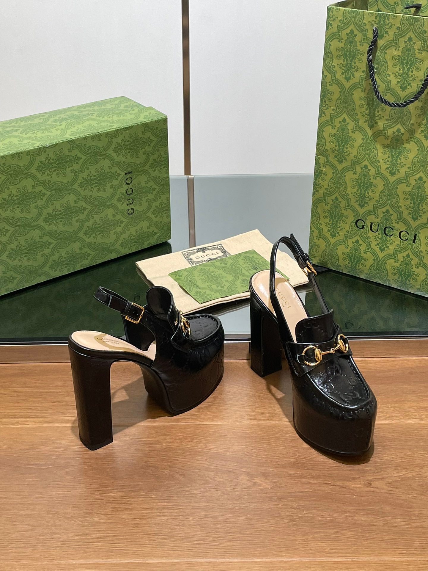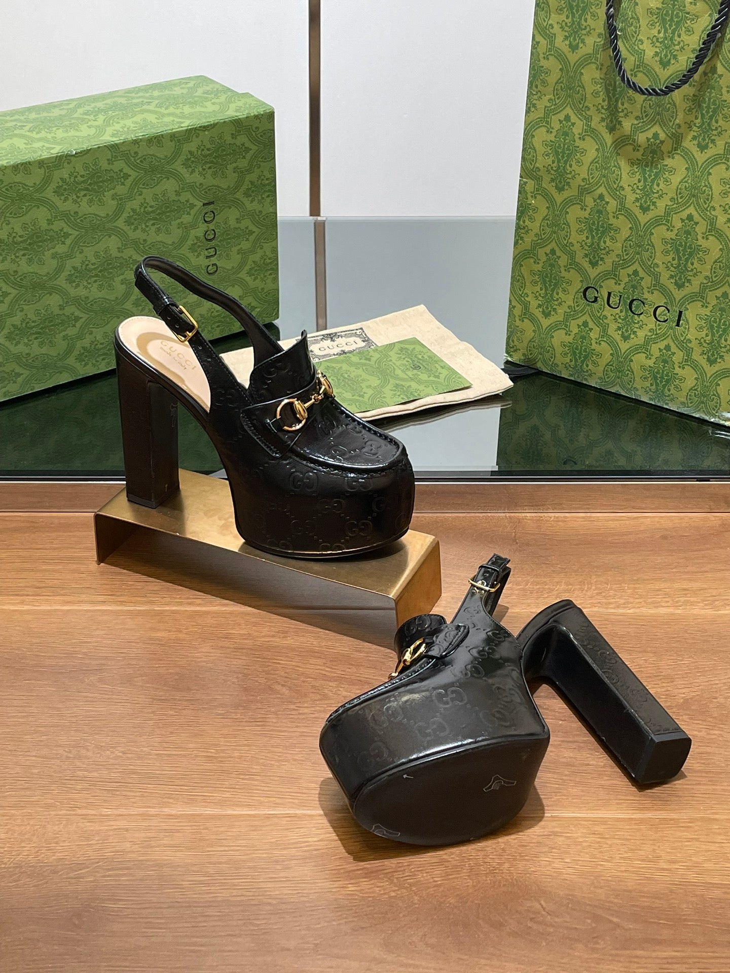 GG WOMEN'S HORSEBIT PLATFORM LOAFER SLINGBACK IN BLACK EMBOSSED CALFSKIN