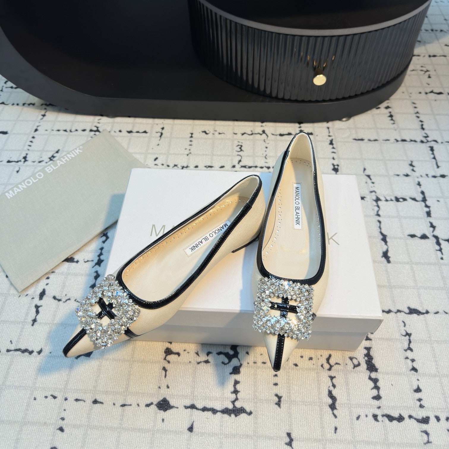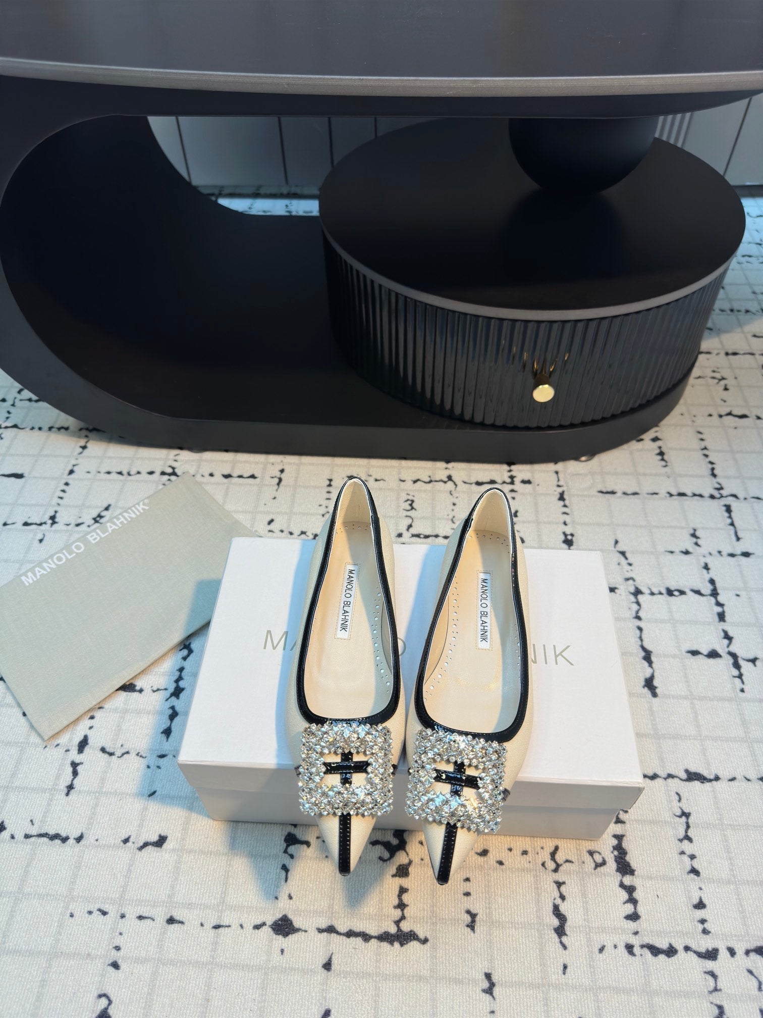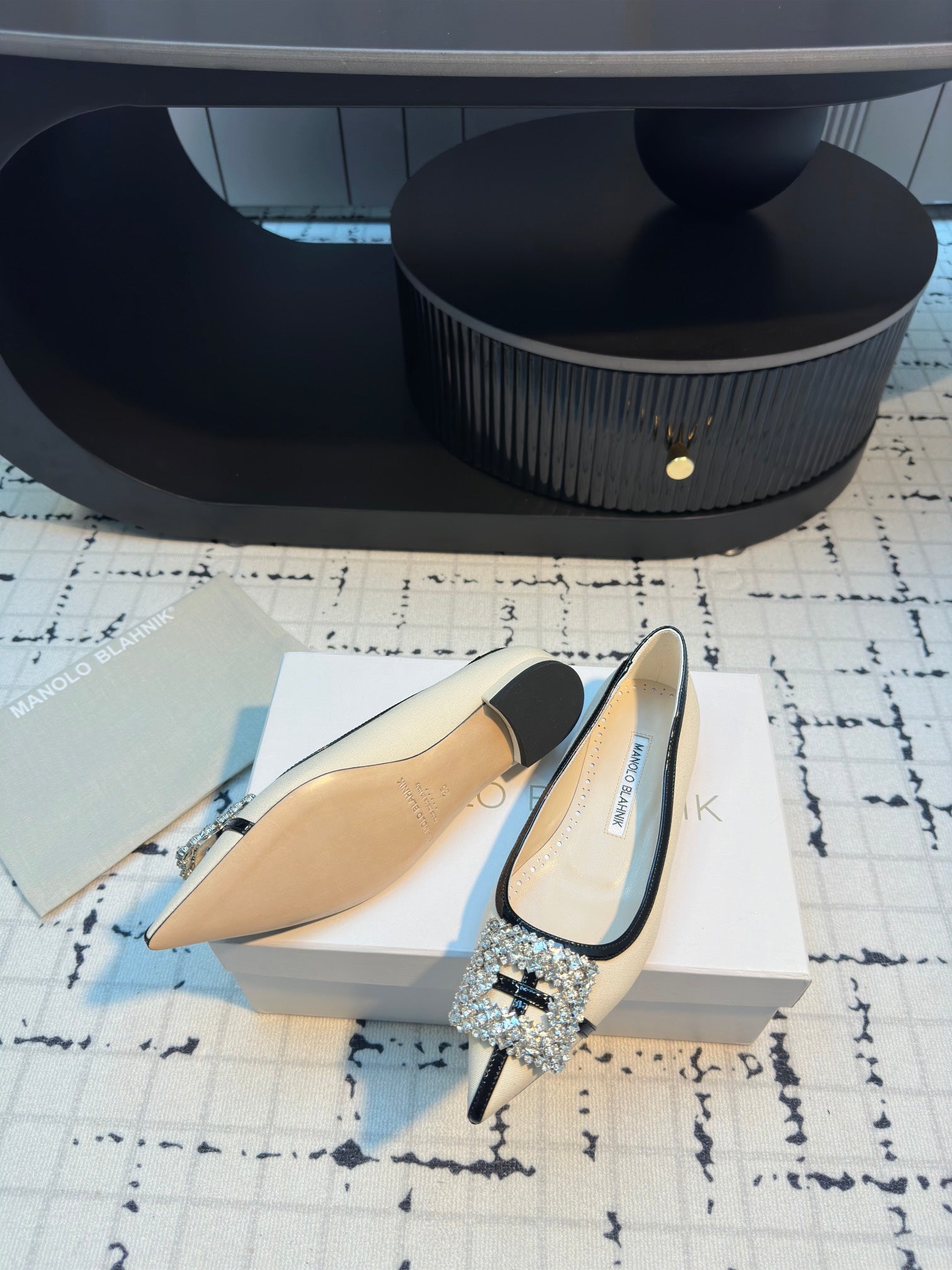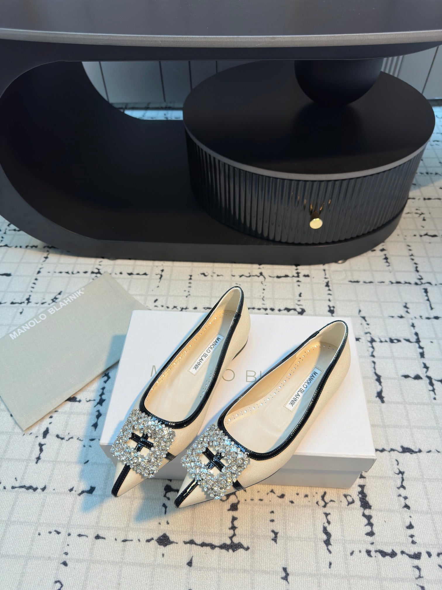 Hangisi 10mm Ballet Flat Beige Linen with Black Leather Jewel Buckle 161064