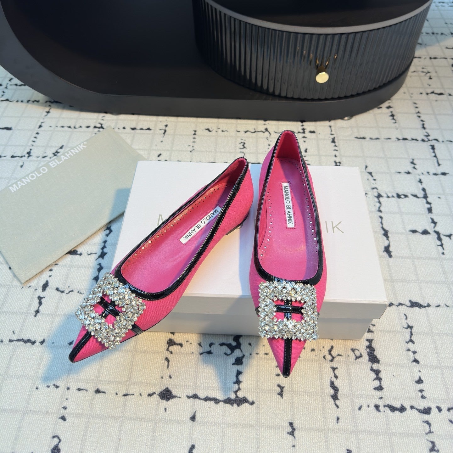 Hangisi 10mm Ballet Flat Dark Pink Linen with Black Leather Jewel Buckle 161065